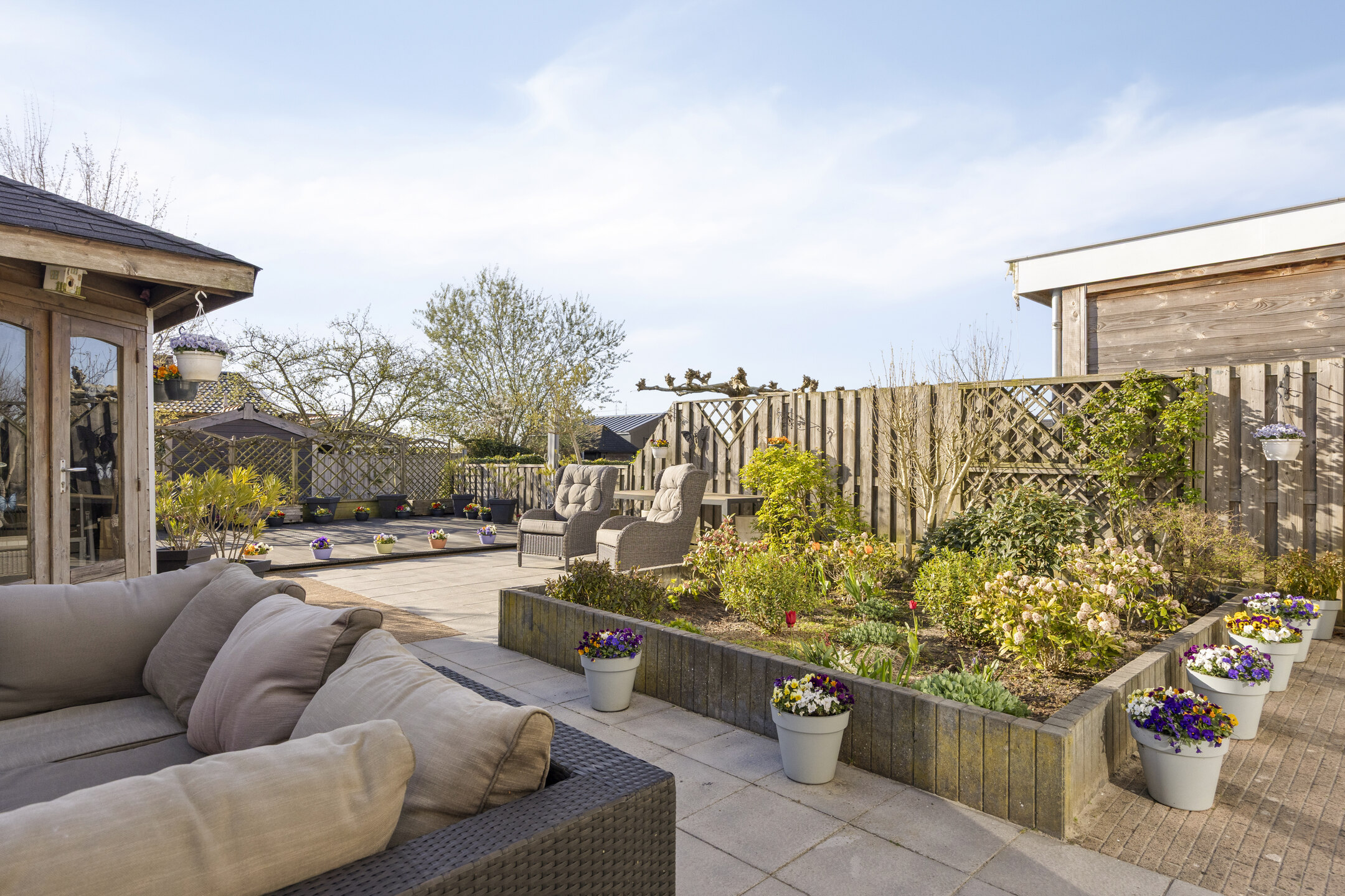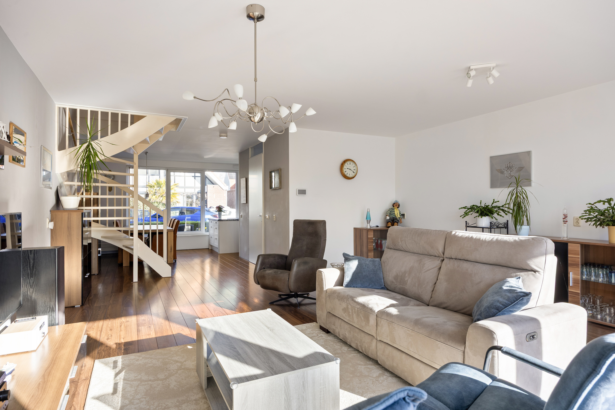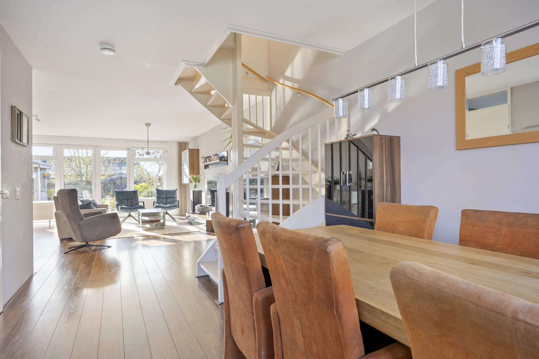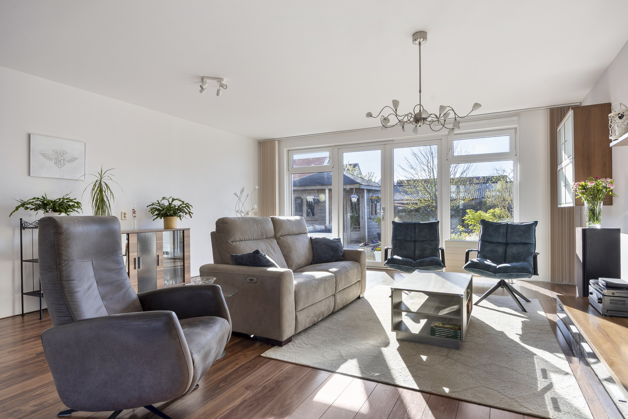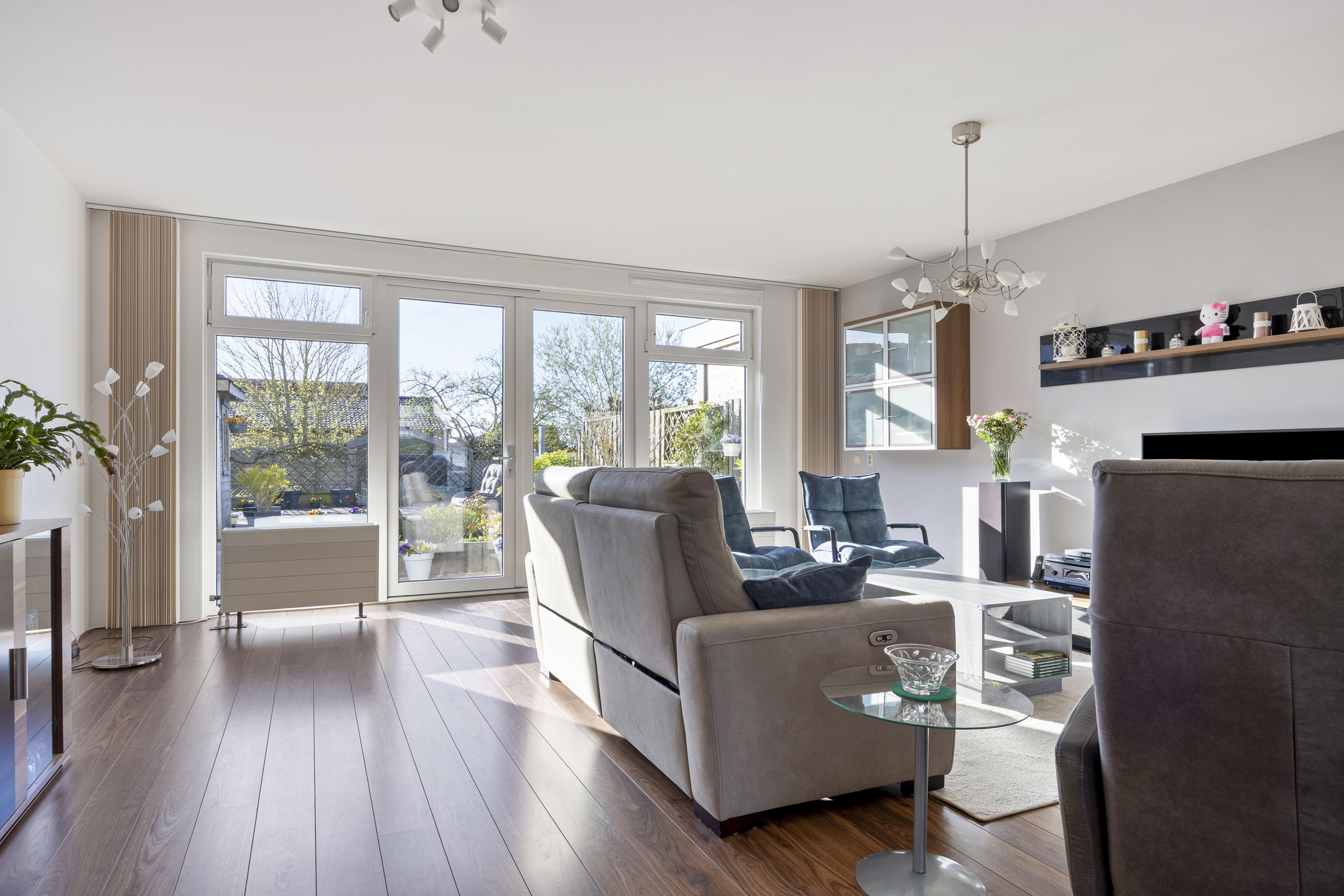 De uitgebouwde woonkamer is tuingericht en heerlijk licht door de grote pui met openslaande deuren en zijlichten. Dit zorgt voor een fijne verbinding met de tuin.
