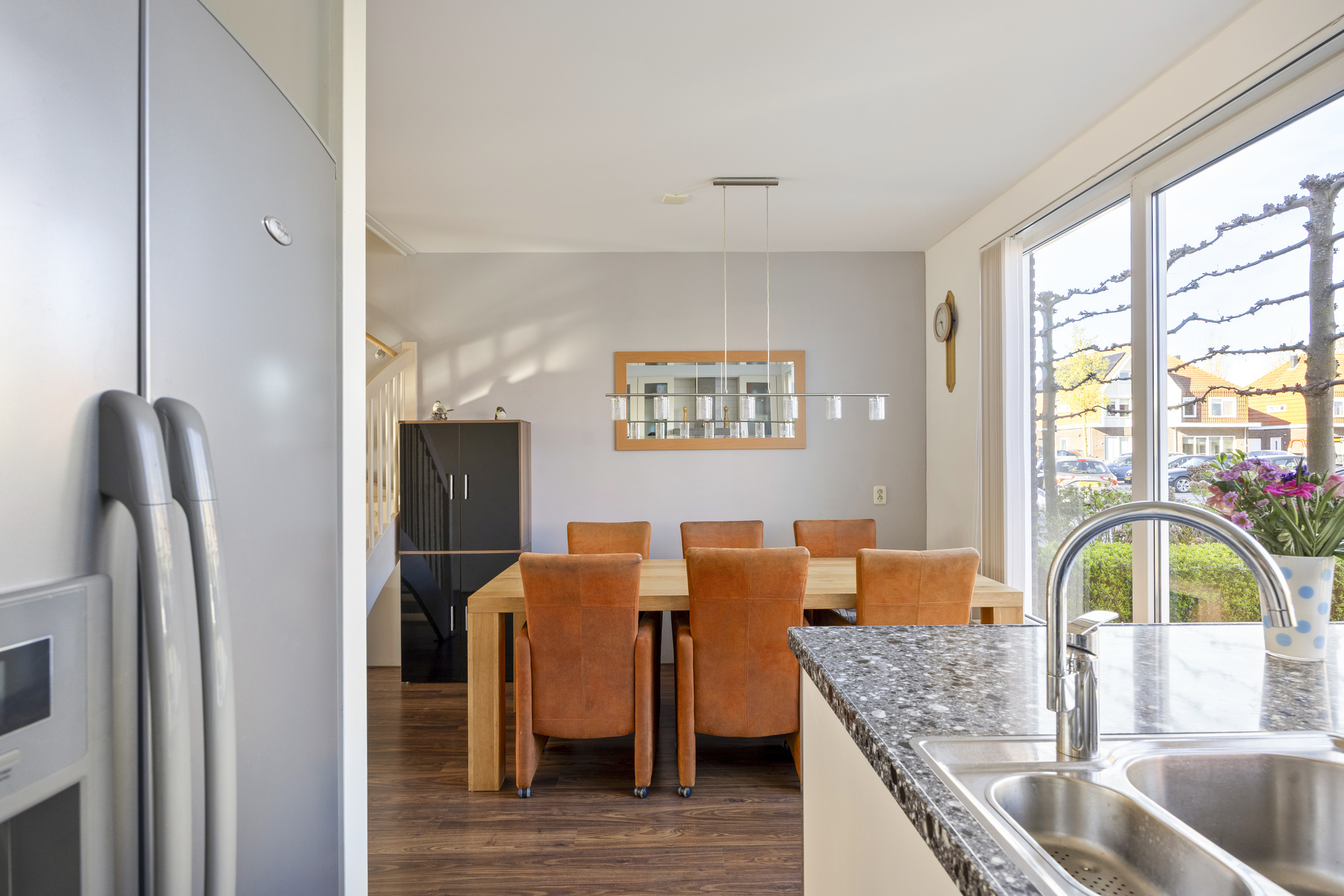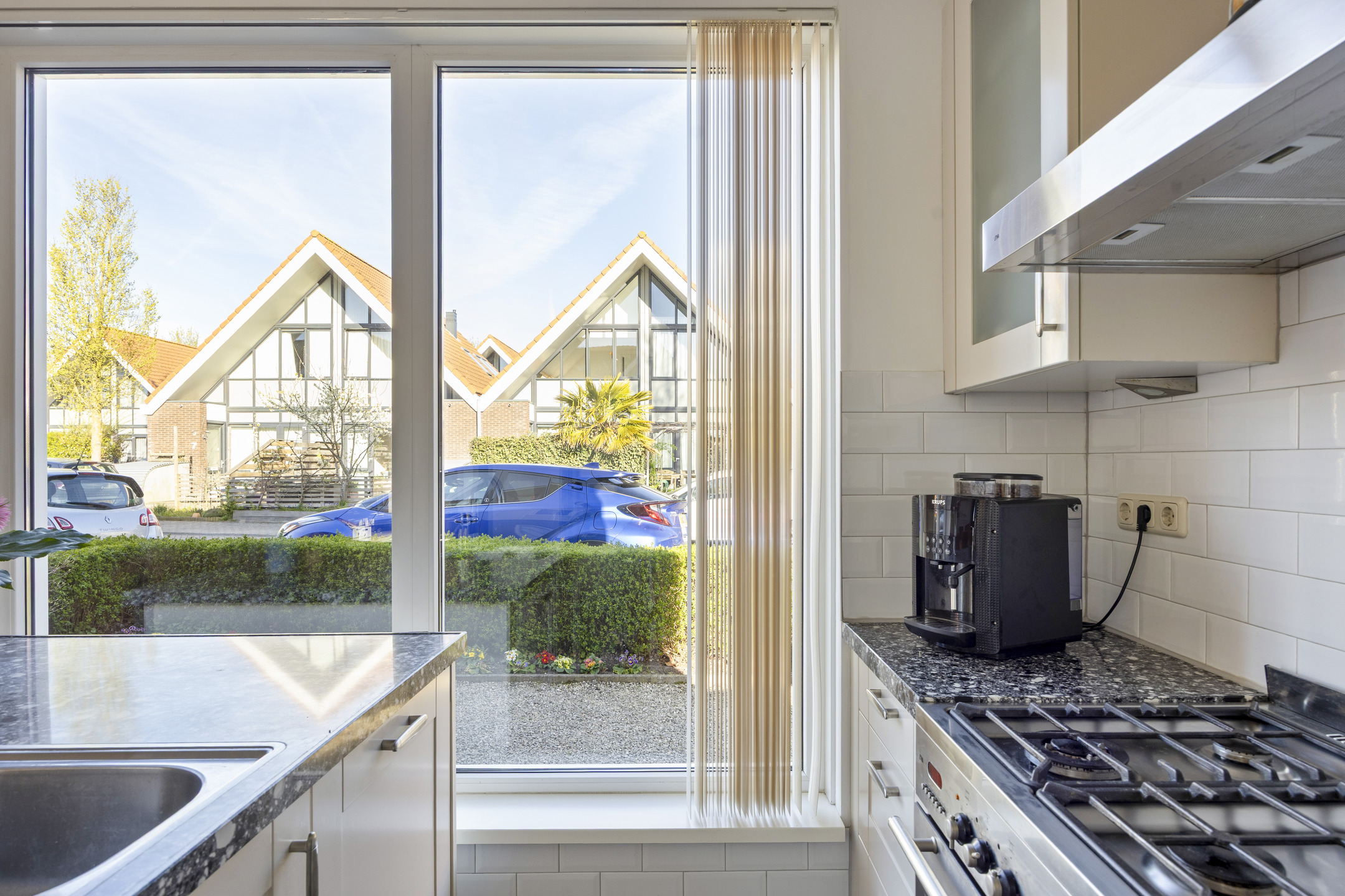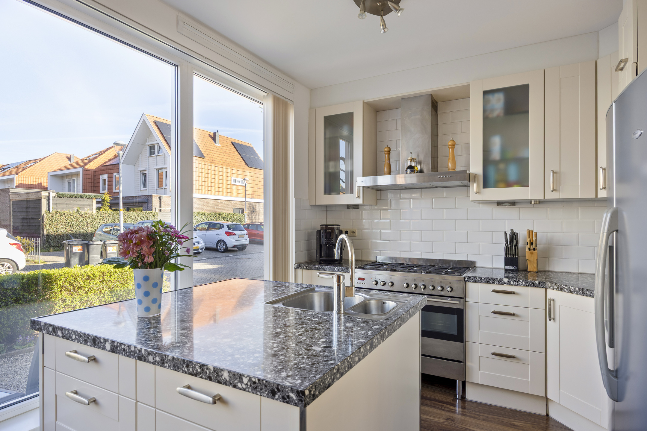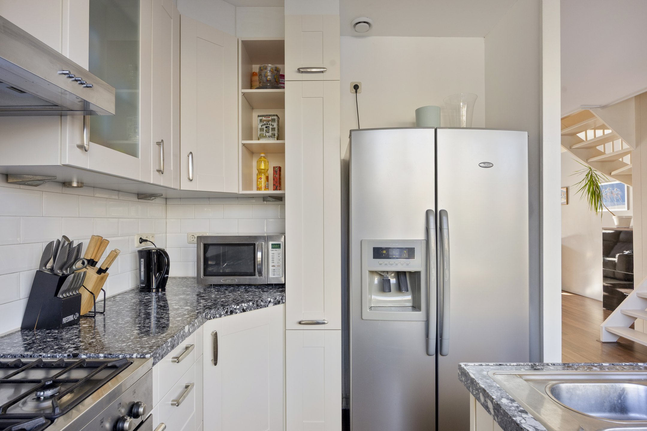 De open keuken bevindt zich aan de voorzijde van de woning en is voorzien van een spoeleiland met opbergruimte en diverse inbouwapparatuur, waaronder een 6-pits gaskookplaat, dubbele oven, vaatwasser, magnetron en een Amerikaanse koel-/vriescombinatie met ijsblokjesmachine en koud water. Dankzij de grote raampartijen is dit een lichte en prettige plek, met voldoende ruimte voor een eethoek.