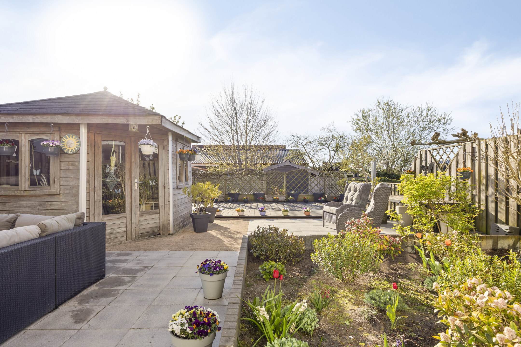 en een buitenkraan. Daarnaast treft u diverse fruitbomen, waaronder appel-, peren-, pruimenbomen en rode bessen en druif. Halverwege de tuin staat een tuinhuis (ca. 7,5 m²) met elektra. Ook is er een oprolbaar windscherm bij de vlonder en een elektrisch zonnescherm aan de achtergevel. Vanuit de tuin geniet u van vrij uitzicht over het polderlandschap. De tuin is tevens bereikbaar via een zijpoort.