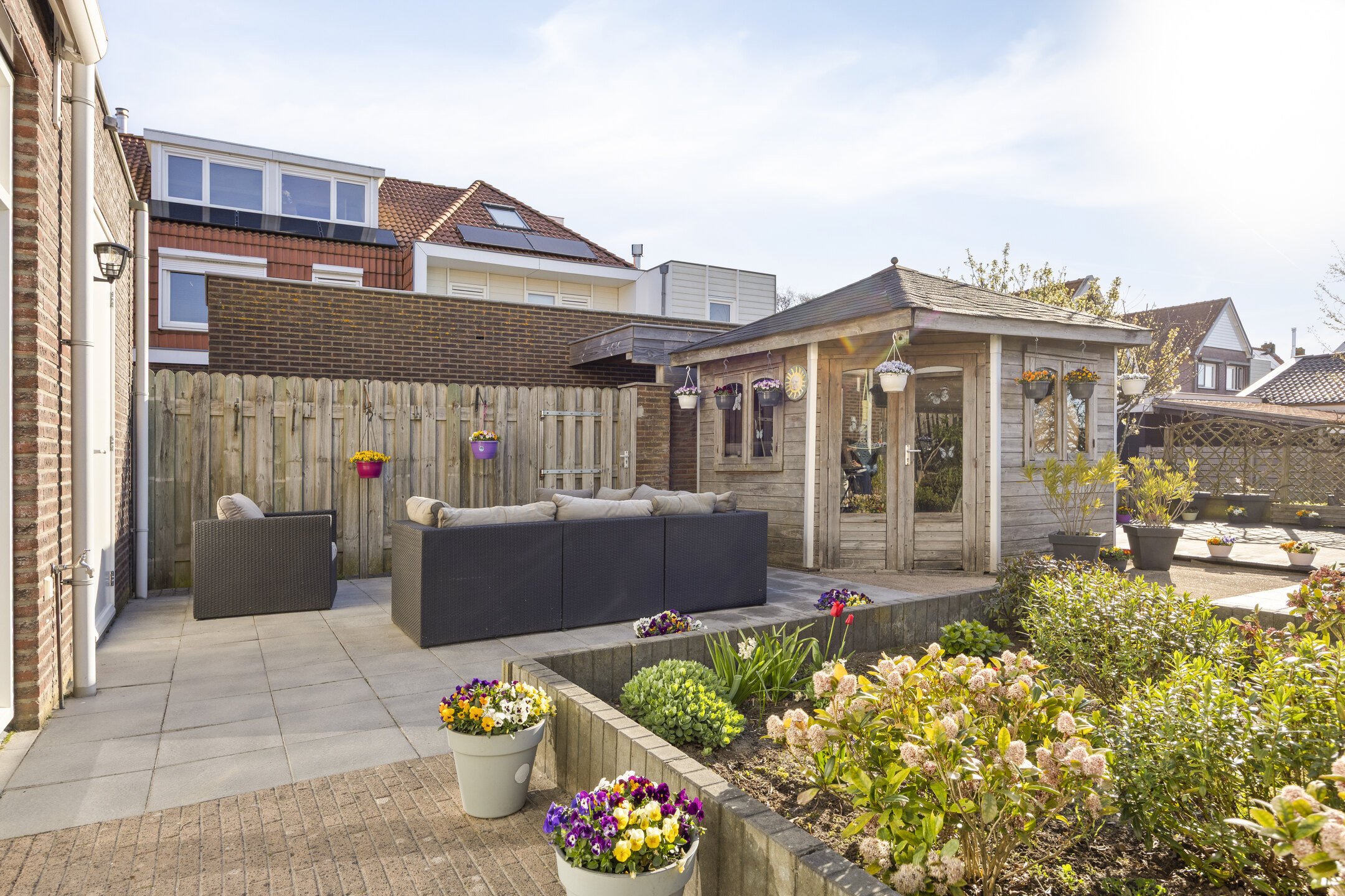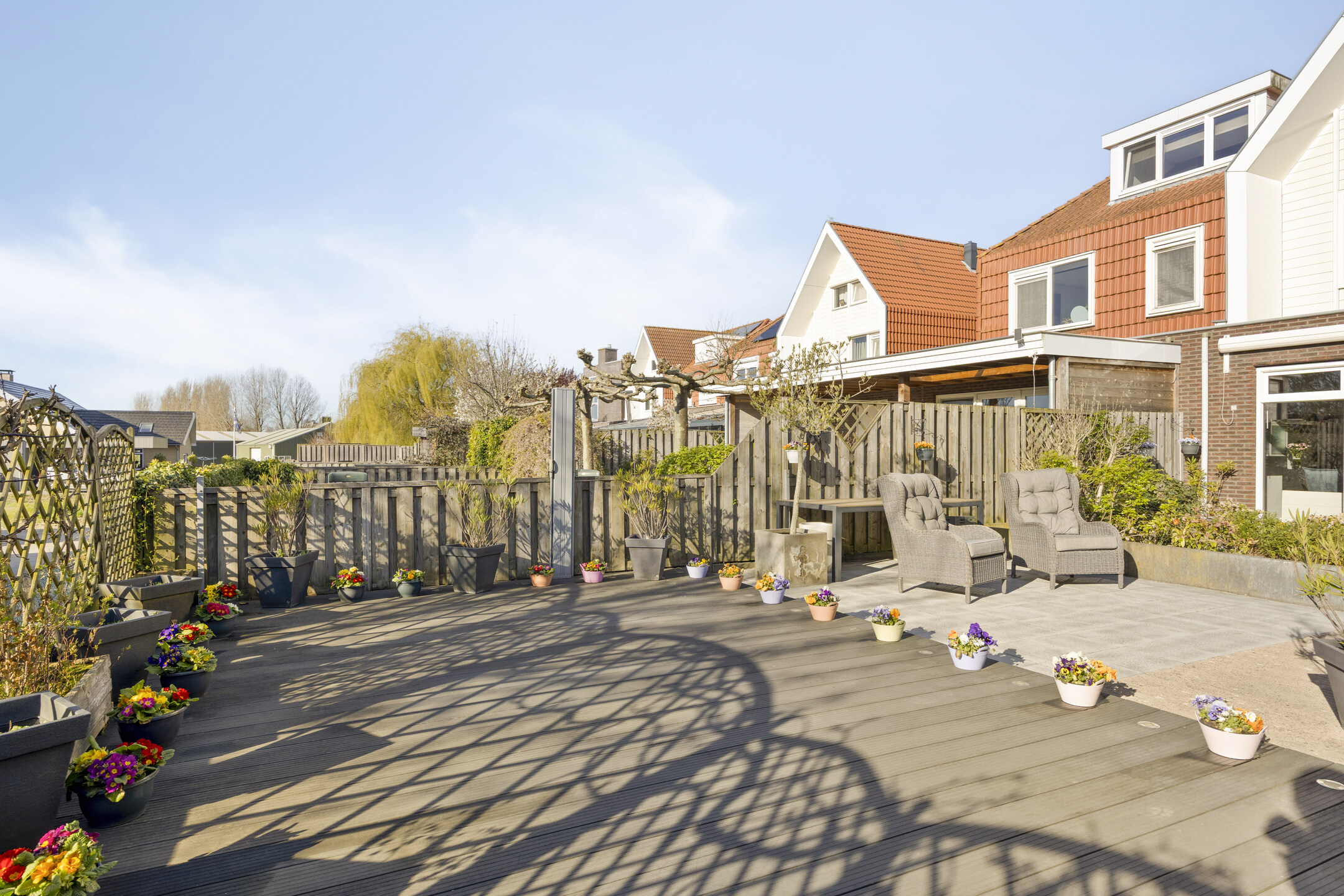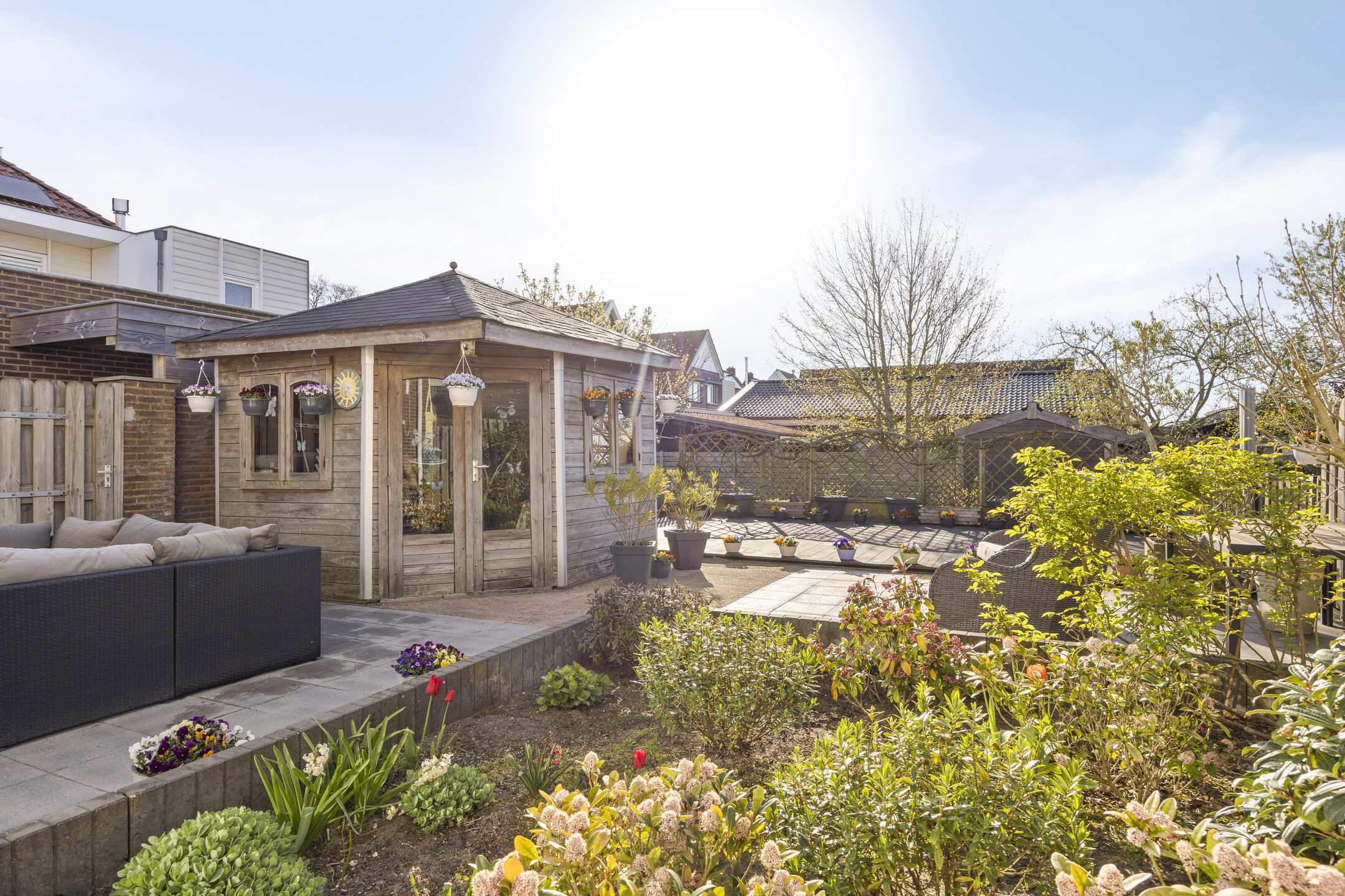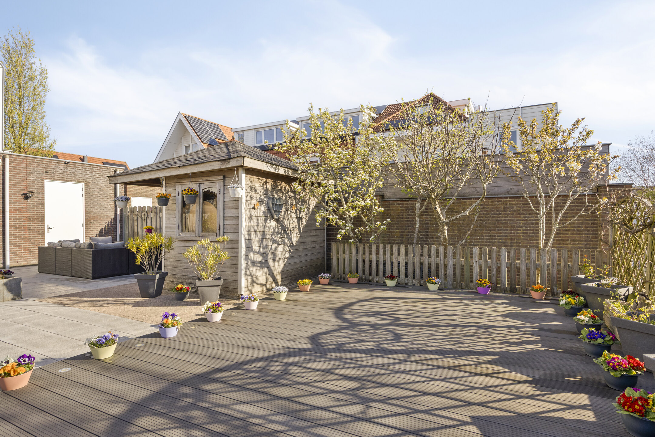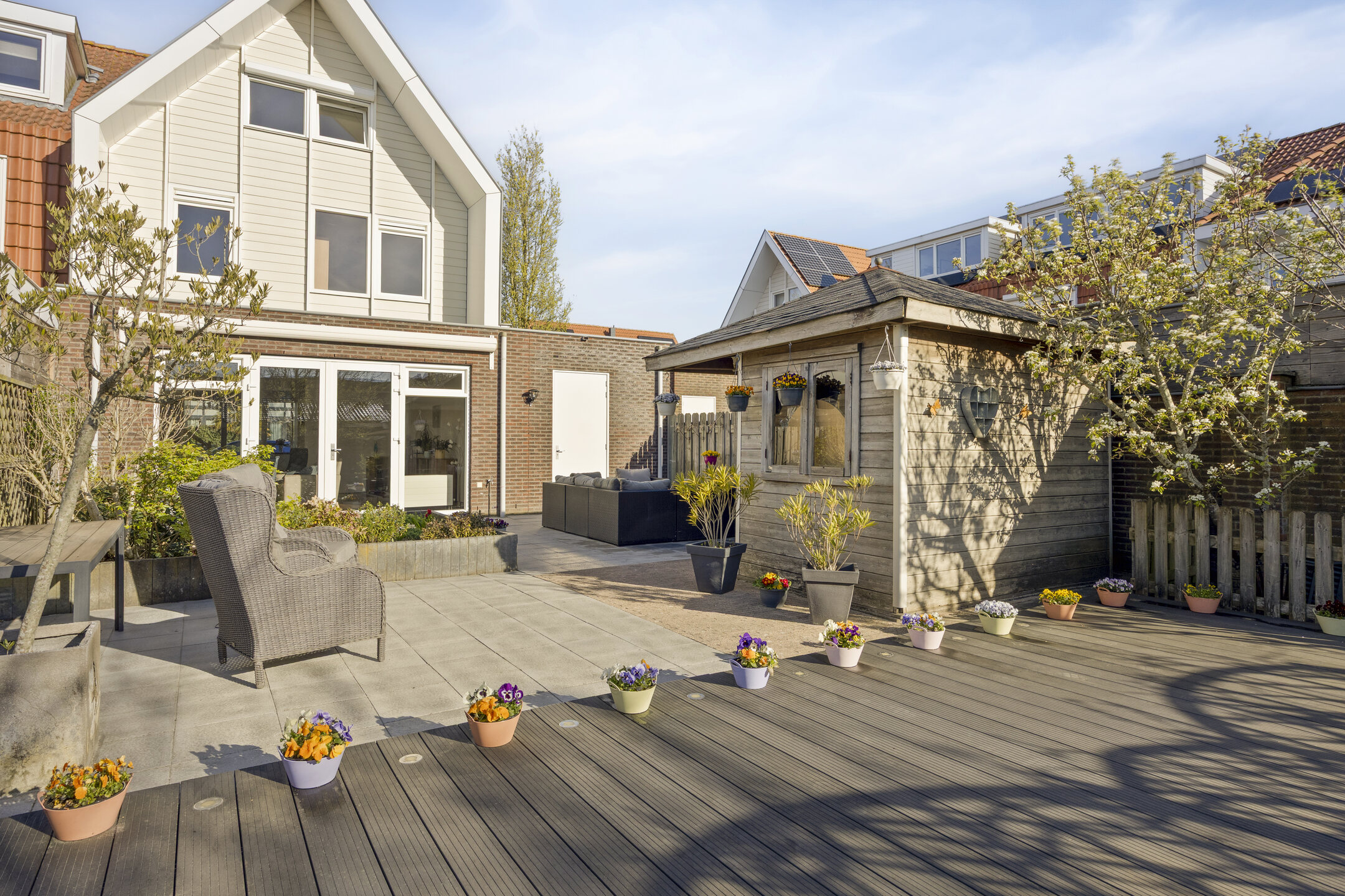 De achtertuin is circa 14 meter diep en gunstig gelegen op het zuidoosten. De tuin is verzorgd aangelegd met een terras, vaste beplanting, een vlonder