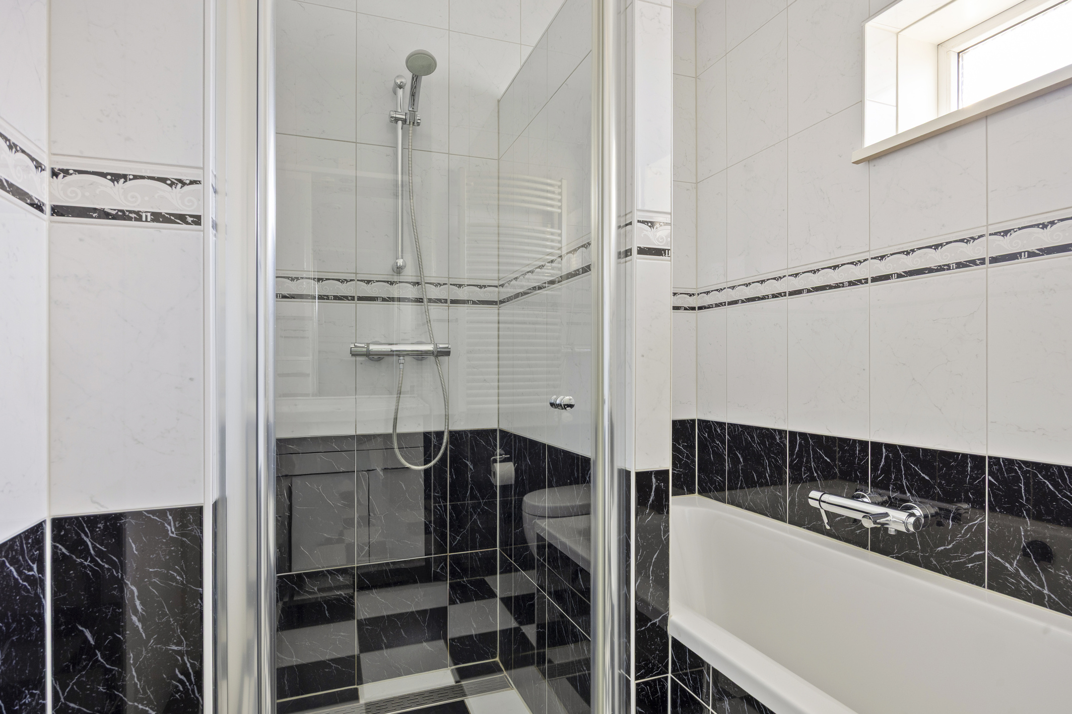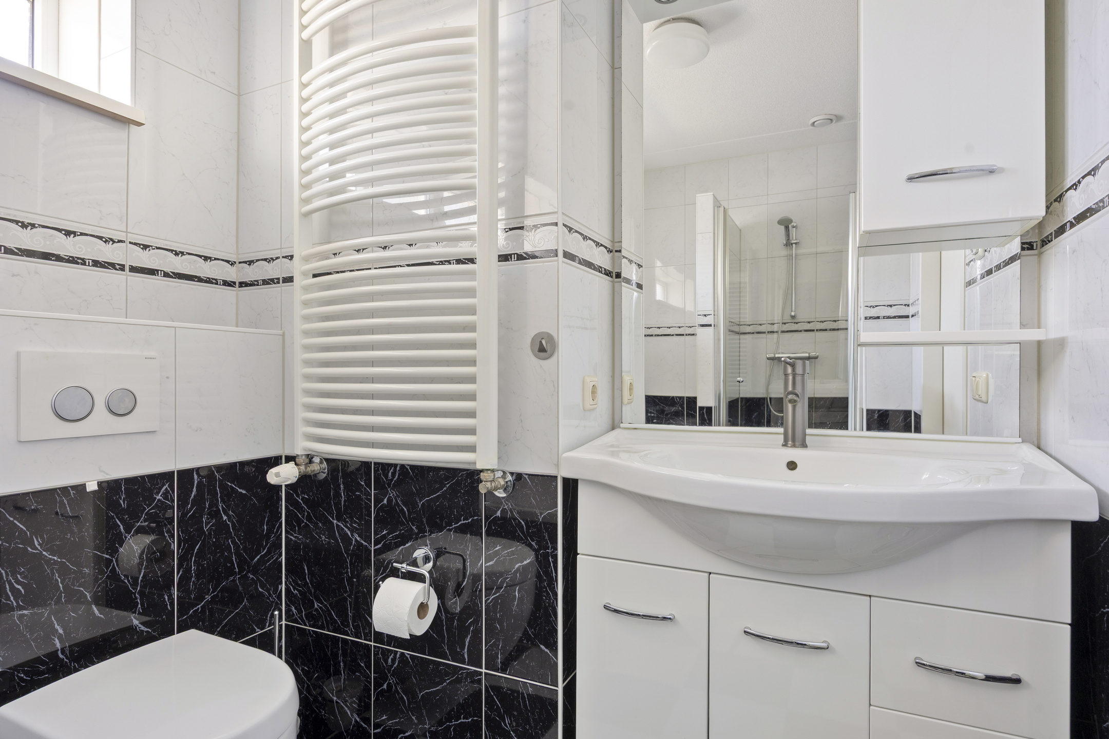 De badkamer is compleet uitgevoerd met een inloopdouche, ligbad, toilet en wastafel. Daarnaast is de badkamer voorzien van vloerverwarming en een handdoekradiator. Aan de achterzijde liggen nog twee goed bemeten slaapkamers, waarvan één met vaste kastenwand en uitzicht over de polder.