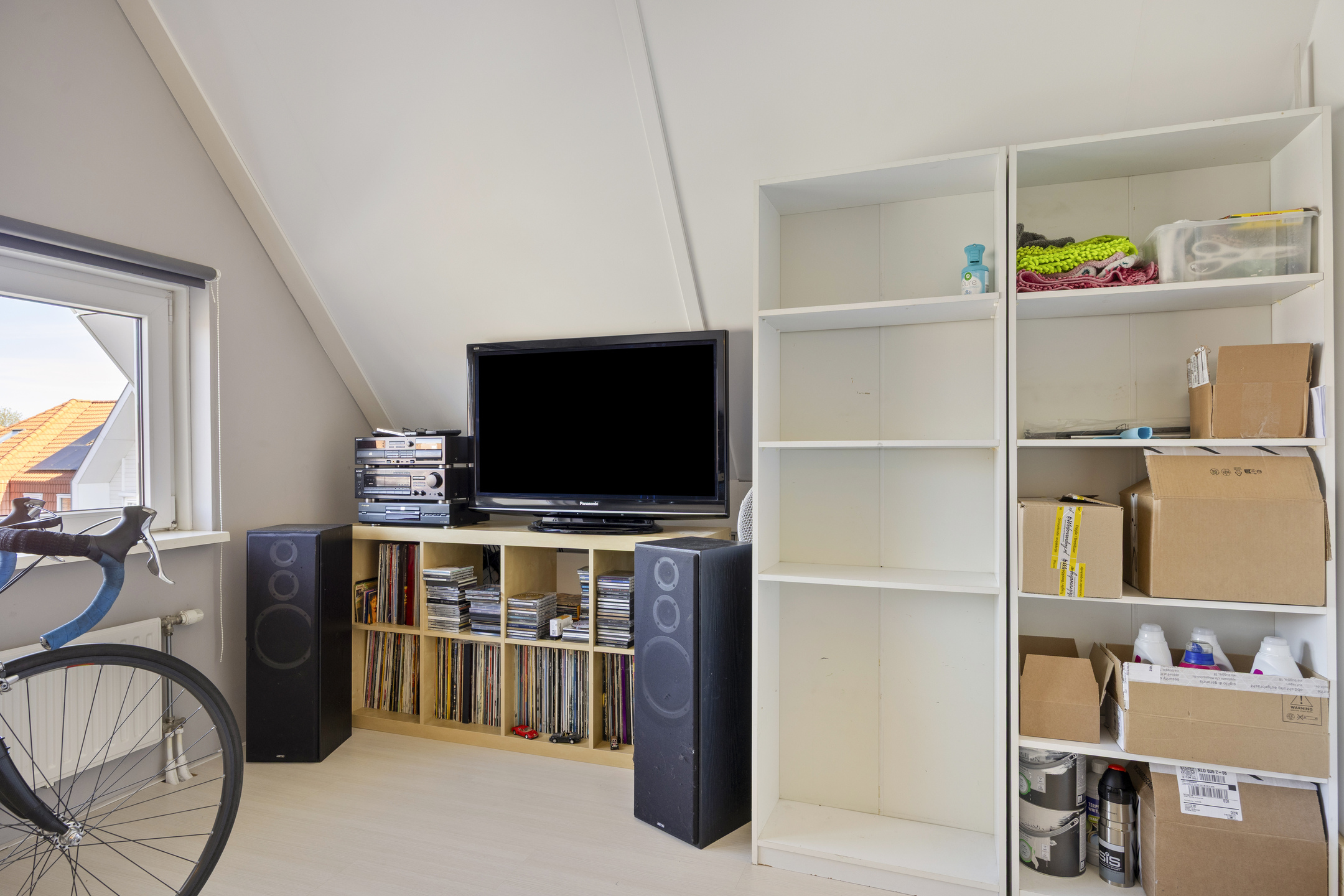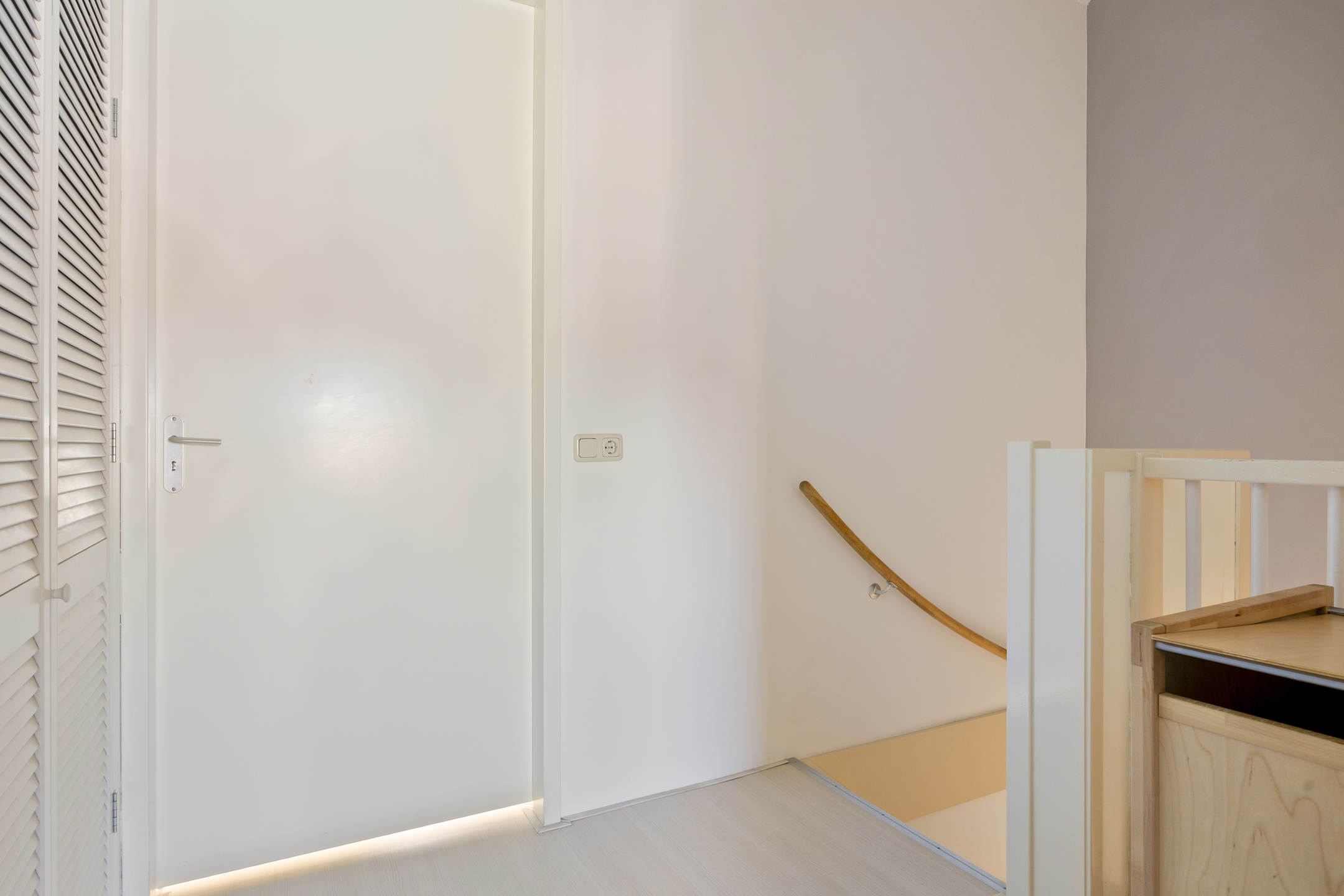 De tweede verdieping beschikt over een ruime overloop met aansluitingen voor wasmachine en droger, evenals de opstelplaats voor de cv-ketel (2009) en mechanische ventilatie (2024), netjes weggewerkt achter lameldeuren.