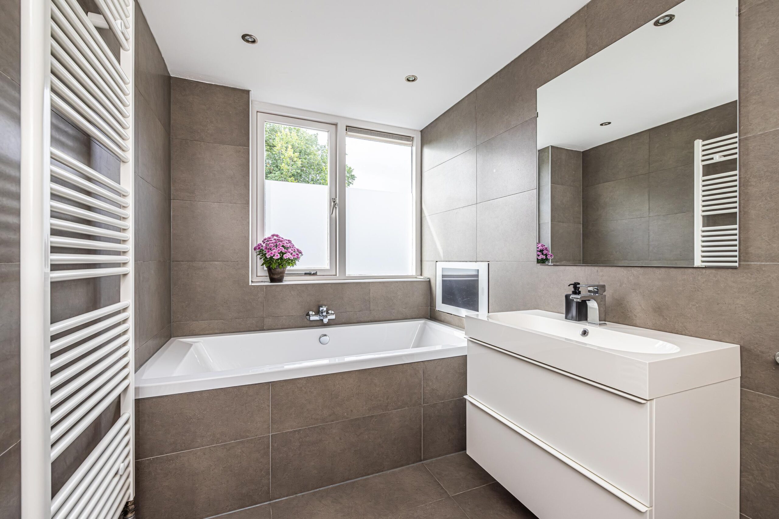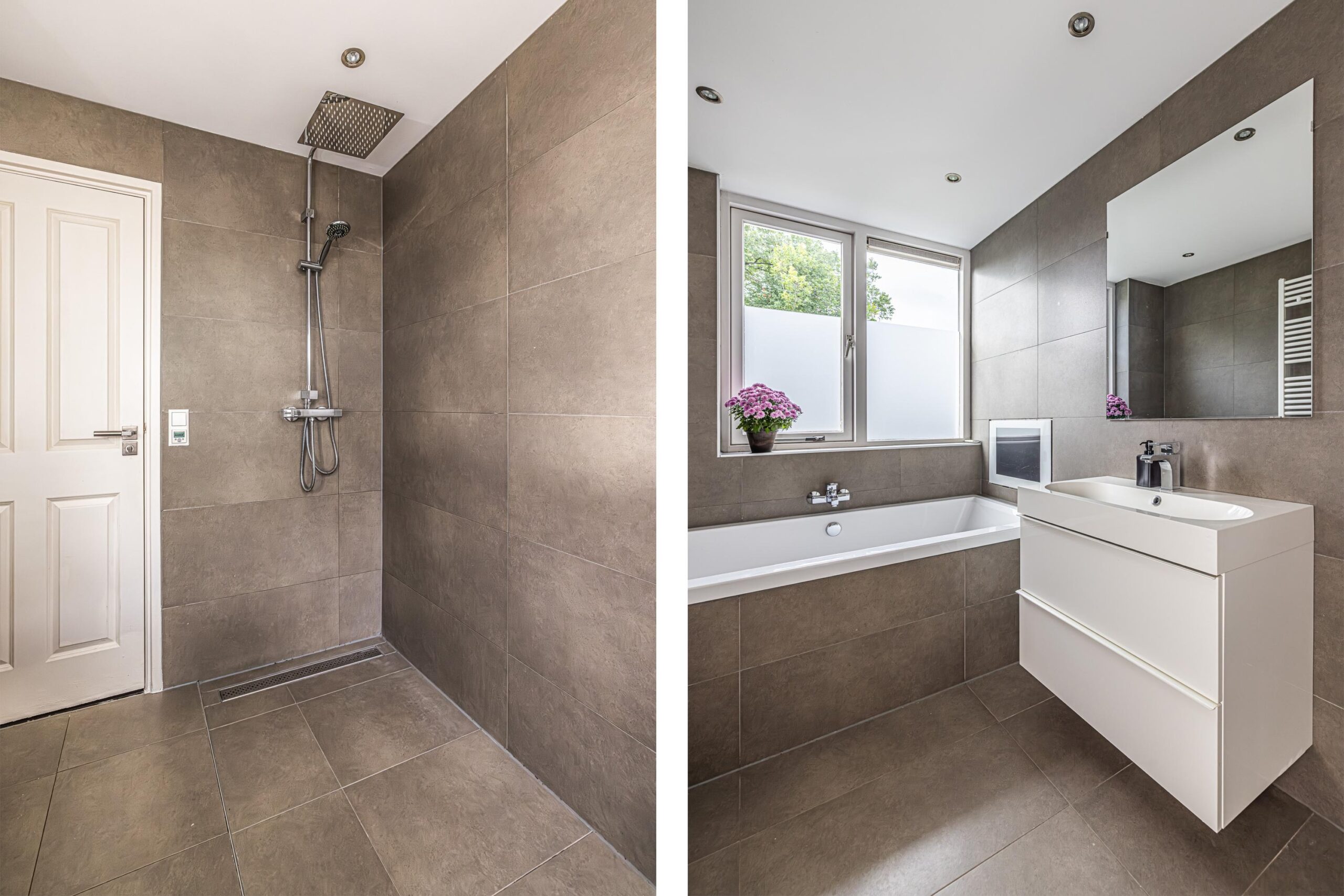 wit sanitair, antraciet/bruin tegelwerk, compleet met thermostaatmengkranen, designradiator en vloerverwarming. Voor de extra ontspanning is er een tv aangebracht bij het bad!