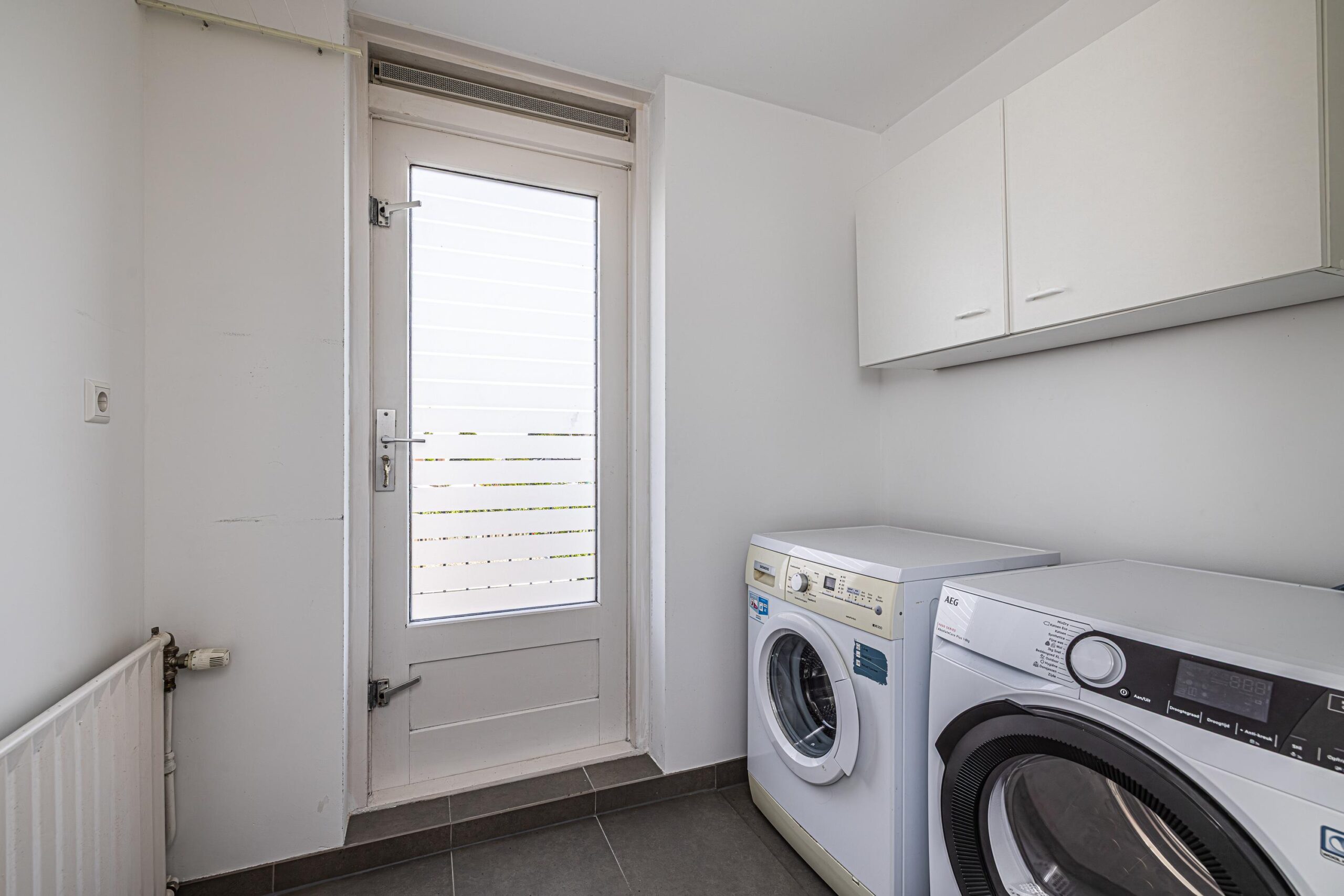 Aan de achterzijde bevinden zich een royale 2e slaapkamer alsmede een praktische waskamer. Deze betegelde ruimte is voorzien van een wasmachine- en drogeraansluiting en heeft een buitendeur met toegang tot het balkon.