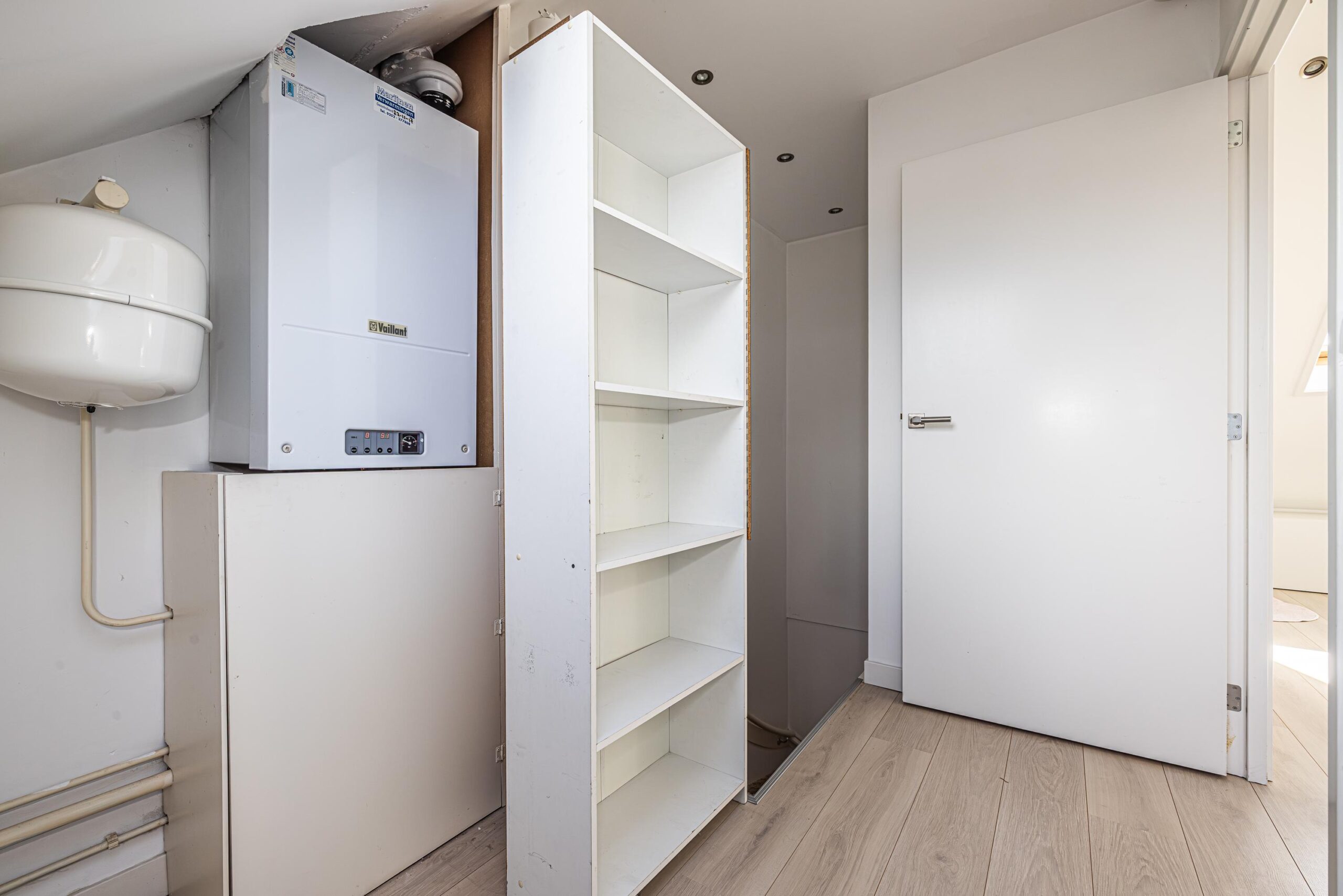 Een brede overloop met dakvenster, met bergruimte onder het dakvlak alsmede de opstelplaats van de c.v.-combiketel.