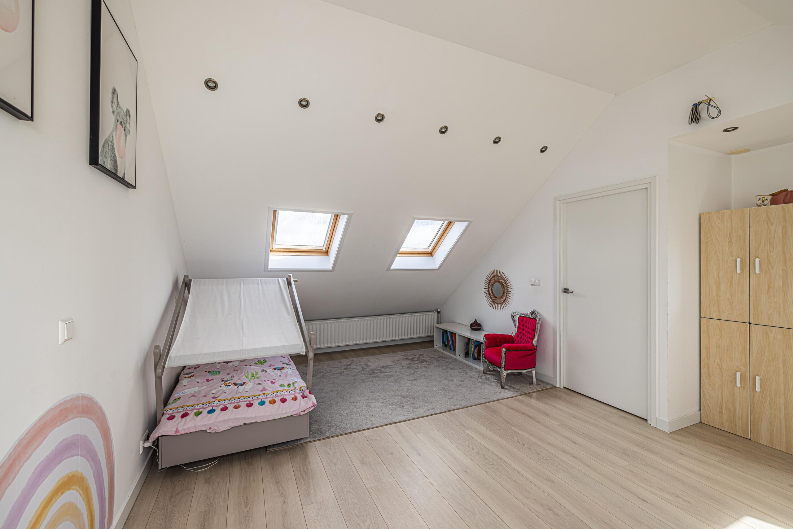 Een riante en heerlijk lichte 3e slaapkamer, welke is voorzien van maar liefst 5 grote dakvensters. Deze riante ruimte laat zich eenvoudig indelen of is er een extra (slaap) kamer te realiseren.
