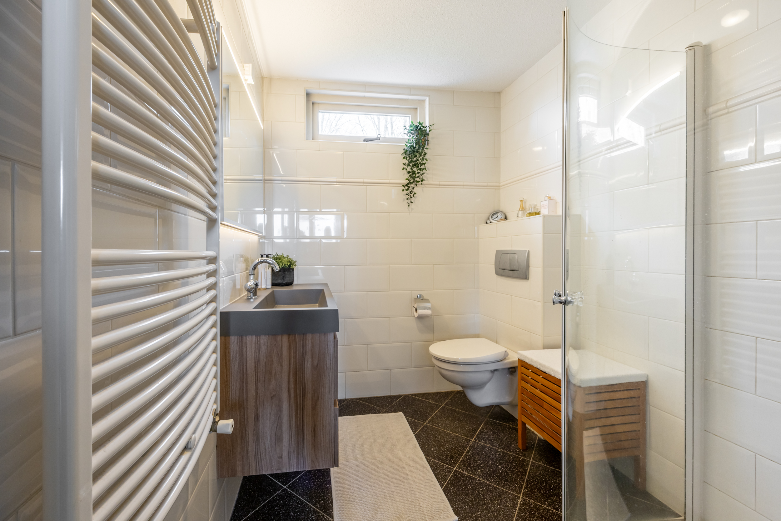Landing with access to three bedrooms and a neat bathroom with washbasin, second toilet, and walk-in shower.