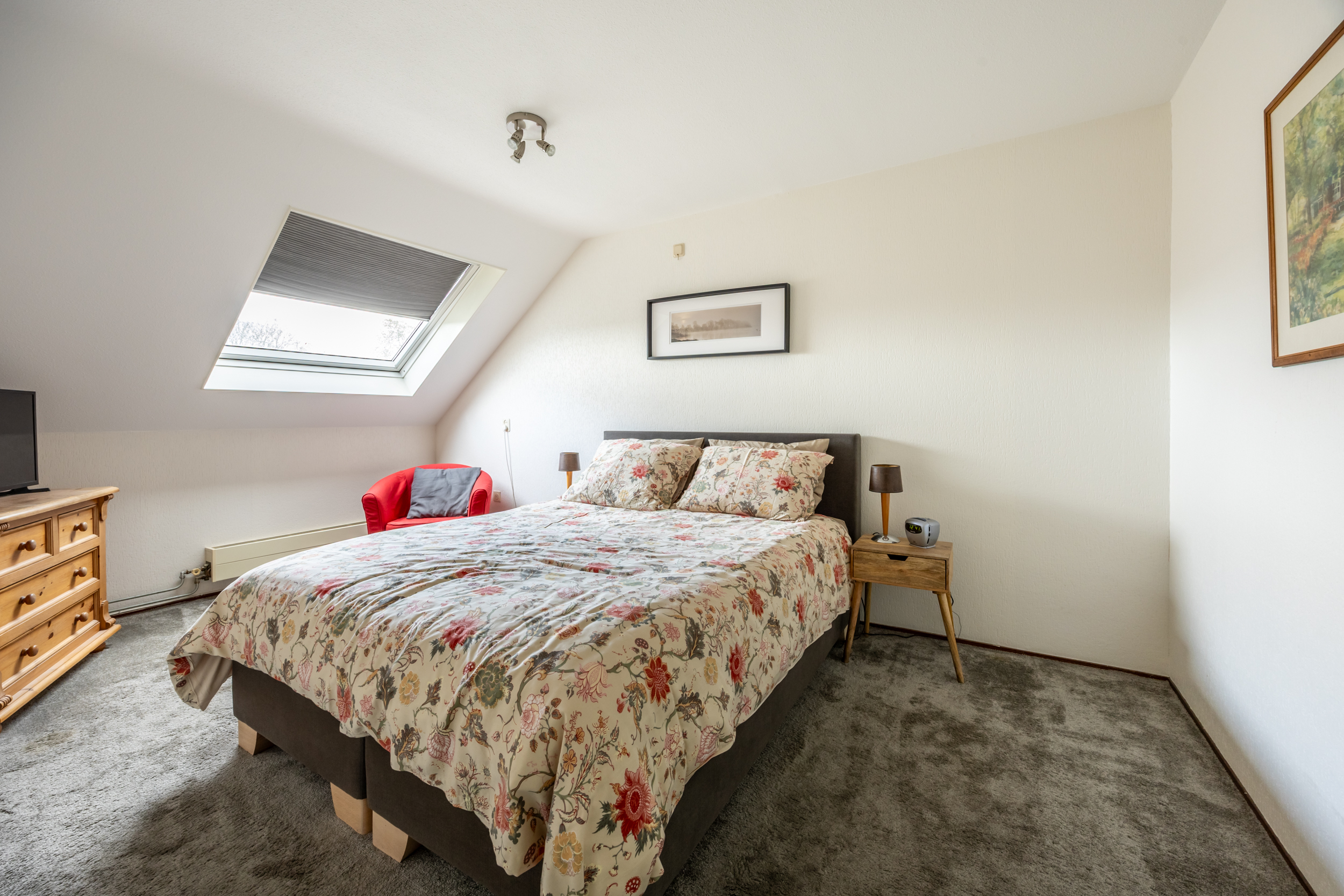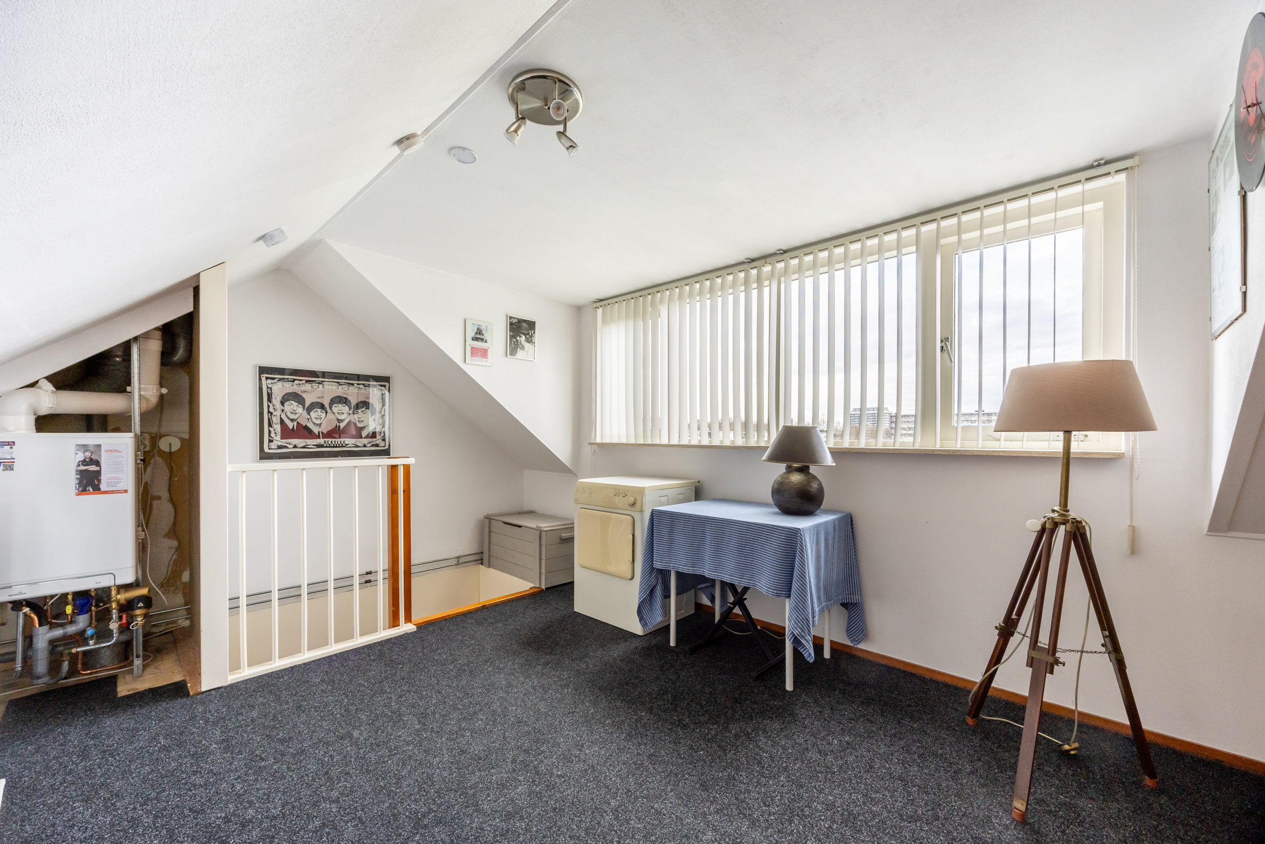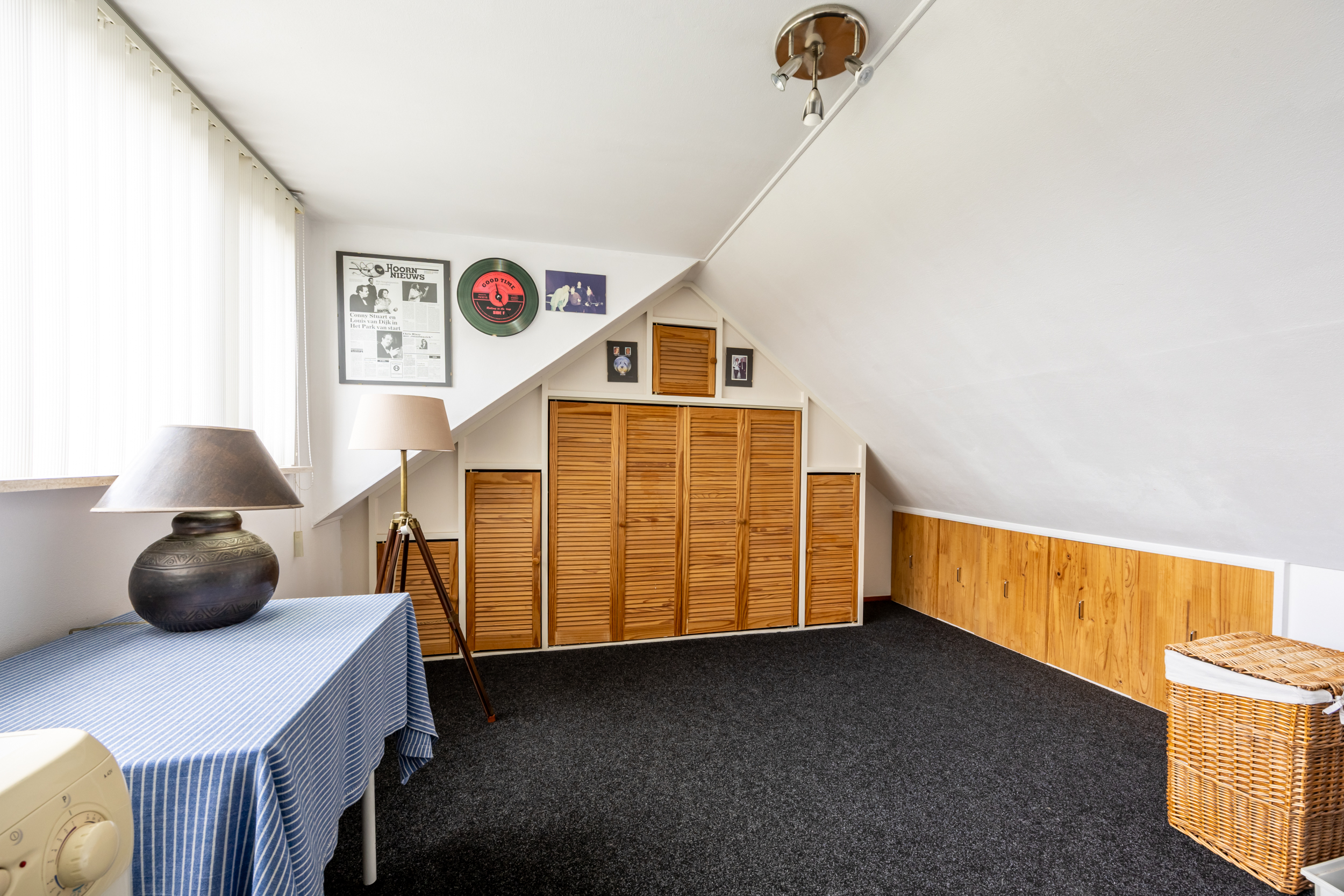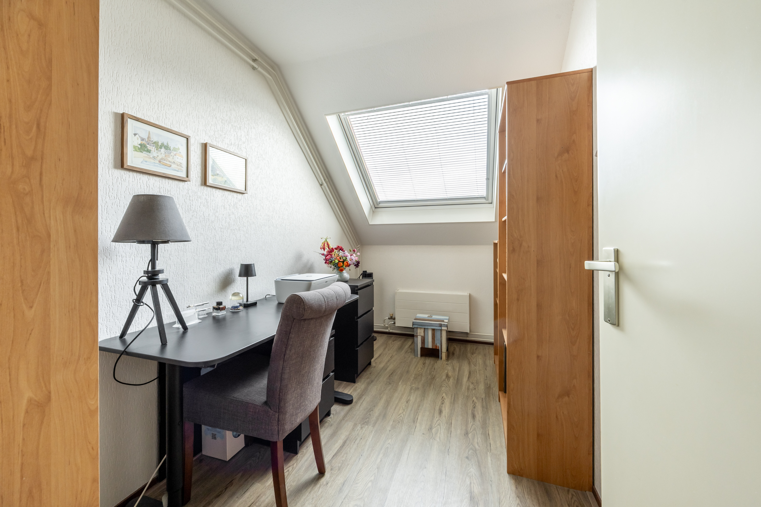 A fixed staircase leads to the spacious fourth bedroom with dormer window, attic storage, and space for the central heating system, washing machine, dryer, and central ventilation.
