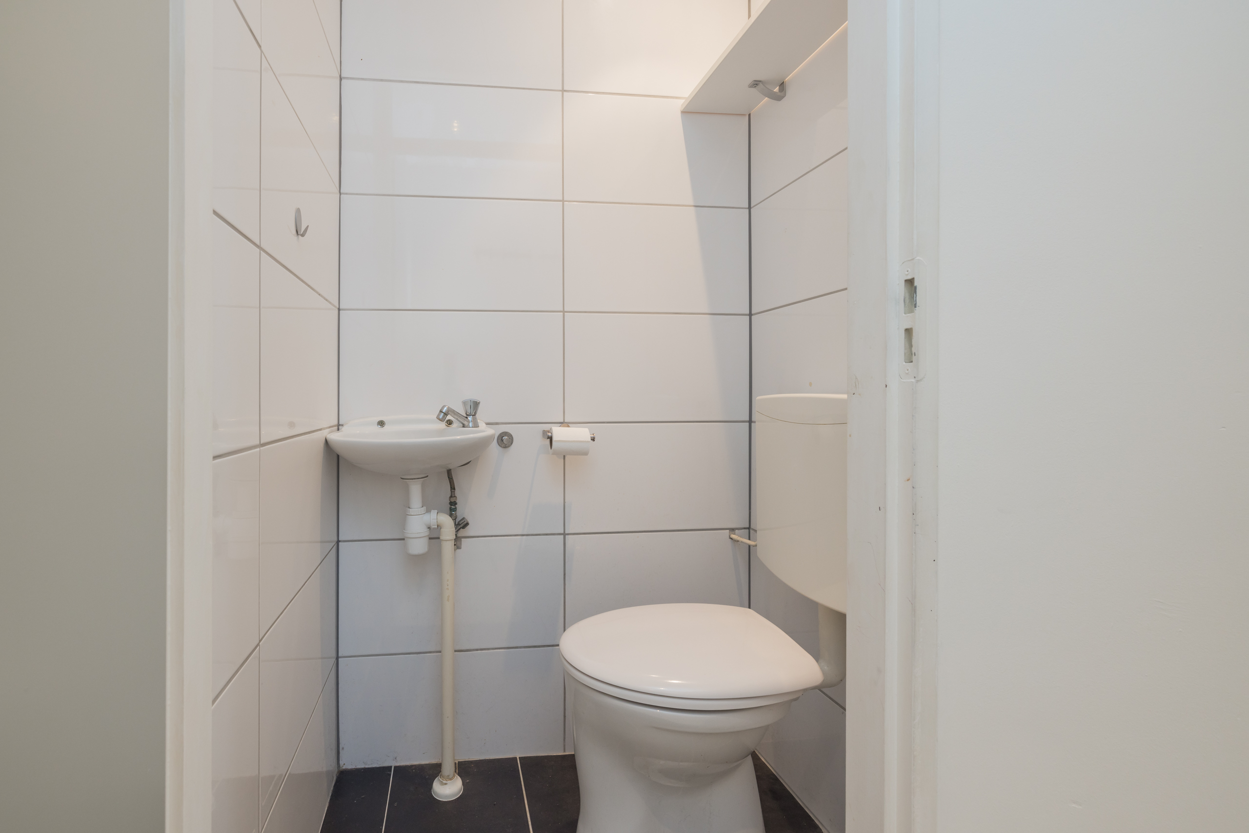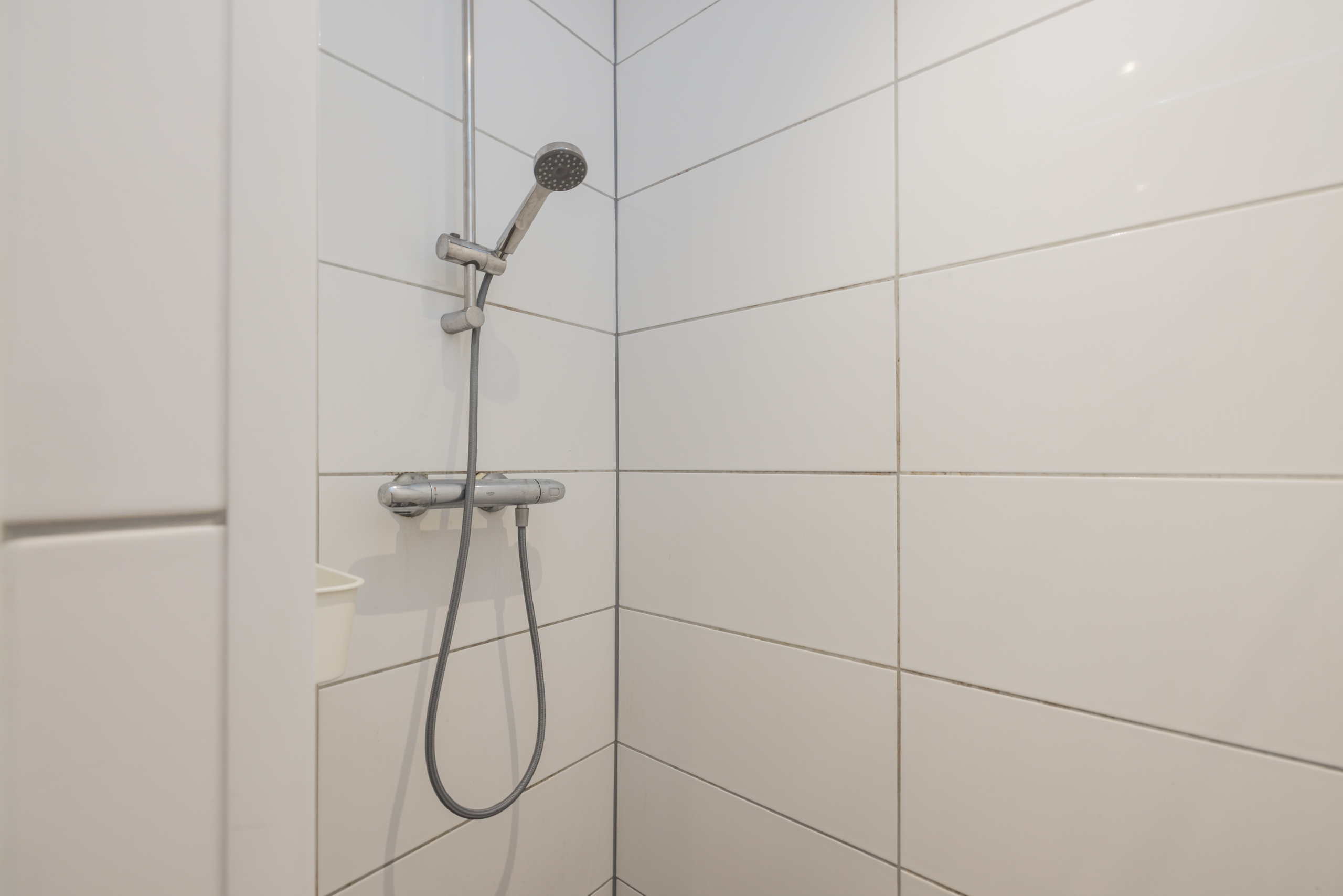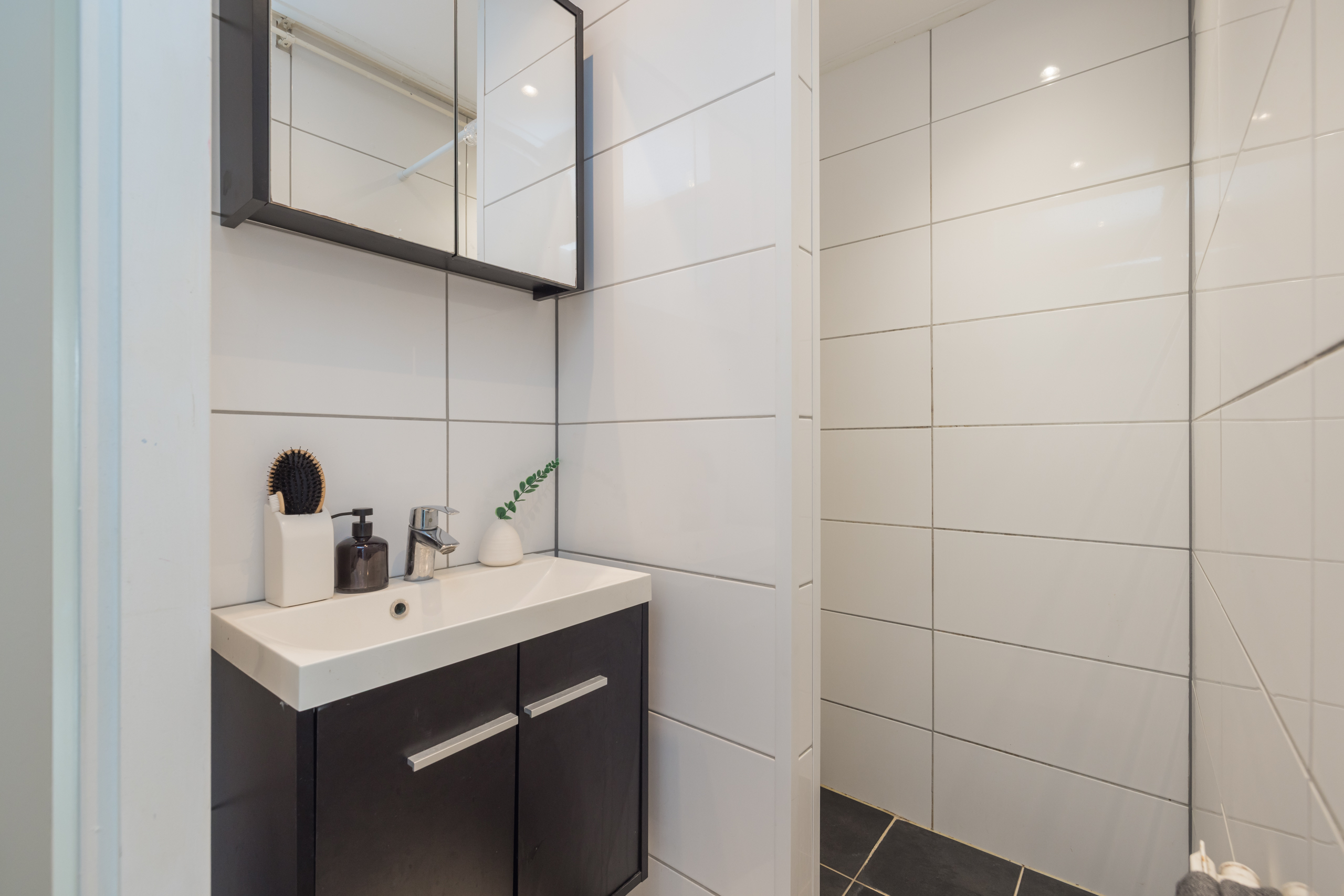 Eerste verdieping: entree, hal met garderobe en video-intercom, badkamer (1,69 x 1,18m) met douche en wastafel, apart toilet met fonteintje.