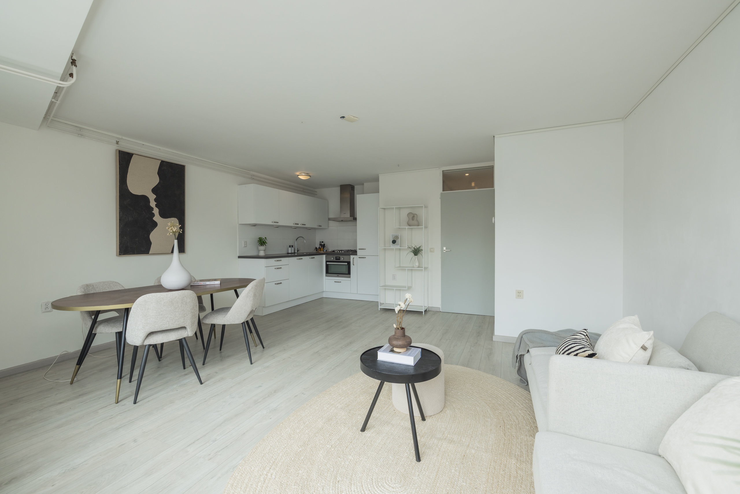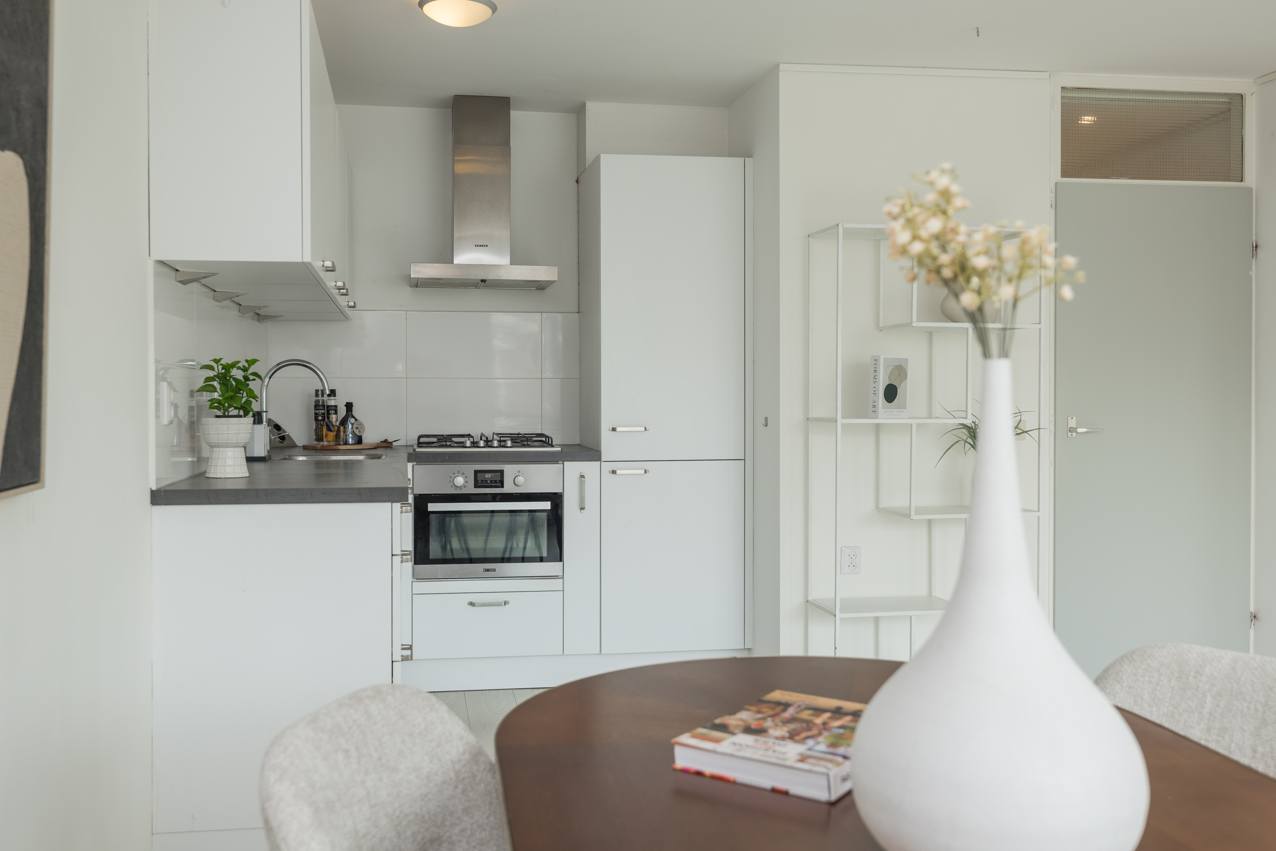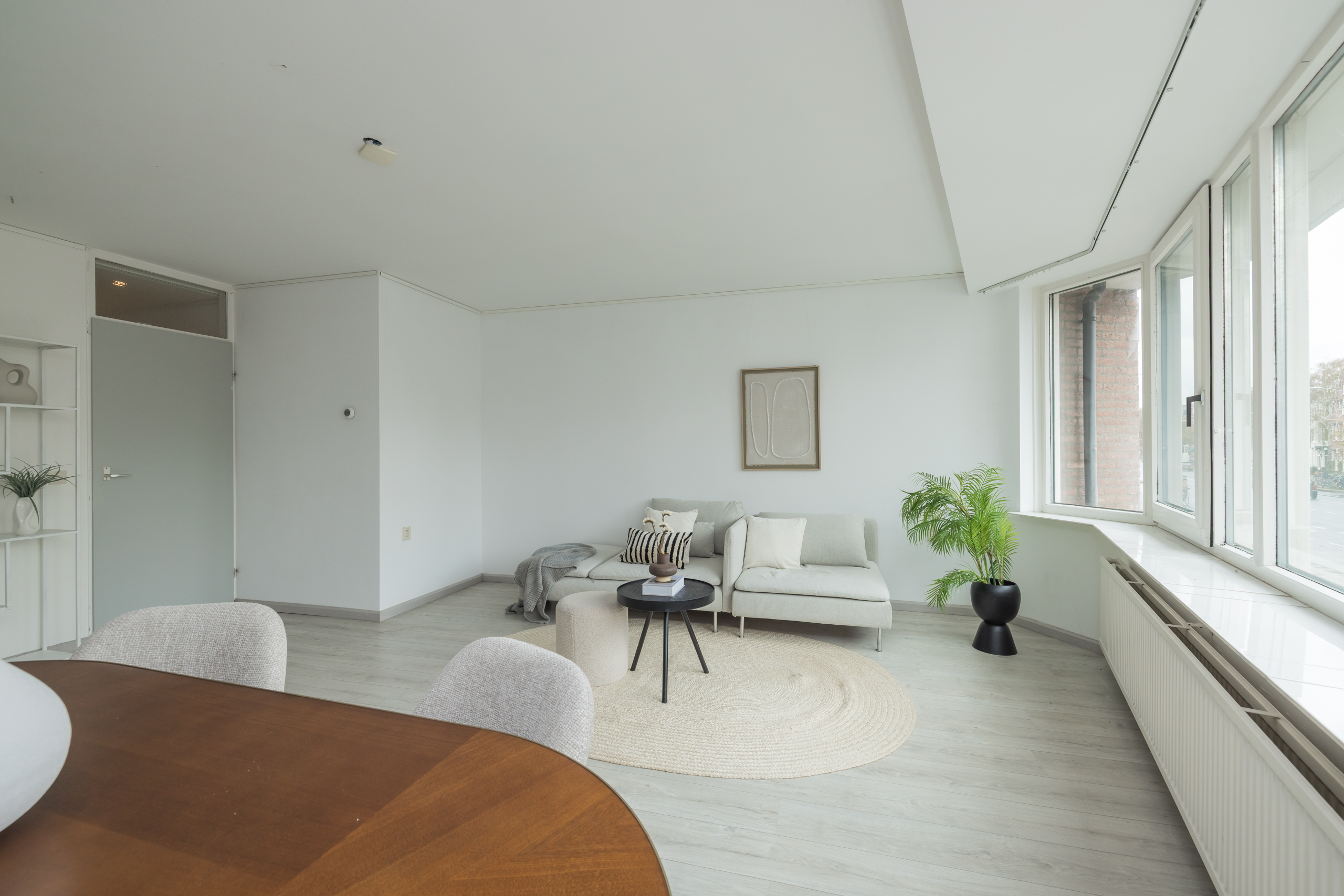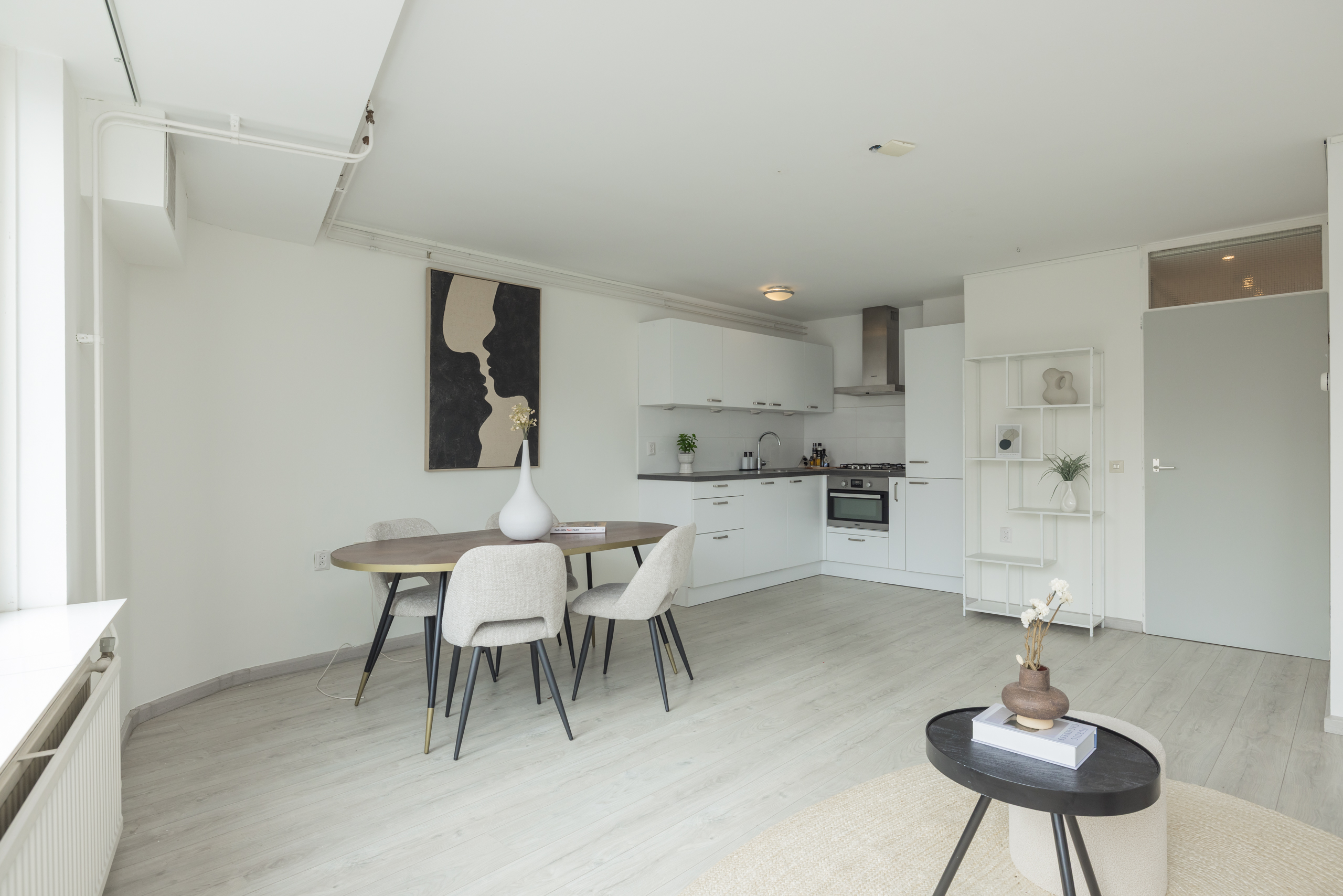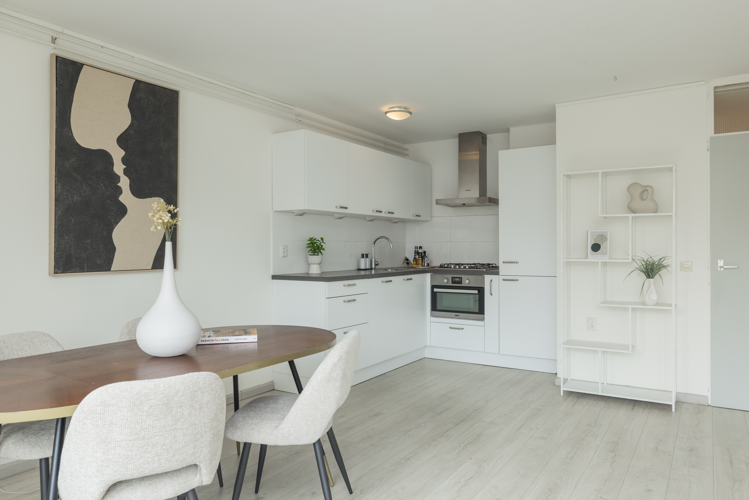 Spacious, bright living room (approx. 5.91 x 5.25 m) with beautiful views over Nassaulaan, the modern open kitchen has various built-in appliances including refrigerator, freezer, dishwasher, oven, 4-burner gas stove, extractor hood, and plastic worktop.