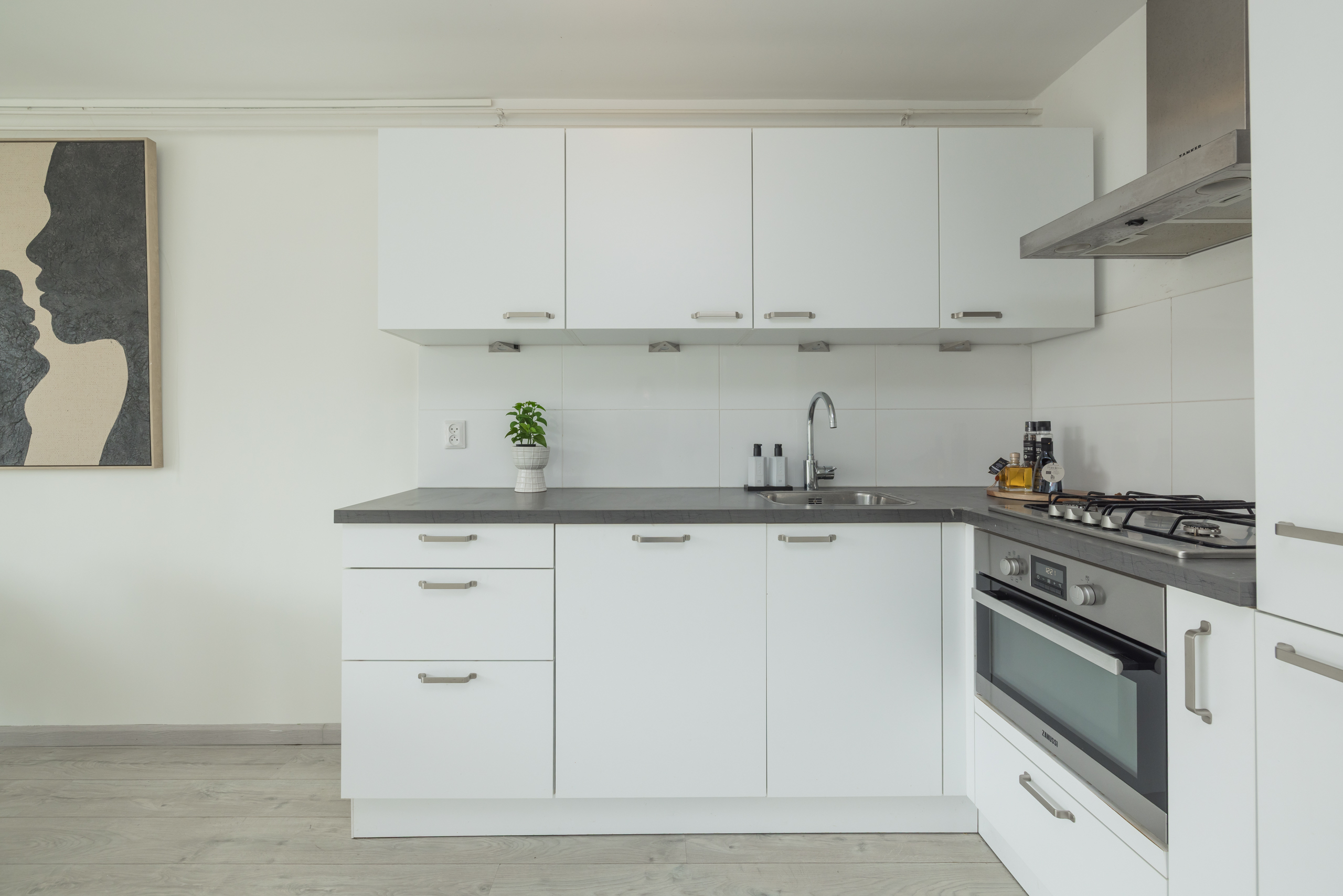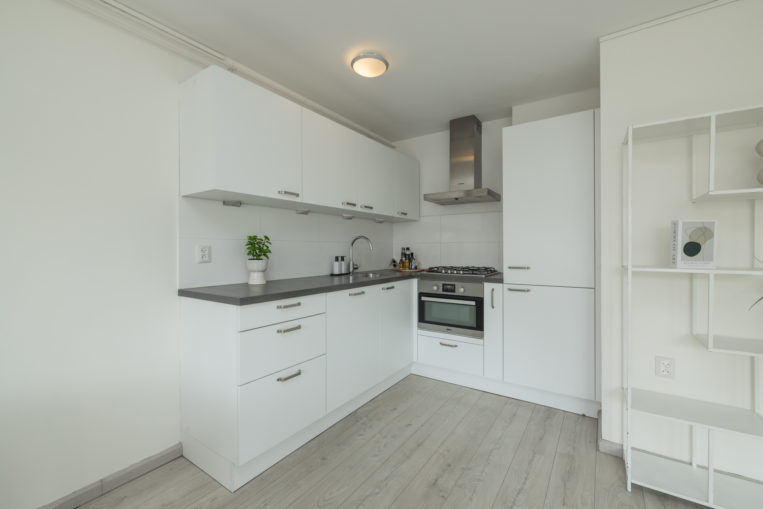 Ruime lichte woonkamer (ca. 5,91 x 5,25 m) met fraai uitzicht over Nassaulaan, de moderne open keuken beschikt over diverse inbouwapparatuur w.o. koelkast, vriezer, vaatwasser, oven, 4-pits gasstel, afzuigkap en een kunststof werkblad.