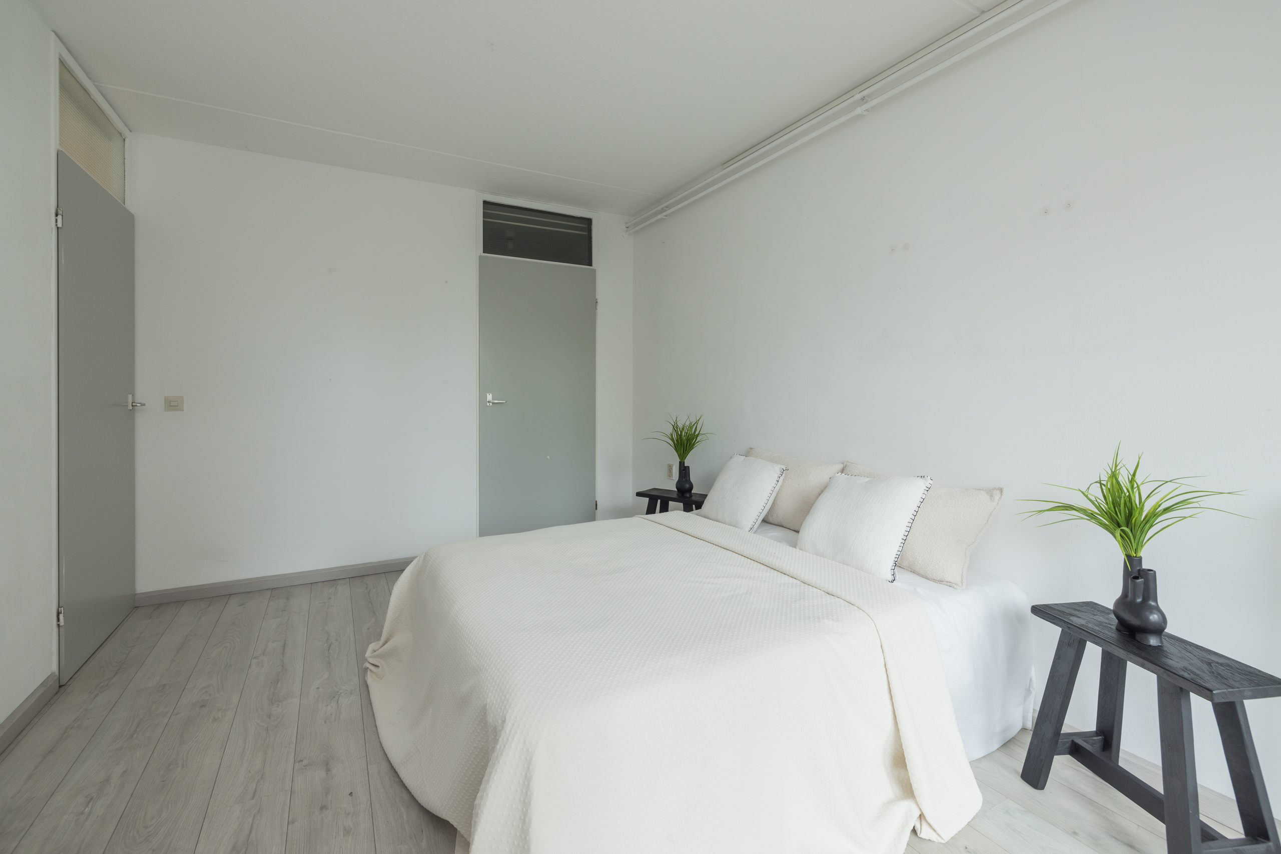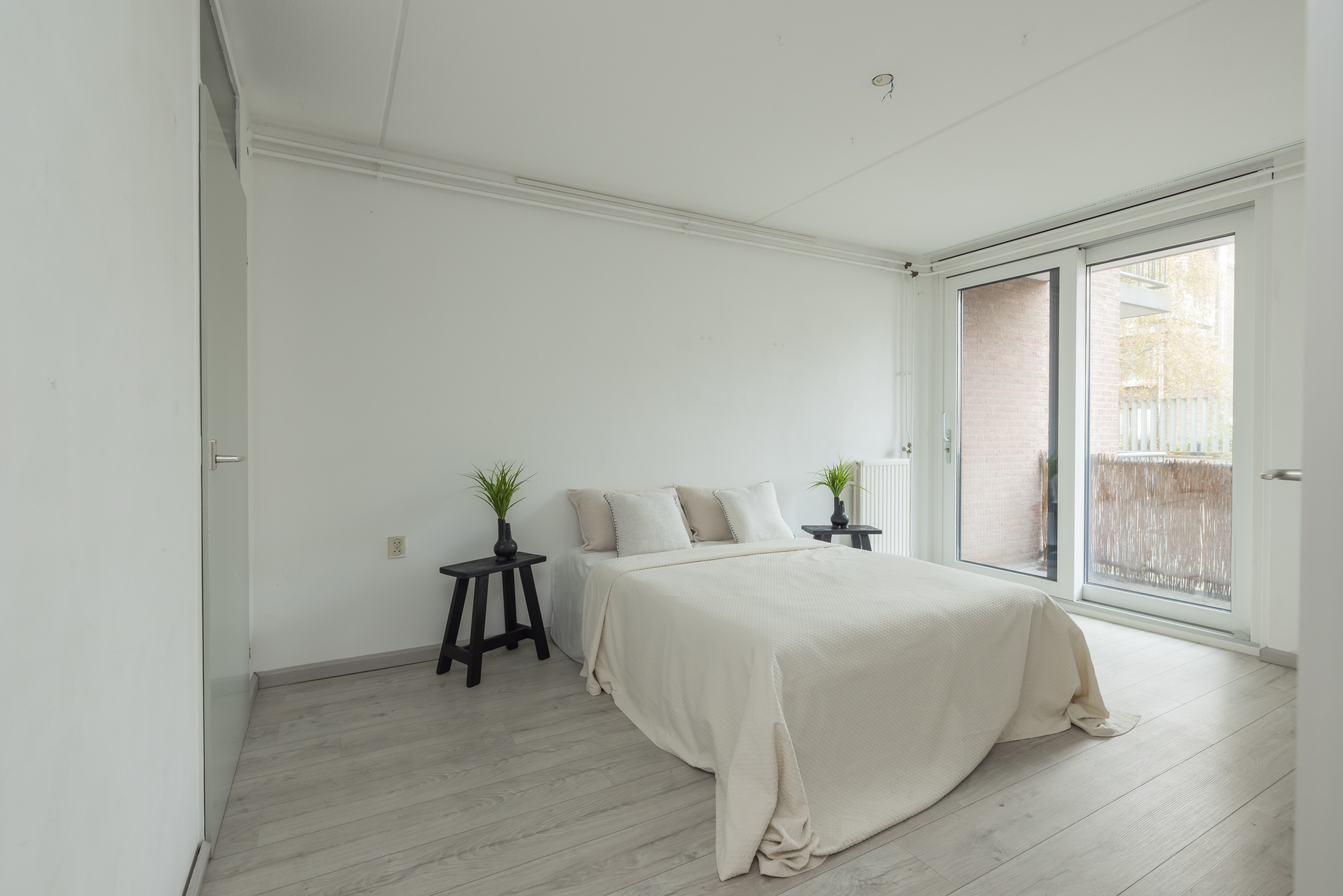 Er zijn twee slaapkamers, waarvan één (4,18 x 2,95m) met een ruime bergkast met aansluitingen voor wasmachine/droger, en een kunststof schuifpui naar het balkon op het westen (ca. 2,95 x 1,20 m) , perfect om te genieten van de middag- en avondzon.