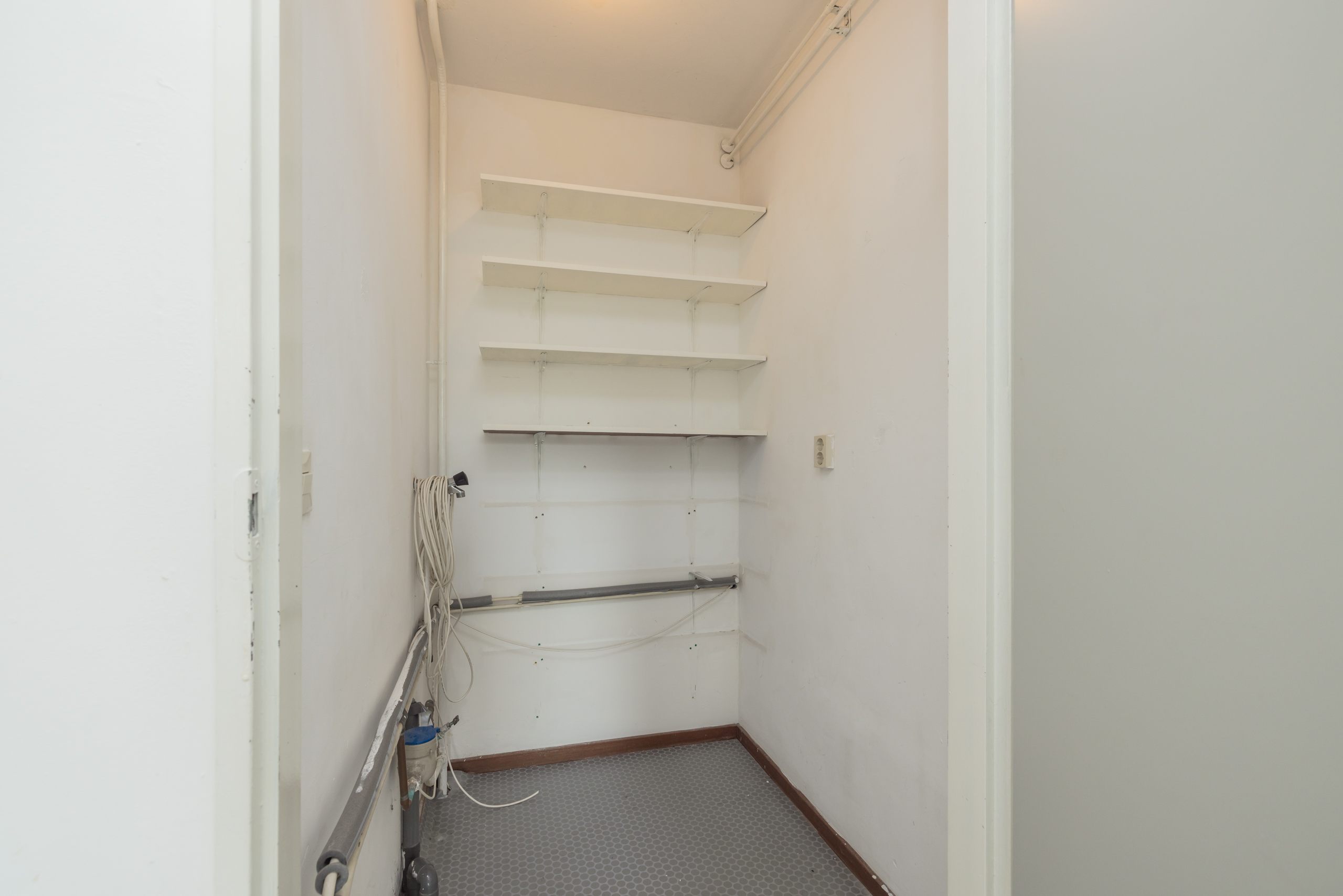Begane grond: afgesloten entree met bellentableau en camera, hal en trappenhuis. Aparte entree naar ruime inpandige berging (ca. 2,60 x 2,20 m).