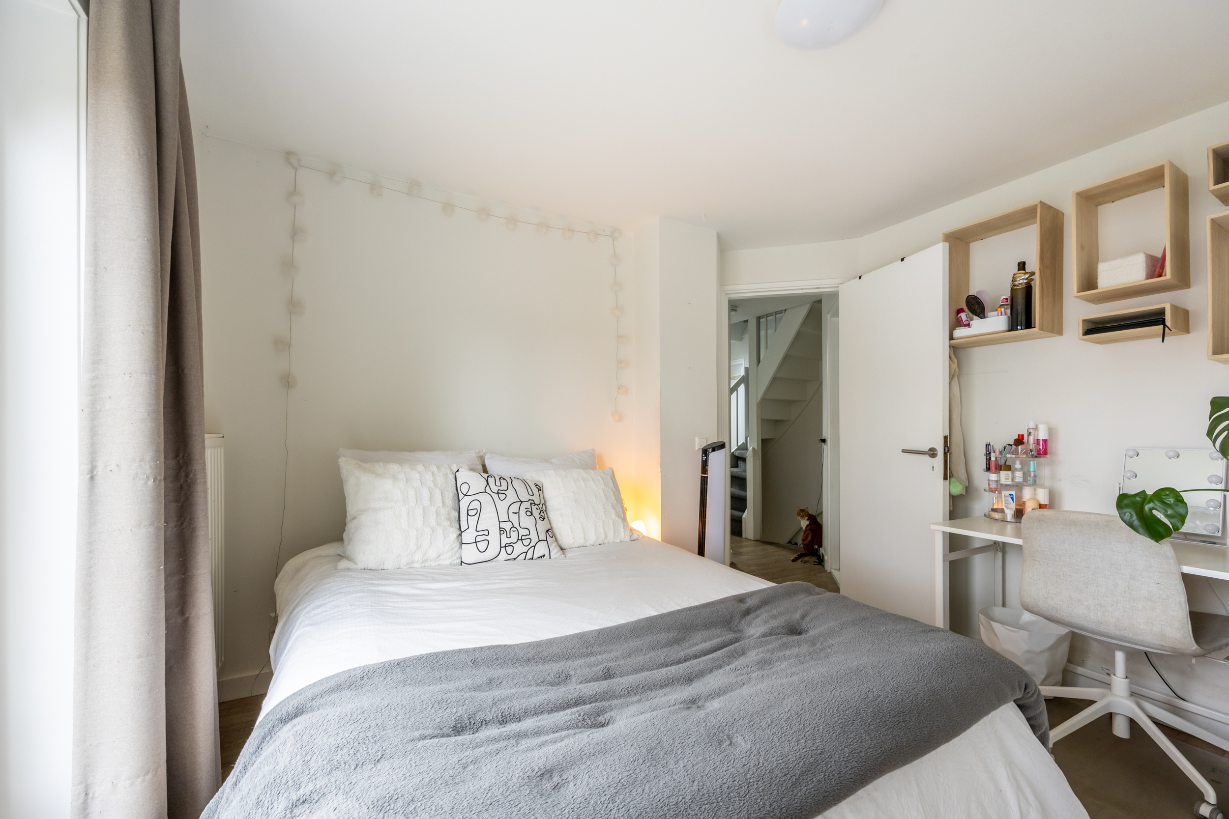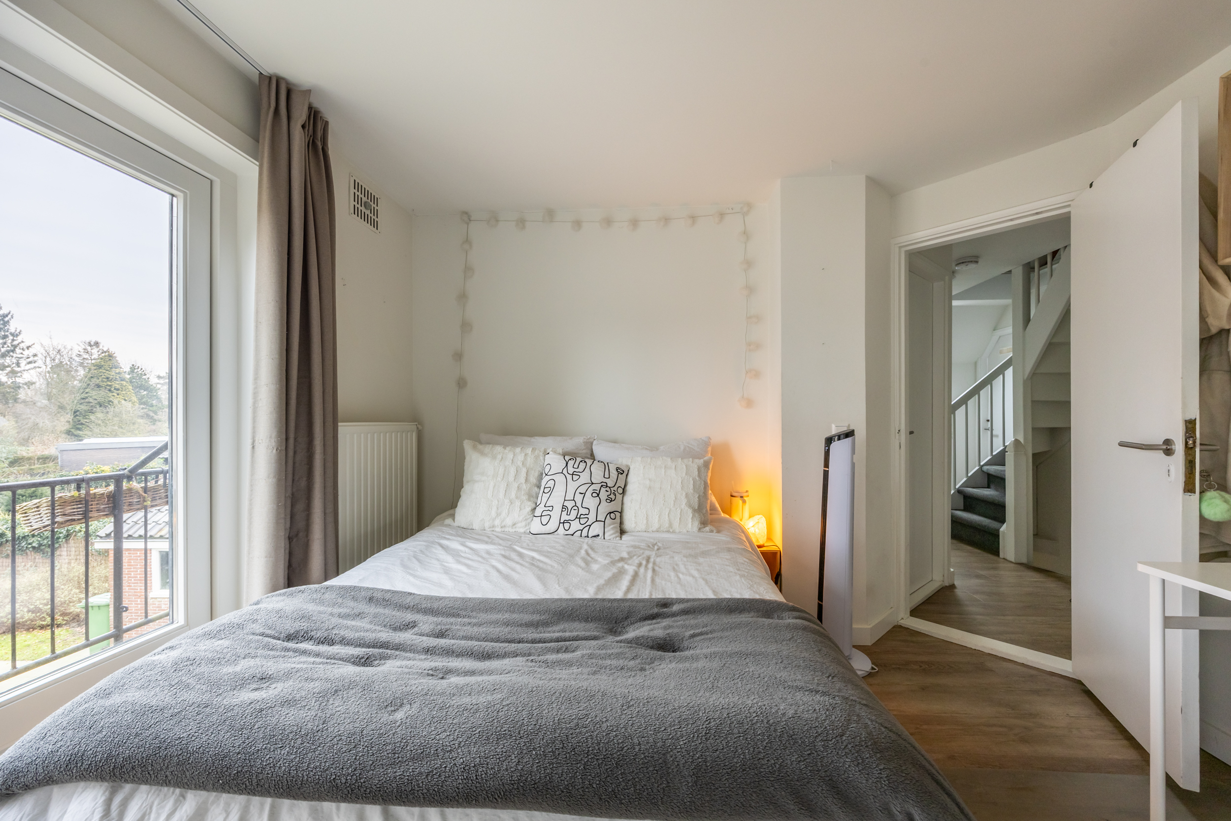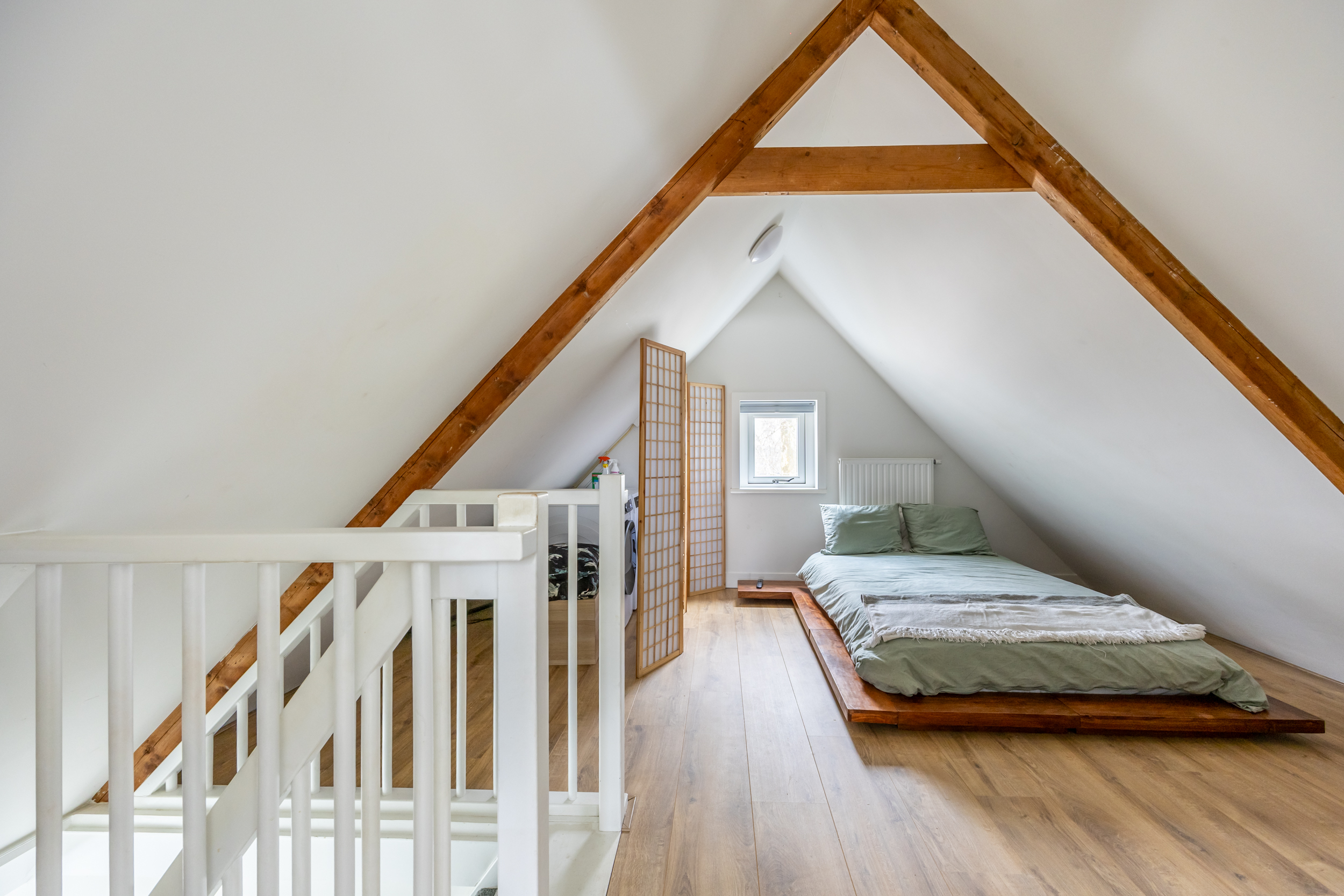 Via de vaste trap bereikt je de tweede verdieping welke is voorzien van een grote voorzolder met opstelplaats voor CV ketel en wasmachine aansluiting. Deze ruimte is prima geschikt als aparte (thuis)werkruimte of slaapplaats voor logees. De grote slaapkamer aan achterzijde heeft een fraai uitzicht en is door het grote raam heerlijk licht.