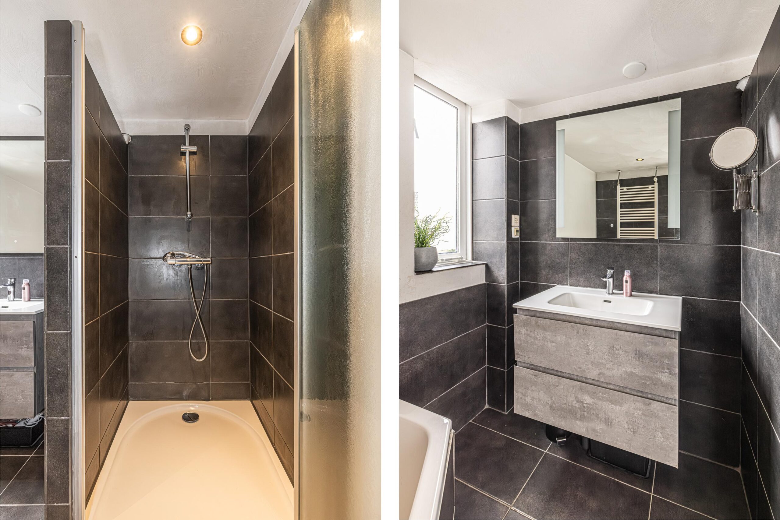 De badkamer is voorzien van modern wit sanitair en afgewerkt met antraciet gekleurd tegelwerk. De badkamer beschikt over vloerverwarming, designradiator, en er is een luxe spiegel geplaatst met verlichting en verwarming. Aan achterzijde bevindt zich een riante 2e slaapkamer (voorheen 2 slaapkamers en eenvoudig weer te splitsen) welke eveneens is voorzien van een kastenwand. Vanaf de overloop via een vaste open trap naar de 2e verdieping.