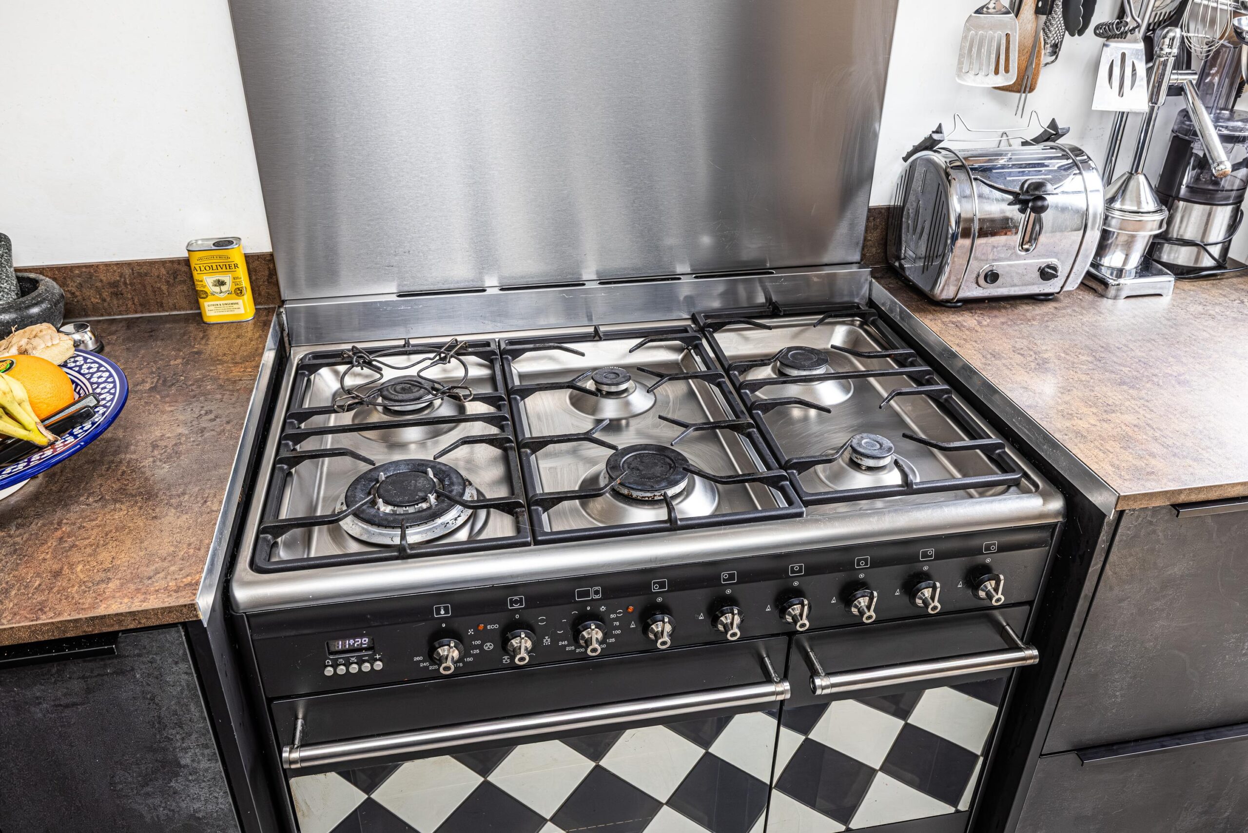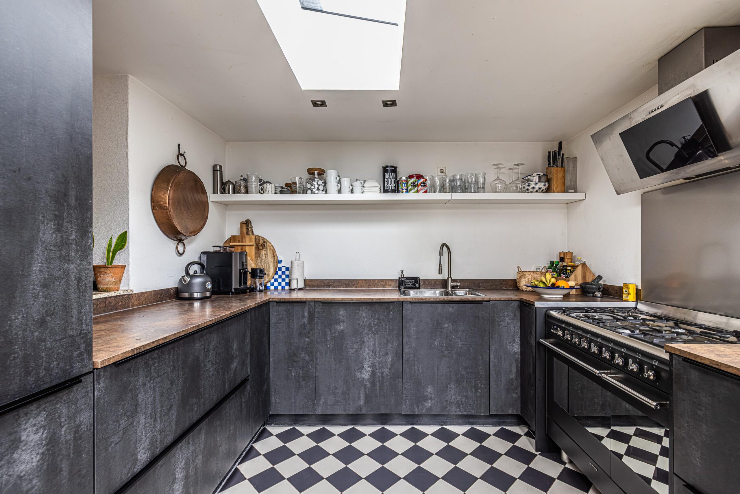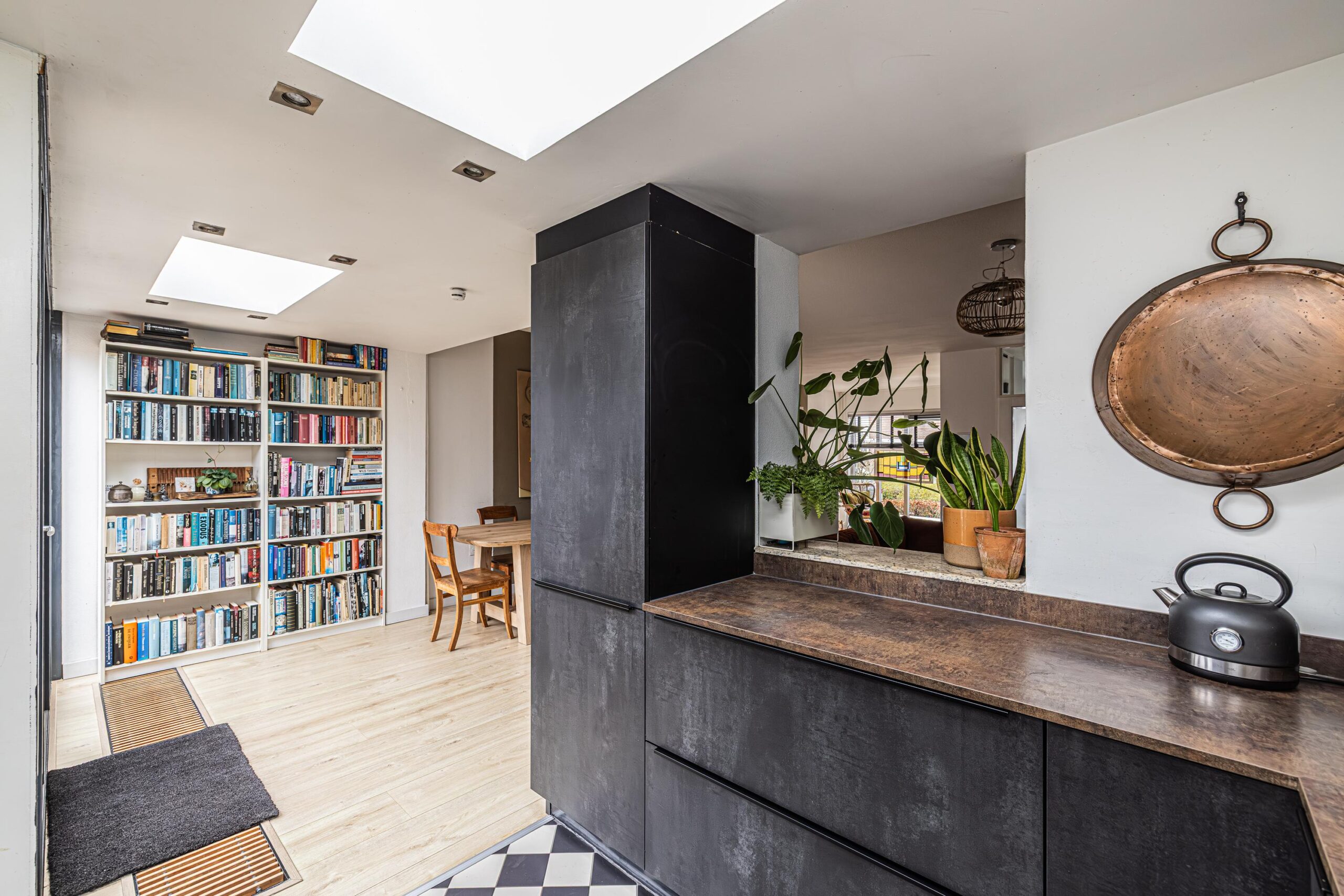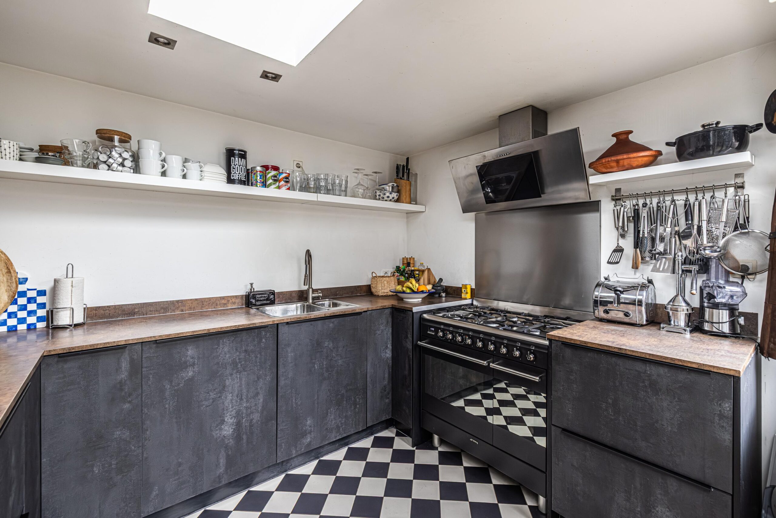 - In de keuken is rondom de lichtstraten ingebouwde verlichting aangebracht in de vorm van spots.