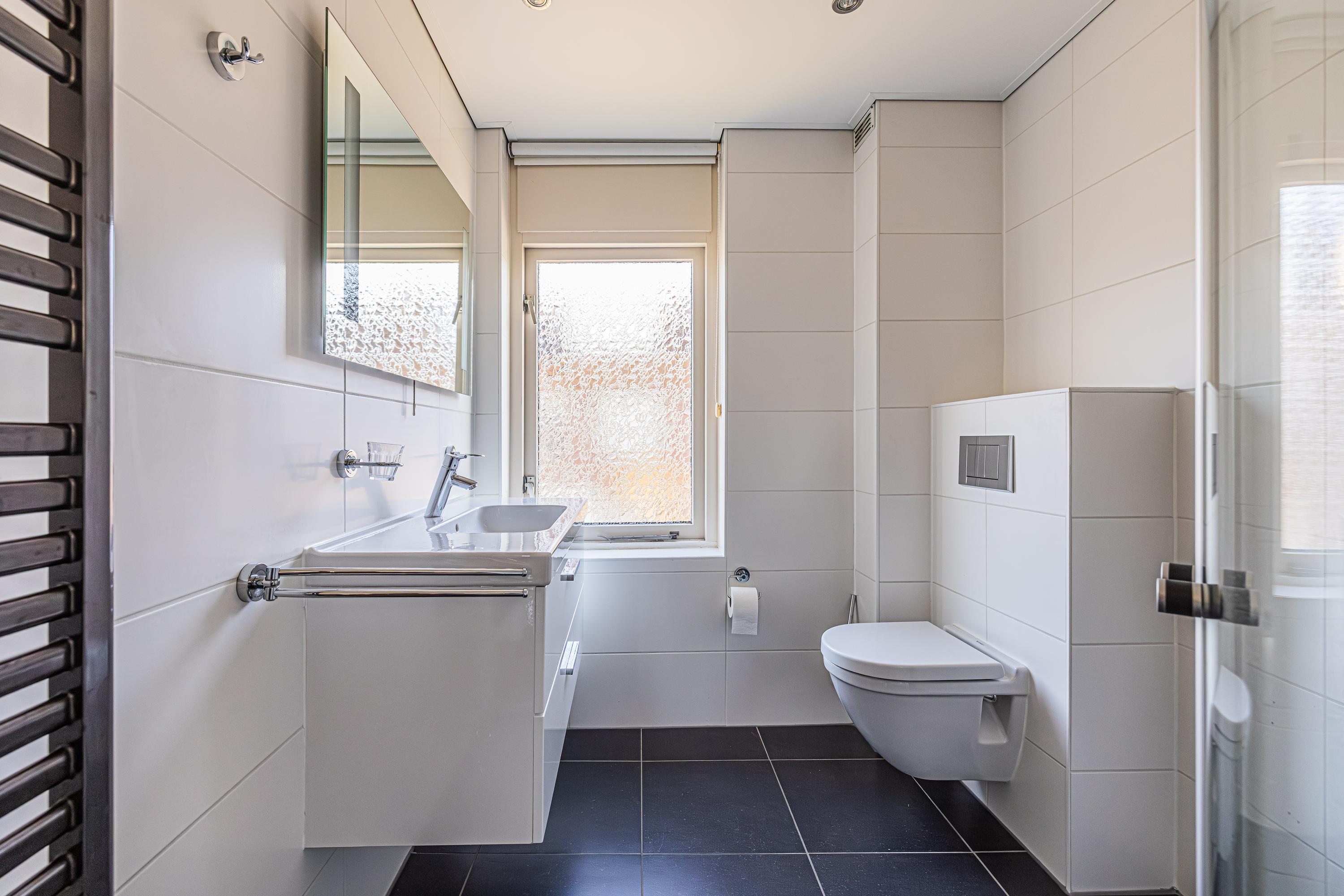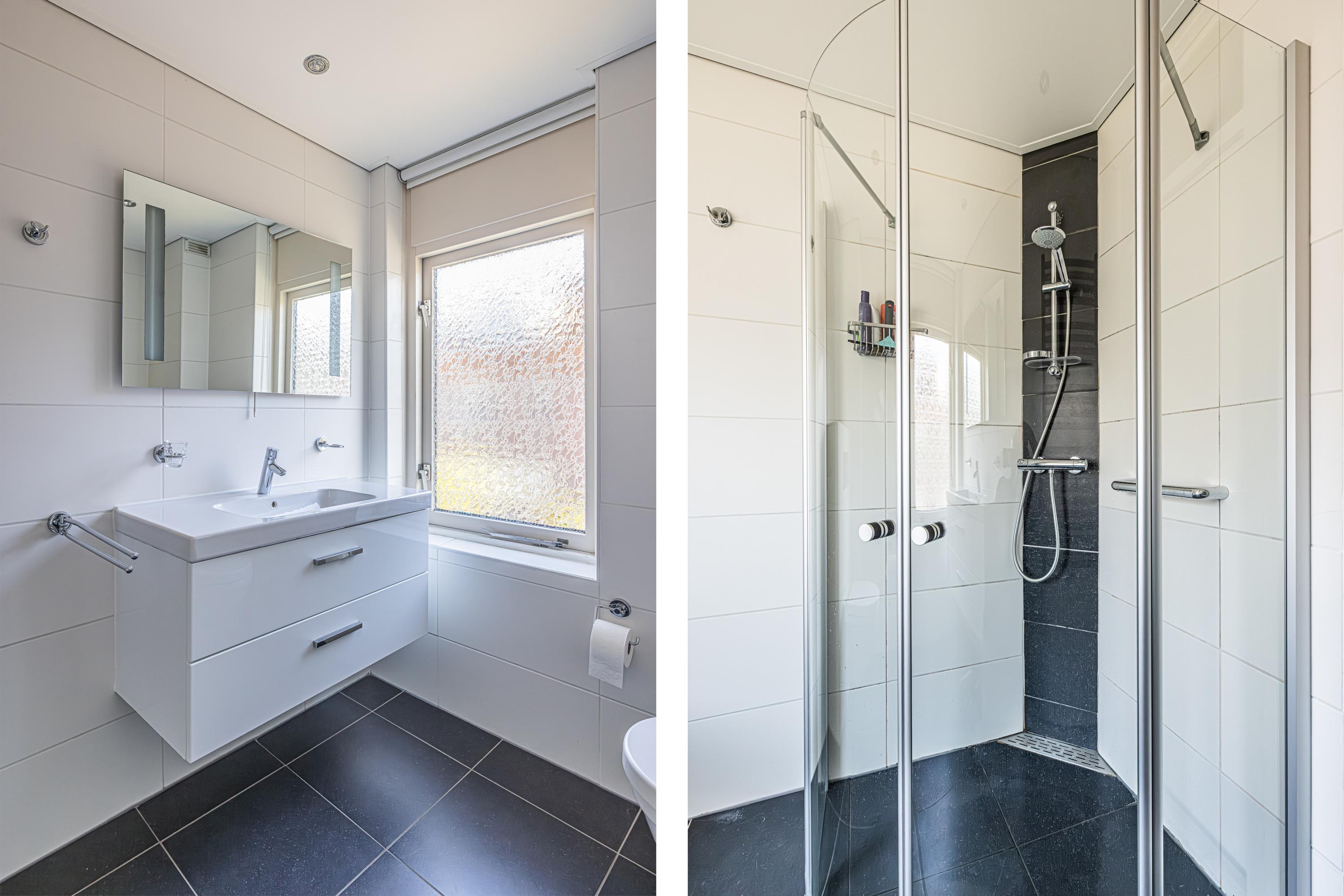 De badkamer is voorzien van een douche met scherm, vaste wastafel met meubel en een tweede toilet met vrij hangend closet. Het geheel is
