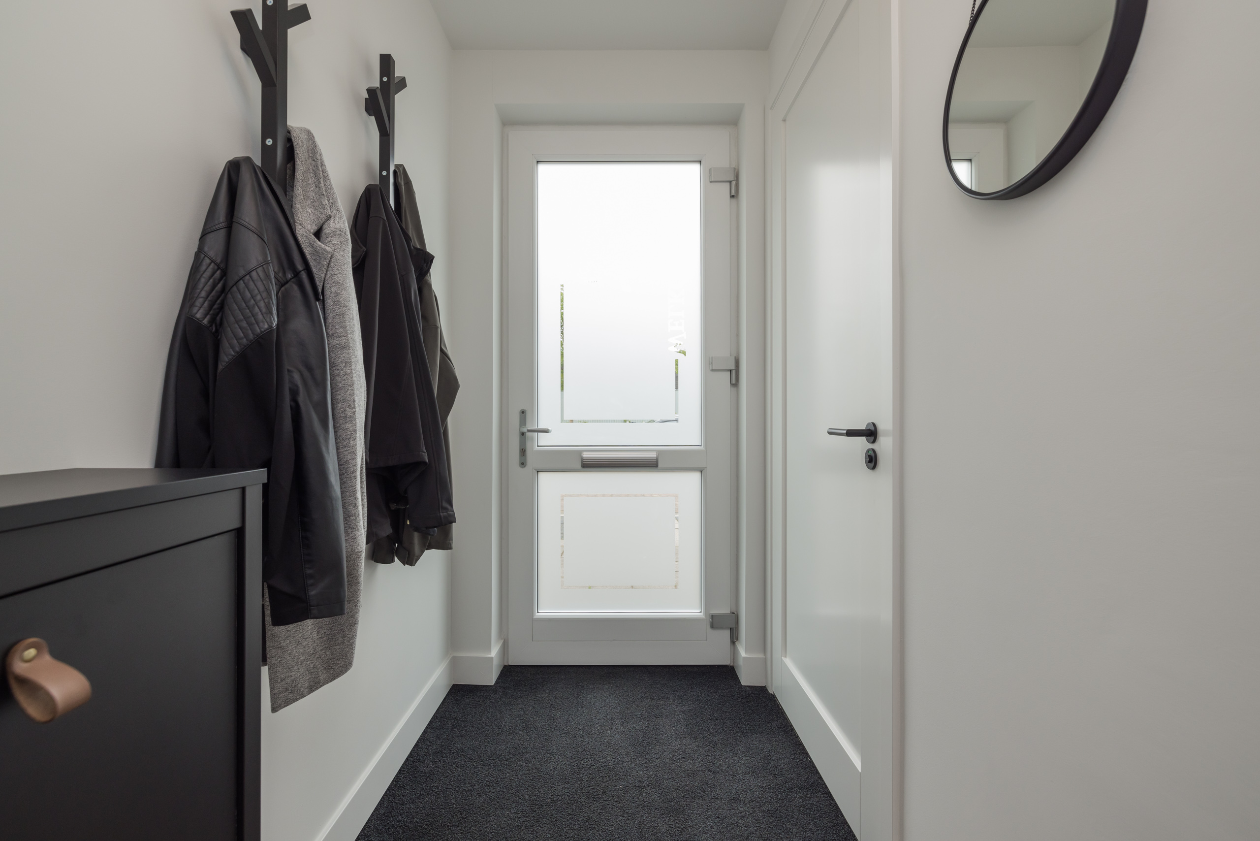 - Kunststof kozijnen aan buitenzijde met draai-/kiepramen en horren.