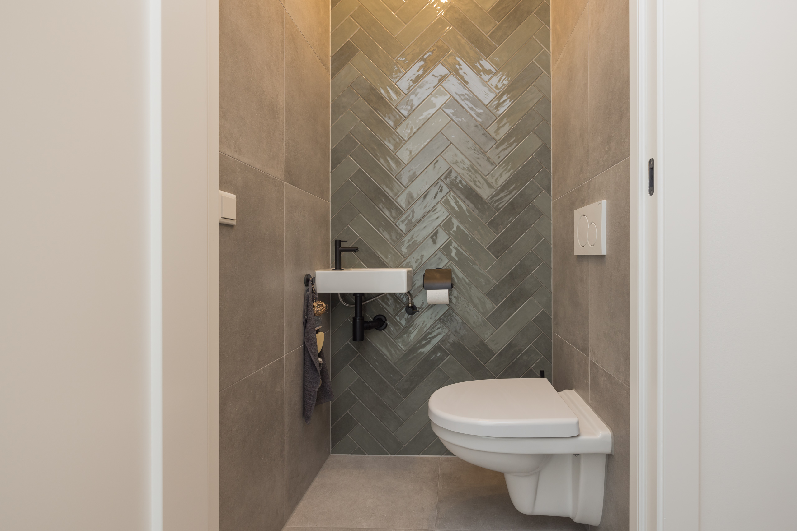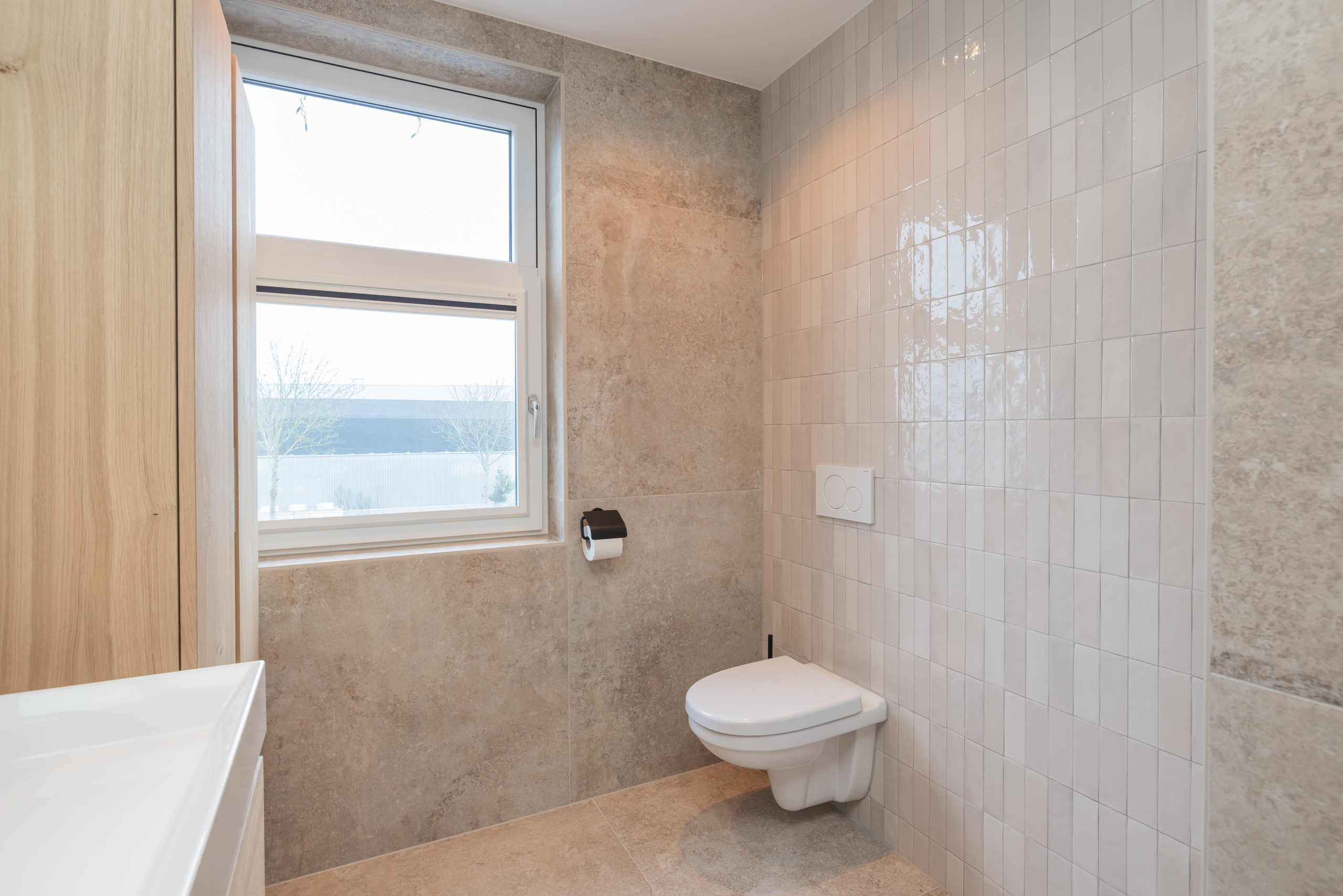 glazen deur en regendouche. Een modern badkamer met dubbele vaste wastafel en een 2e toilet met vrij hangend closet. De badkamer is heerlijk licht door het raam en volledig afgewerkt met grote lichte wand en vloertegels, modern sanitair compleet met donkere (thermostaat) kranen, designradiator alsmede ingebouwde plafondverlichting middels (LED) spots.