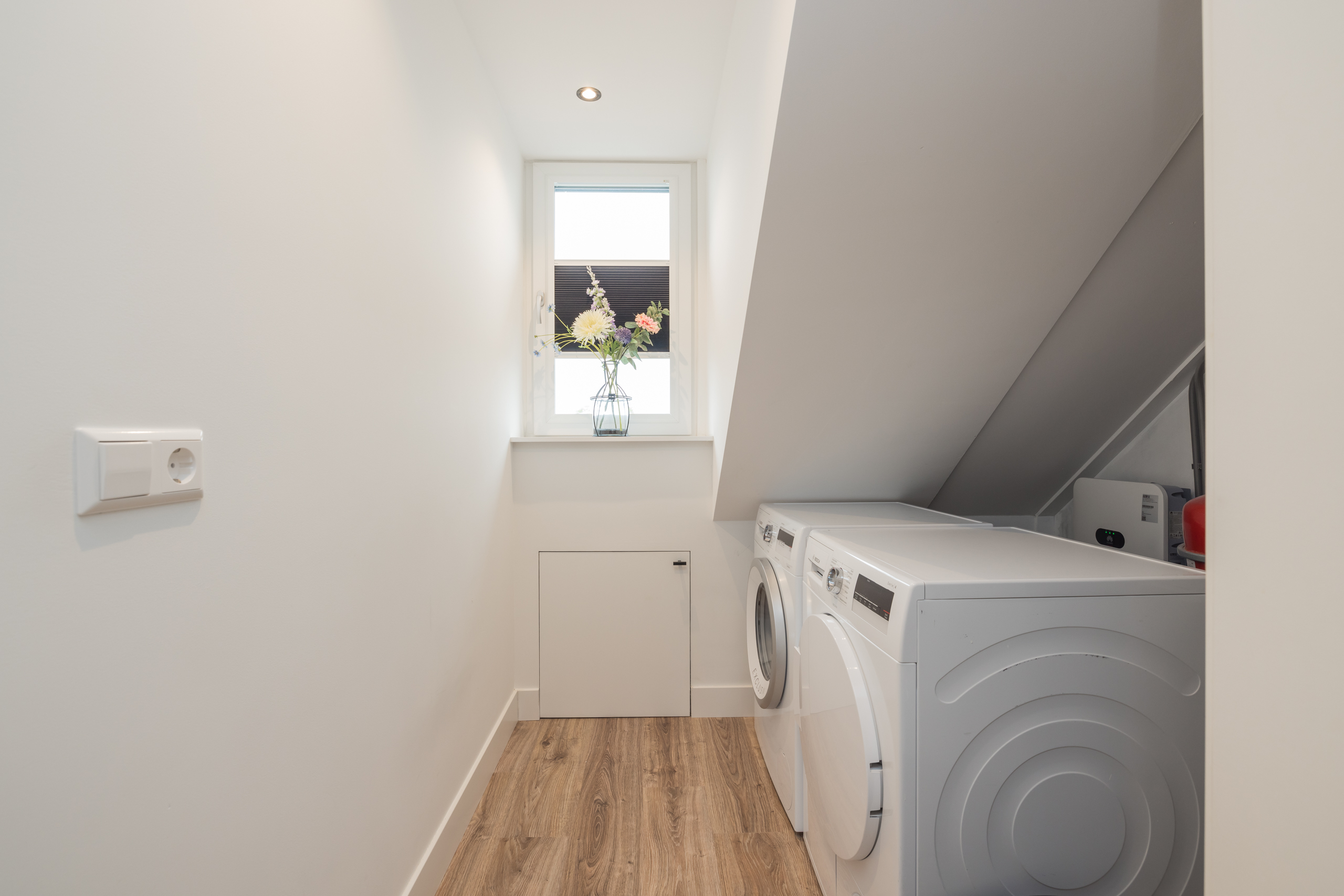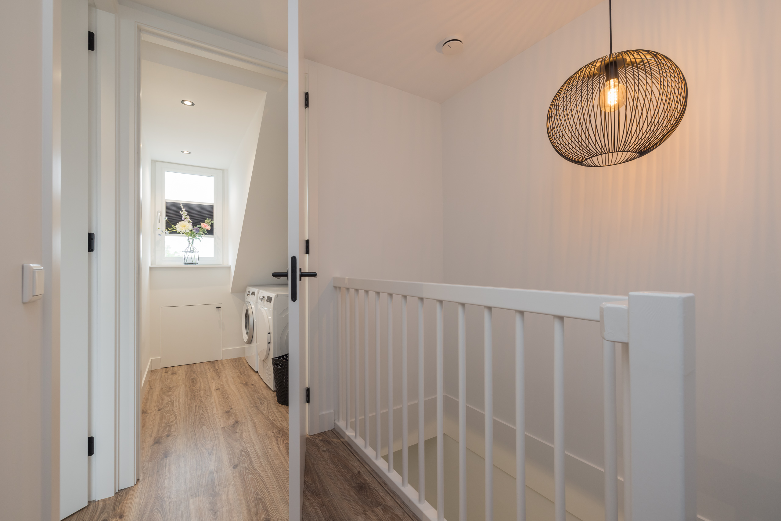 Brede overloop met aan de voorzijde een waskamer met dakkapel, aansluitingen voor de wasmachine- en droger alsmede de opstelplaats van de c.v.-combiketel.