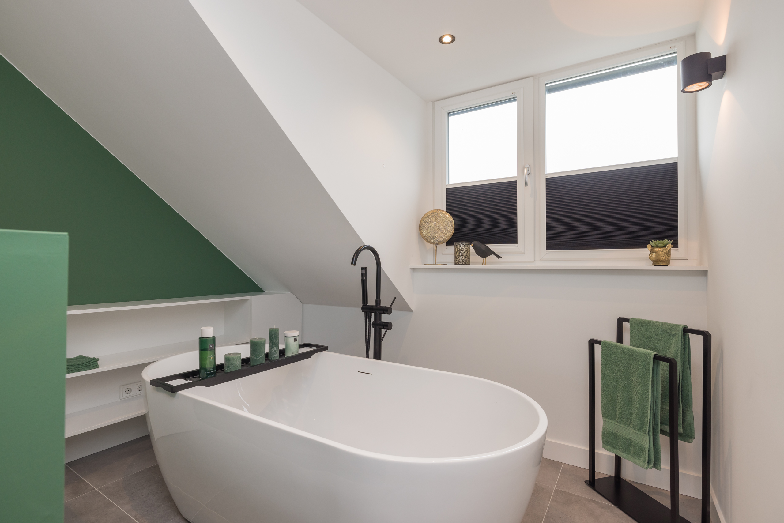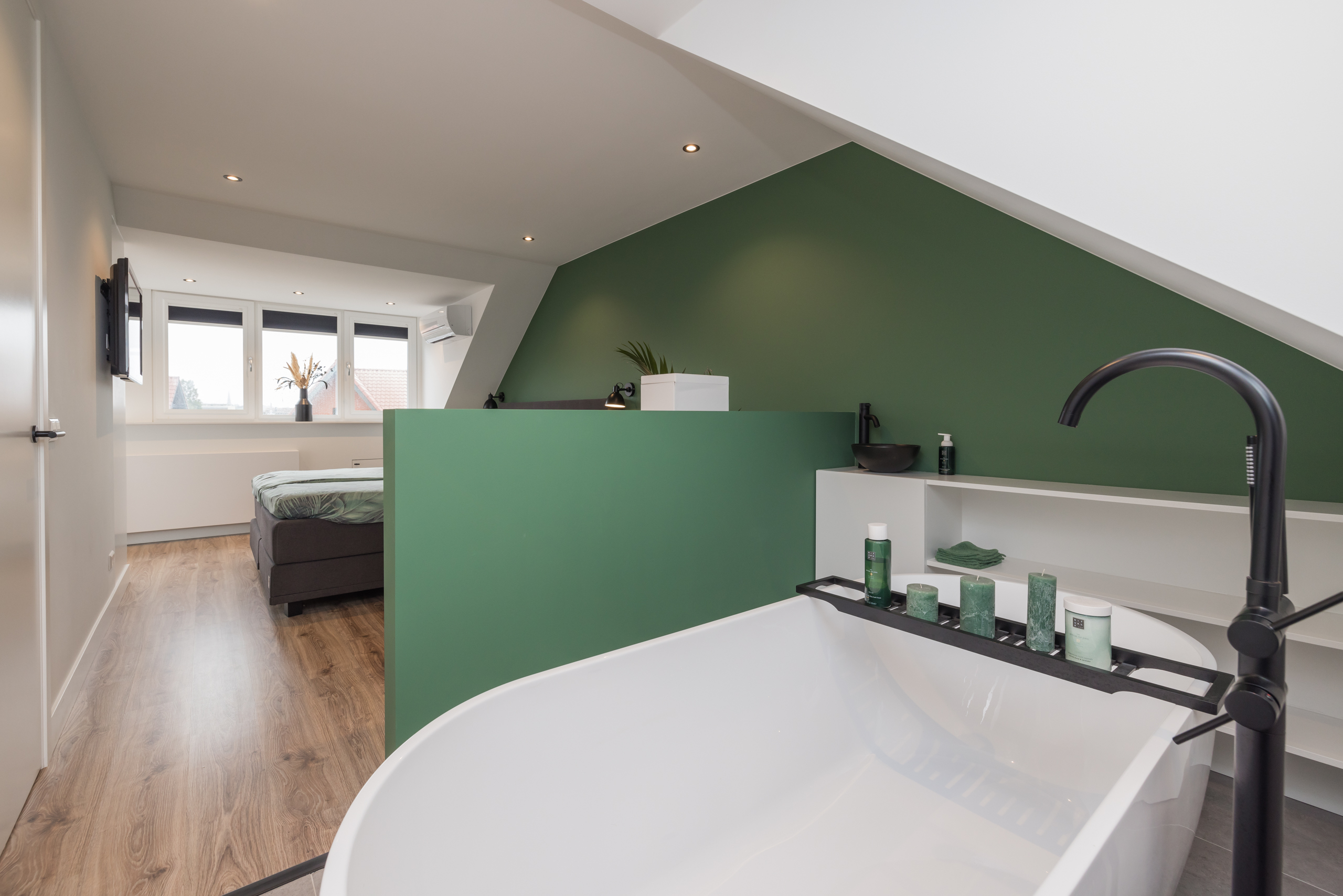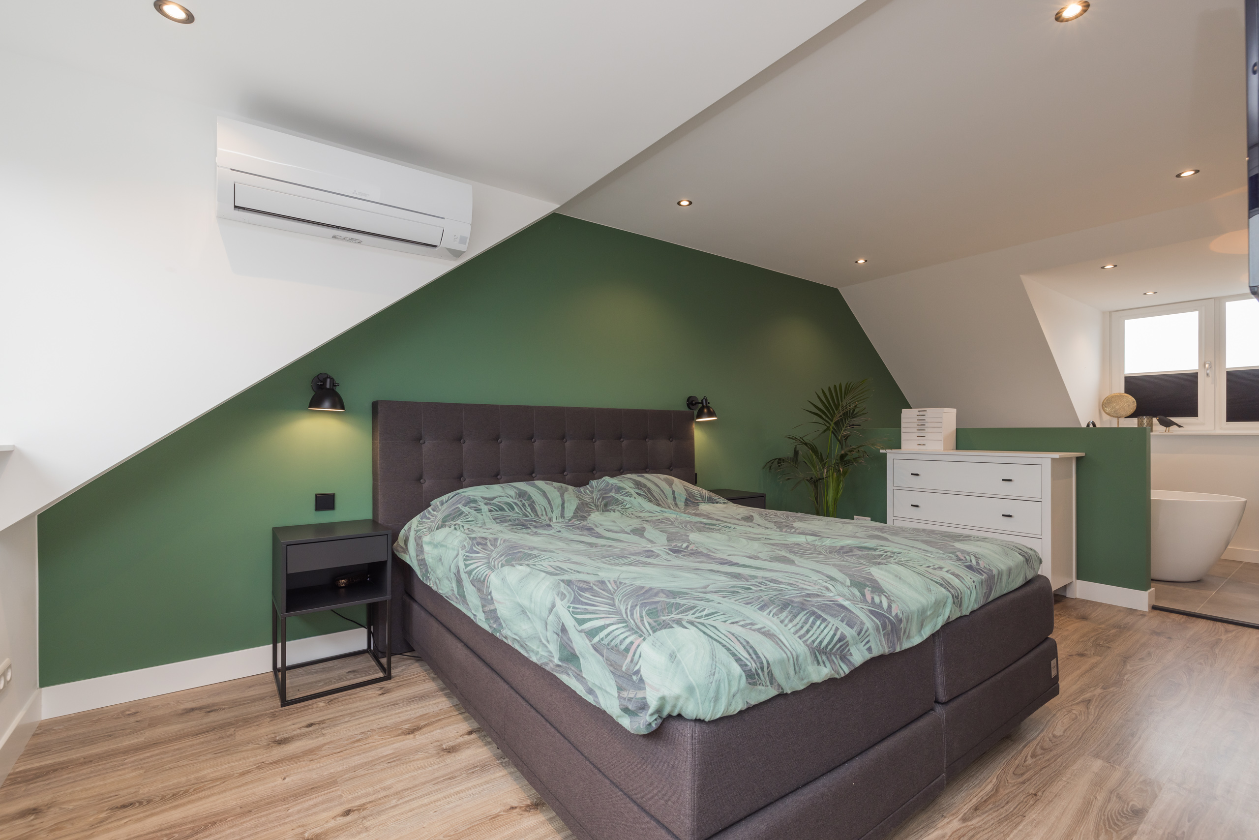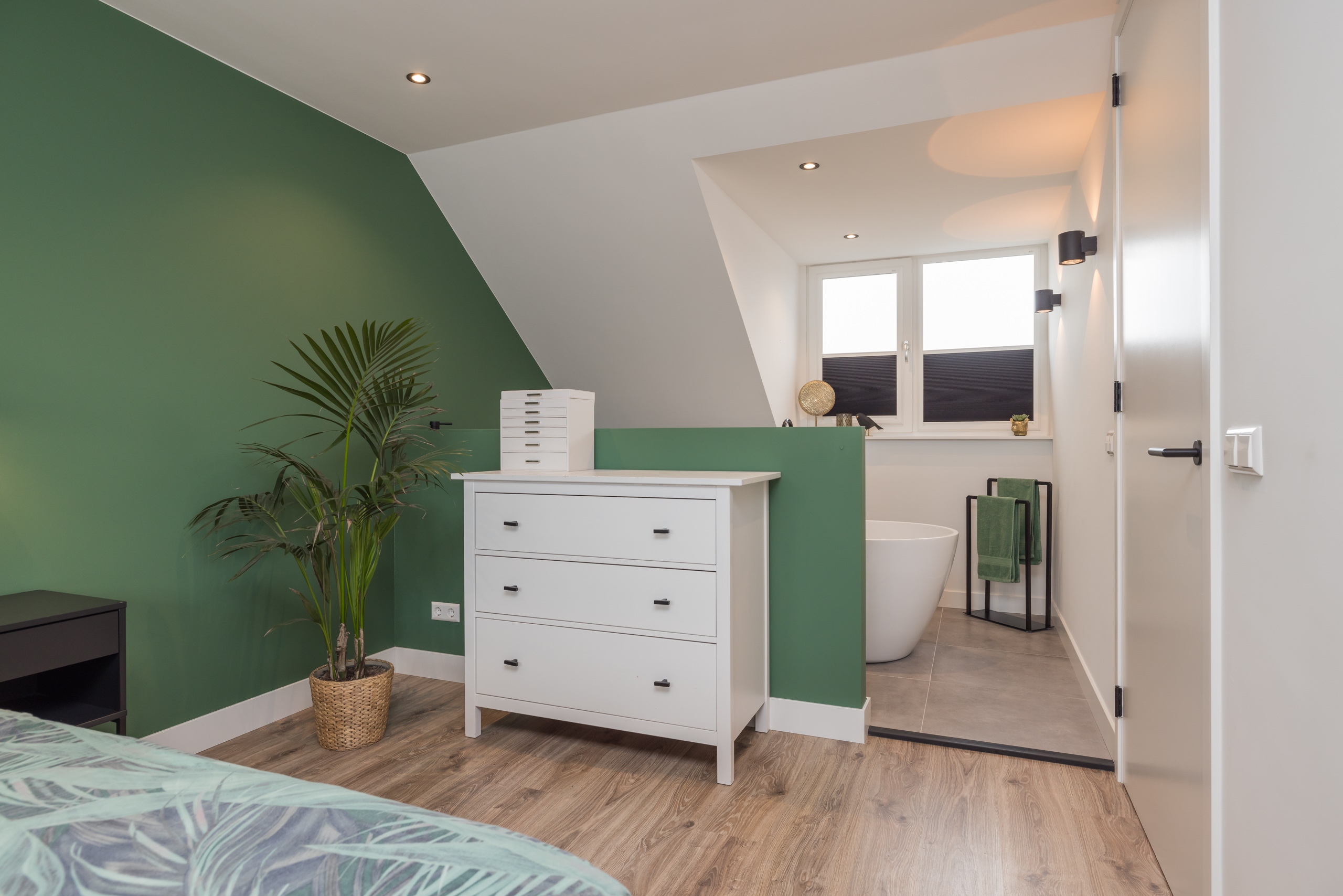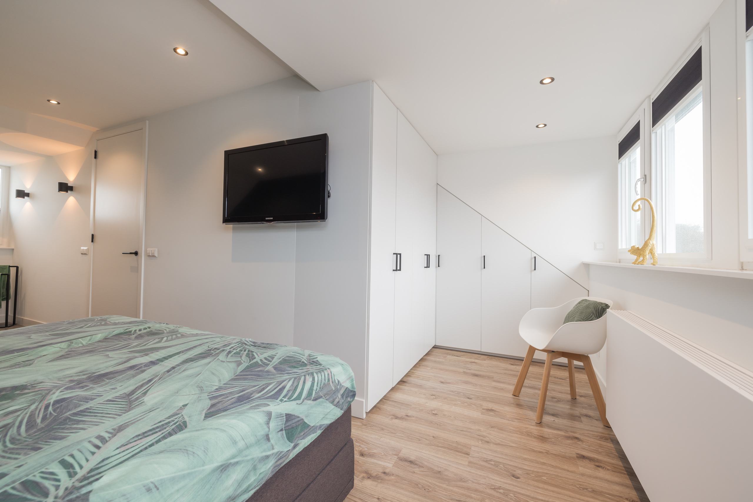 Aan zowel de voorzijde als aan de achterzijde is een brede dakkapel geplaatst (2021) waardoor het geheel nog ruimtelijker en lichter maakt. Het slaapgedeelte is ruim en uitgevoerd met een brede kastenwand en aan de voorzijde het luxe badgedeelte (2021) met een vrijstaand bad, badmeubel en waskom.