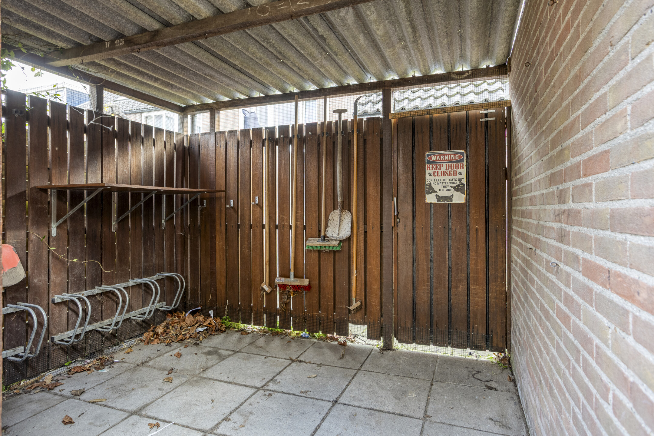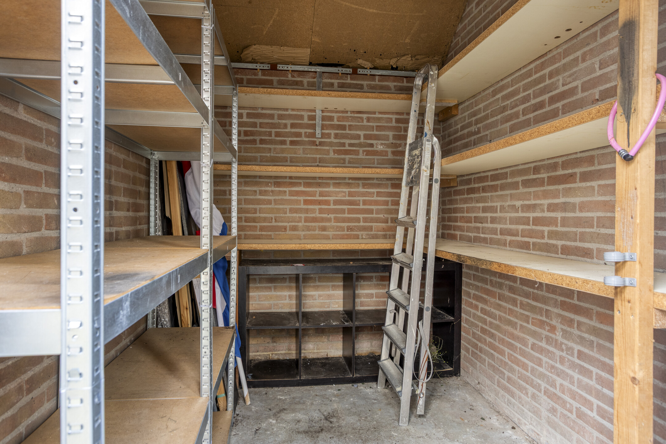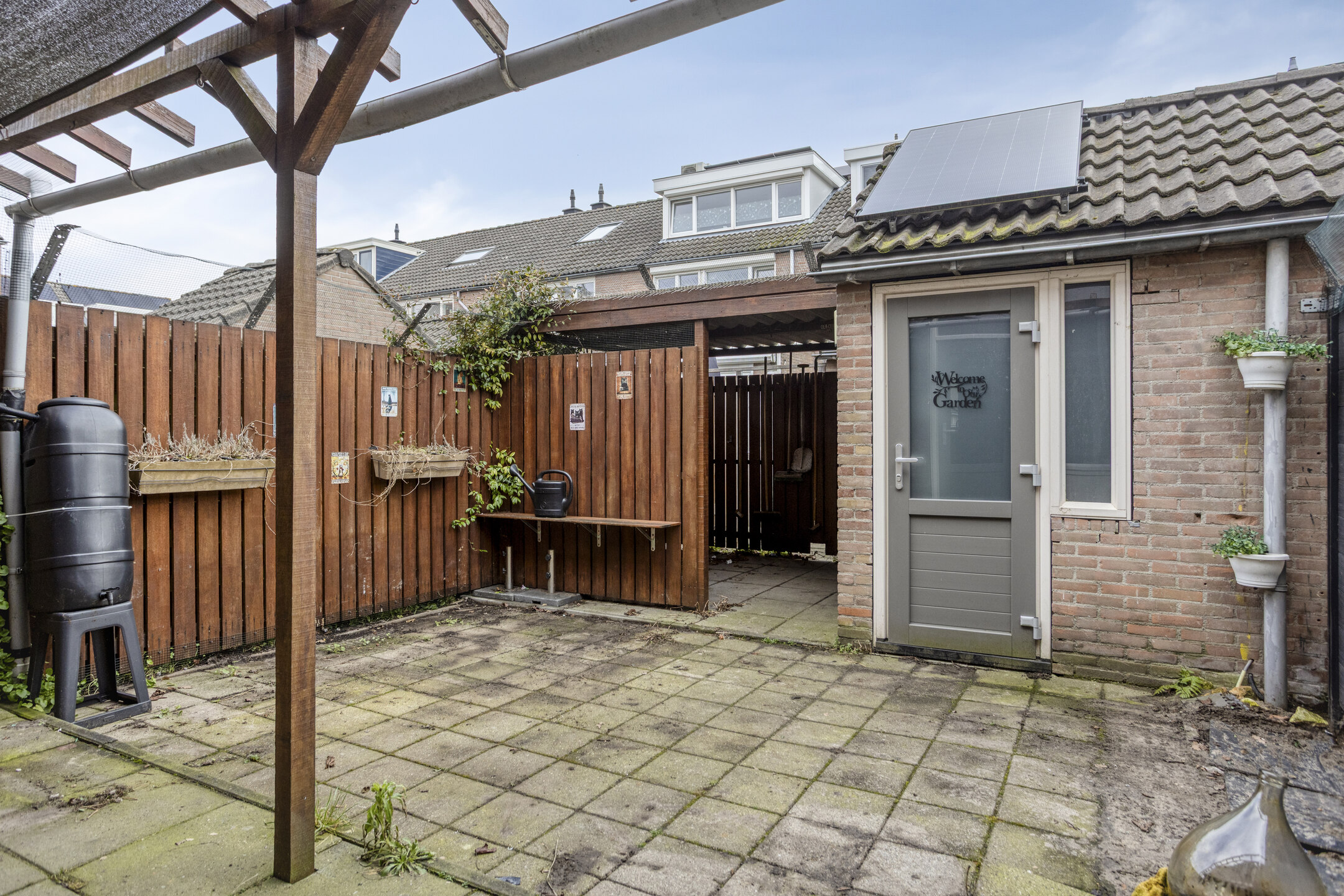 De tuin ligt perfect op het zuidoosten—gehele dag zon! Achterin staat een vrijstaande stenen schuur met elektra en een handige overkapping die doorloopt naar de achterom. Ruimte voor fietsen, klussen of lange zomeravonden.