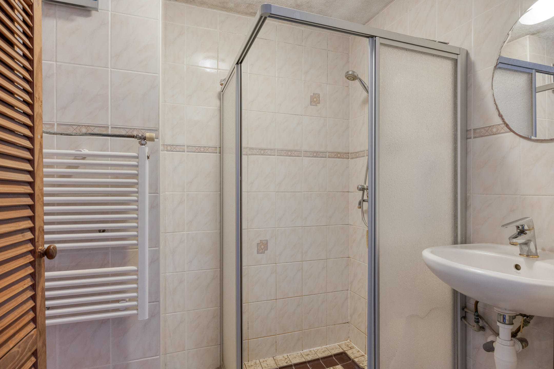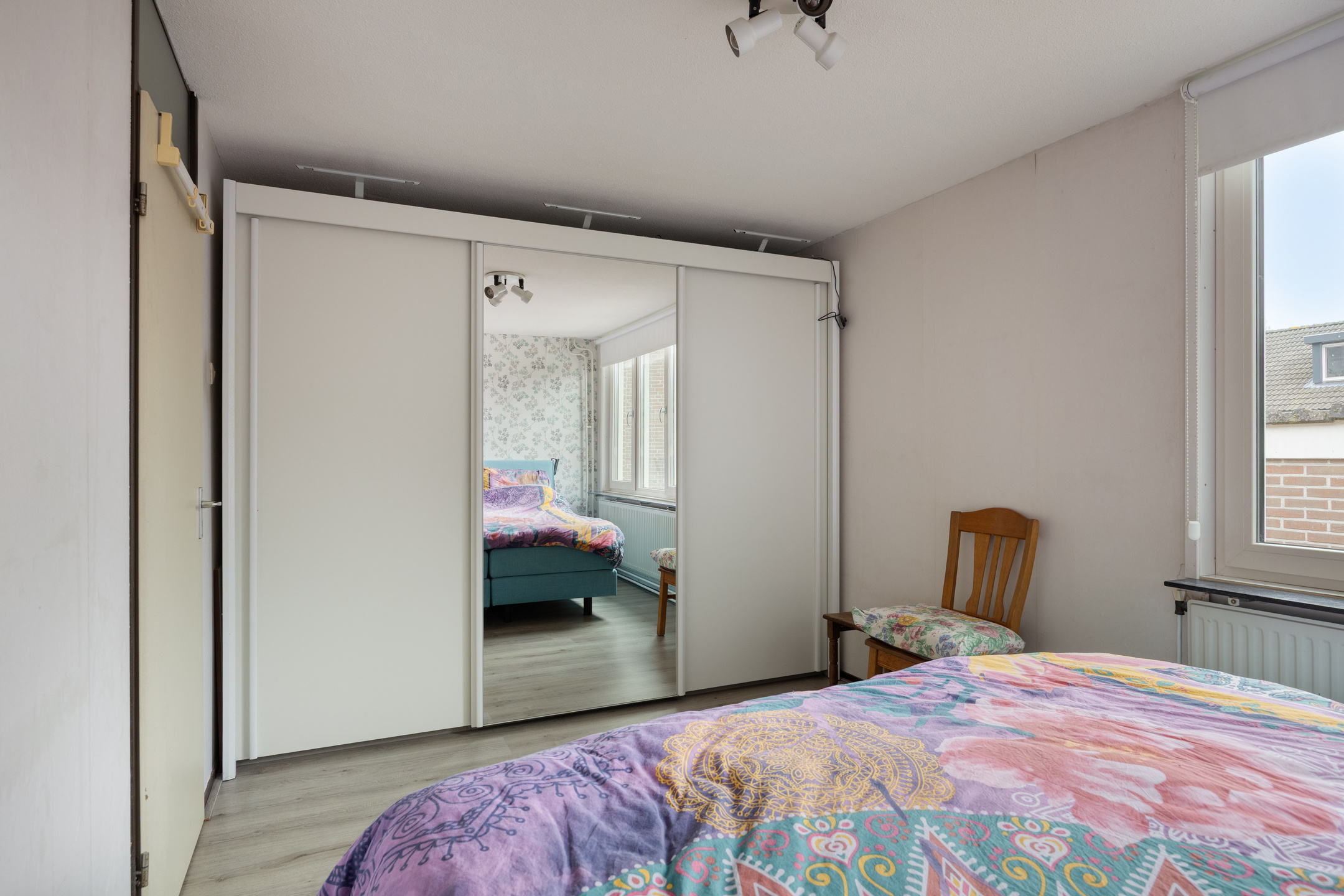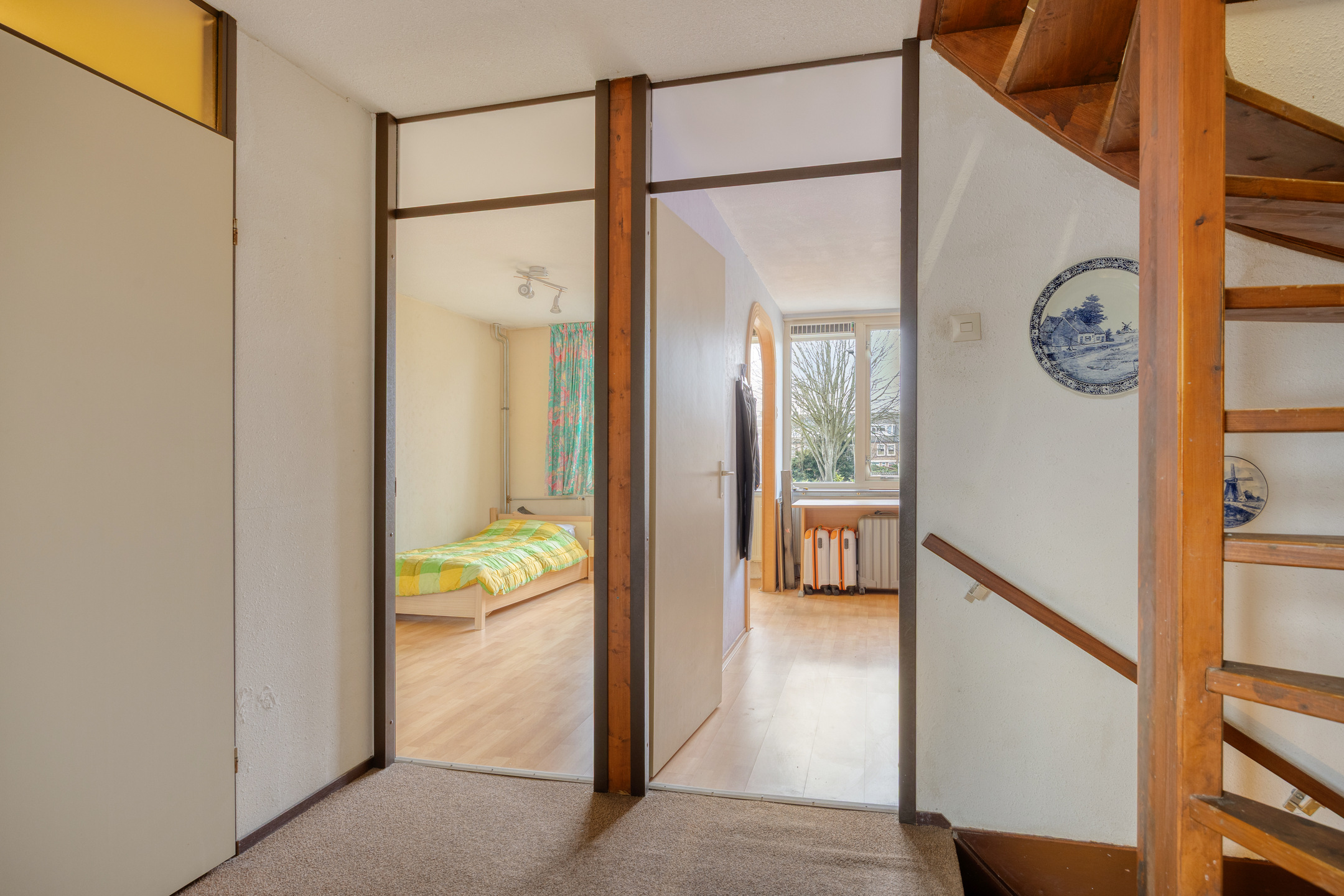 De overloop geeft toegang tot drie royale slaapkamers. Aan de voorzijde een woningbrede kamer met vaste kastenwand. Aan de achterzijde een ruime ouderslaapkamer, ontstaan uit twee kamers en eenvoudig weer terug te brengen naar de oorspronkelijke indeling. De badkamer is functioneel, met douche en vaste wastafel.