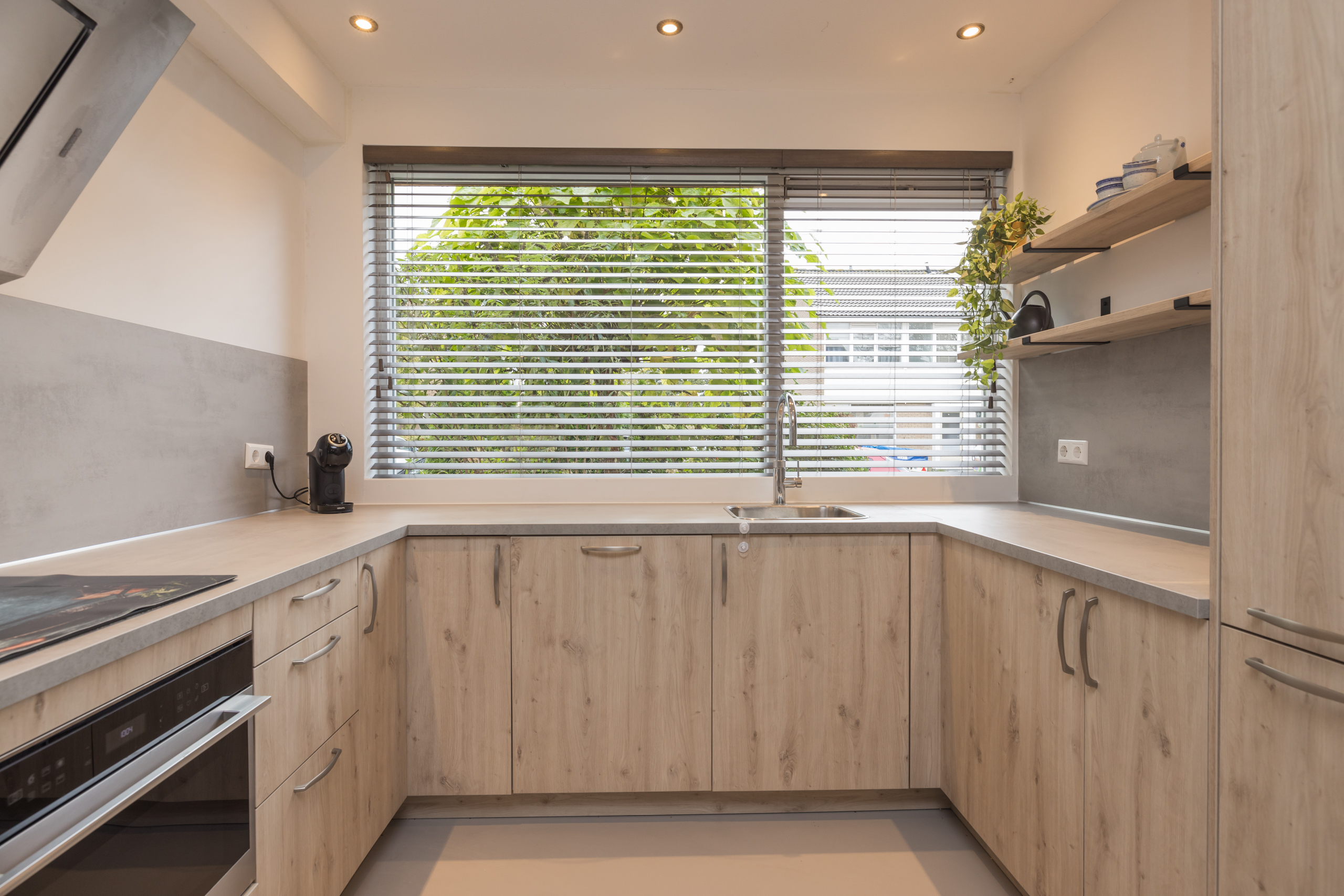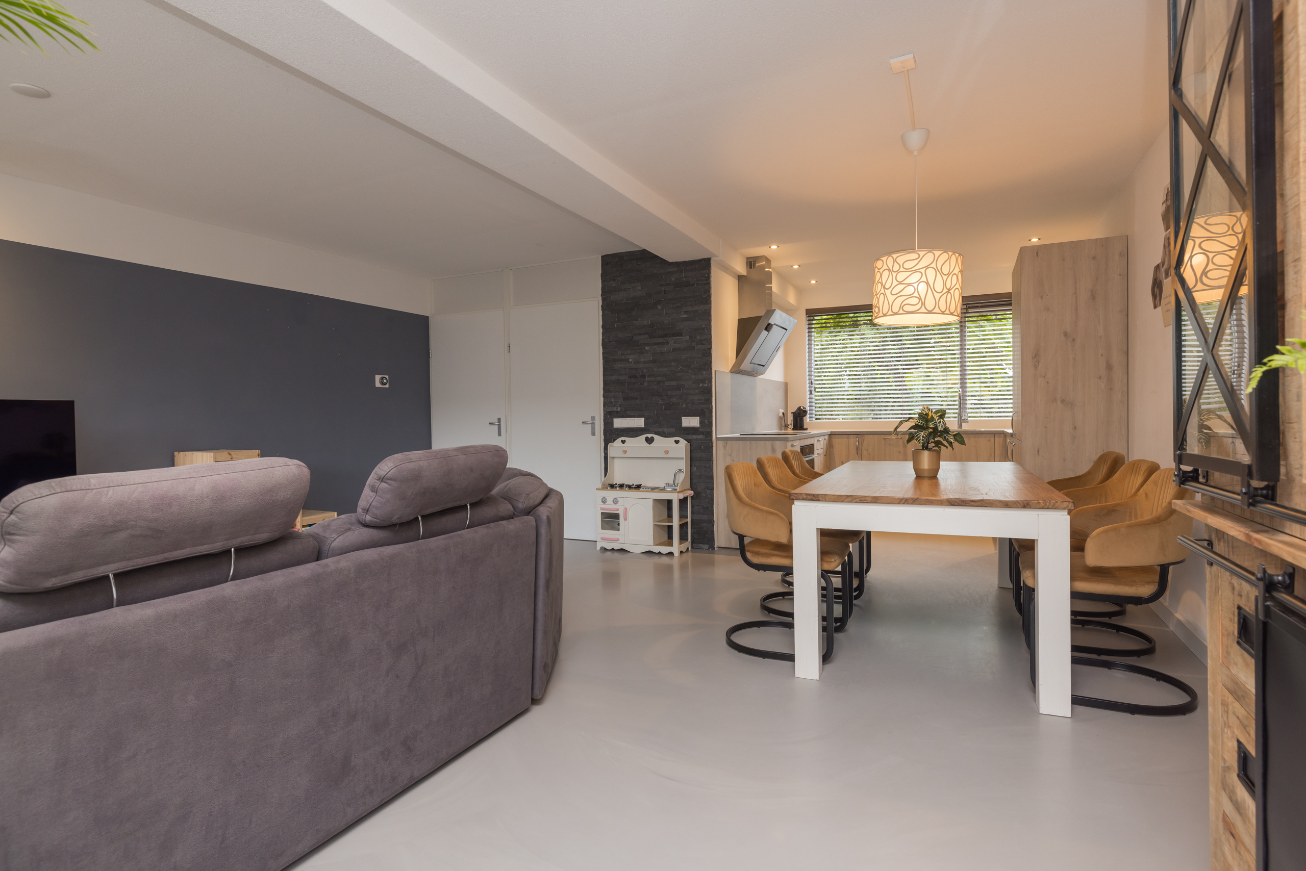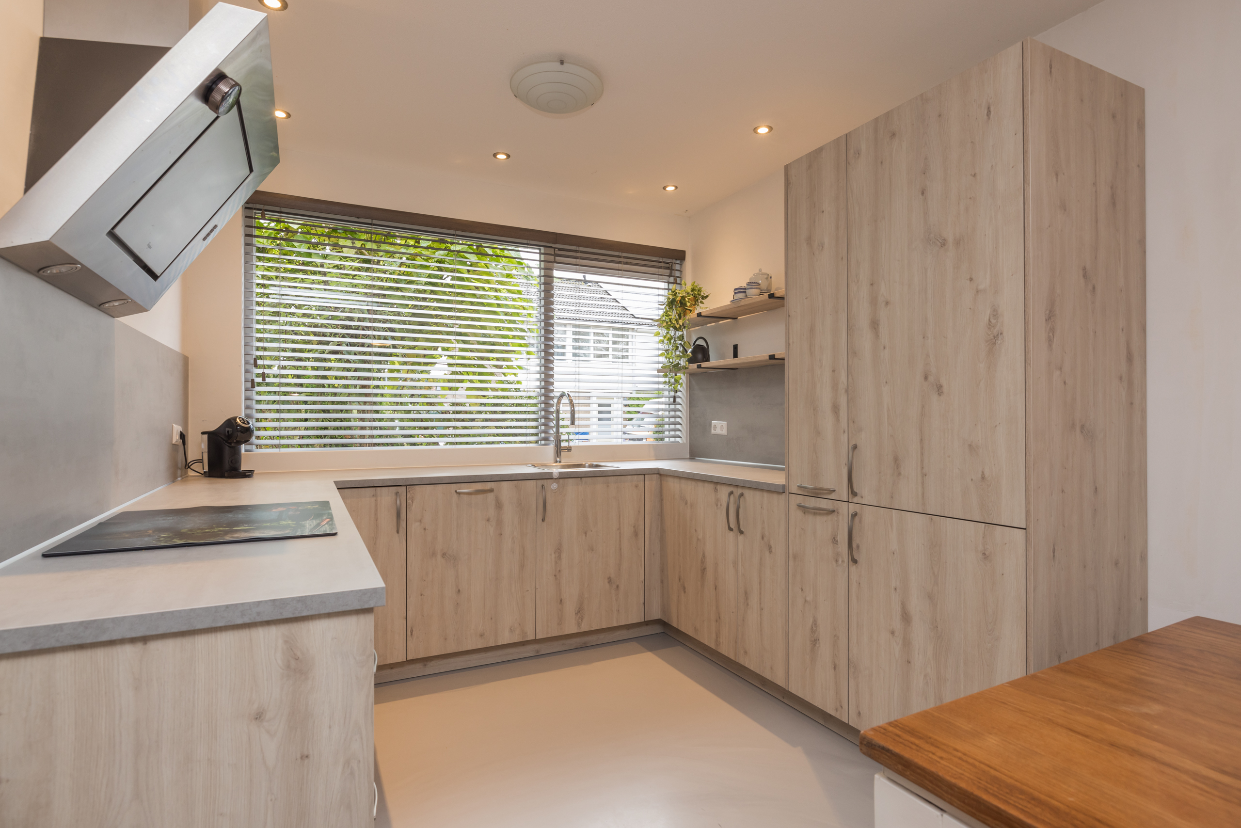Zodra je binnenstapt, valt het op: alles klopt. De hal met garderobe en modern toilet brengt je naar de riante living met een strak afgewerkte gietvloer die naadloos overloopt in de moderne keuken. Inbouwspots zorgen voor warme accenten, terwijl de grote raampartij aan de achterzijde het daglicht rijkelijk binnenlaat. De keuken is recent vernieuwd in 2022 en uitgevoerd in een stijlvolle U-opstelling, met luxe inbouwapparatuur, quooker, combi-oven én meer.
