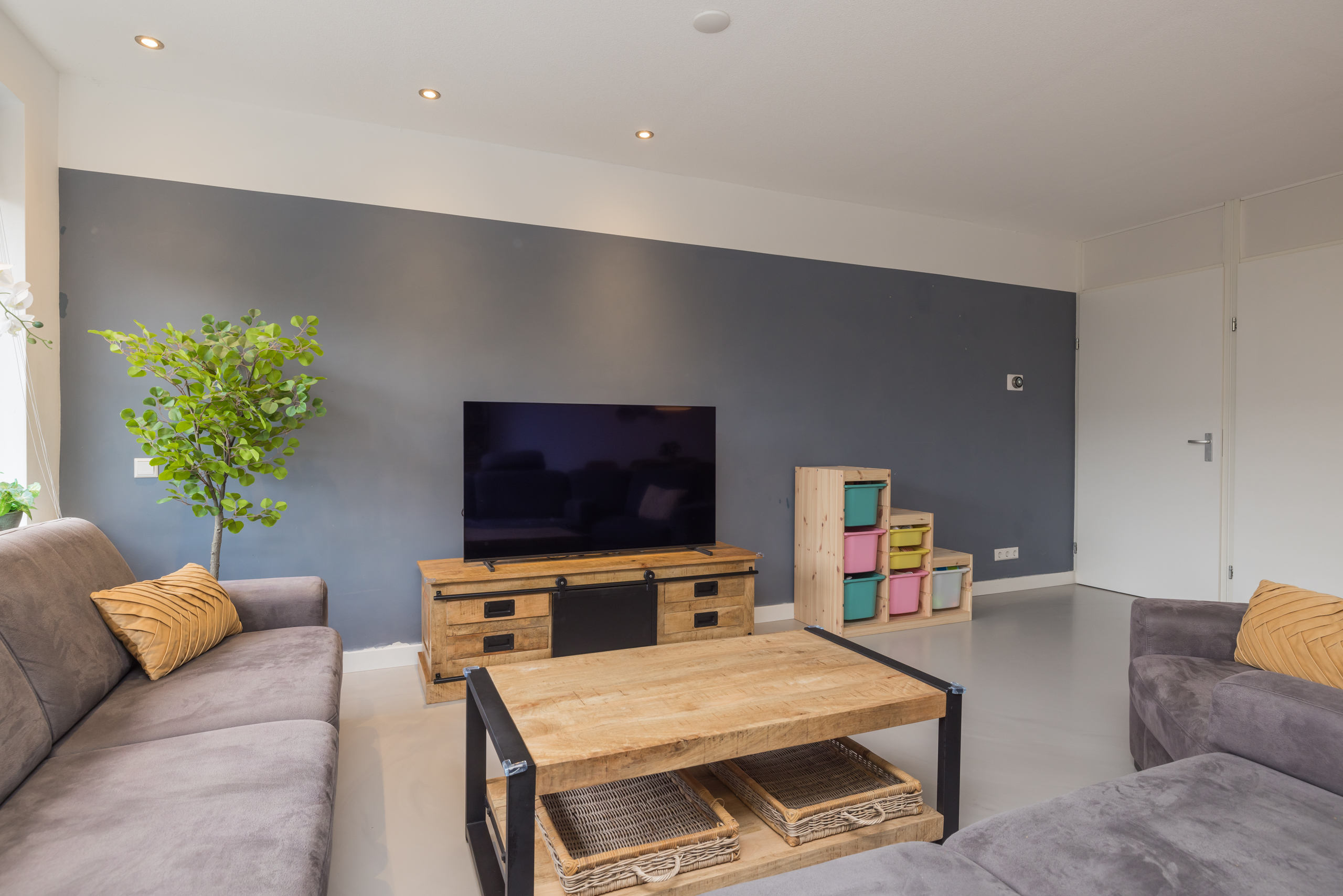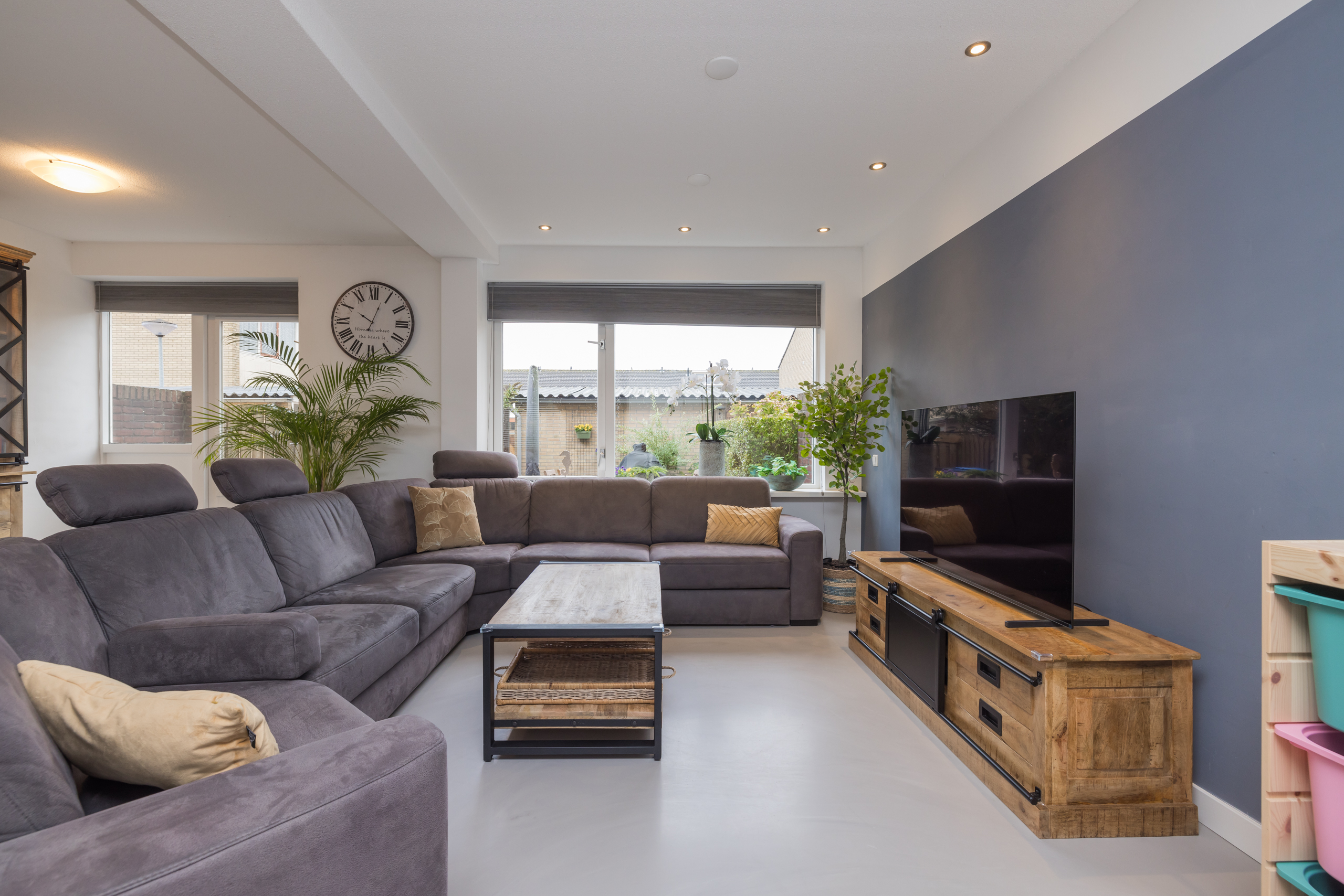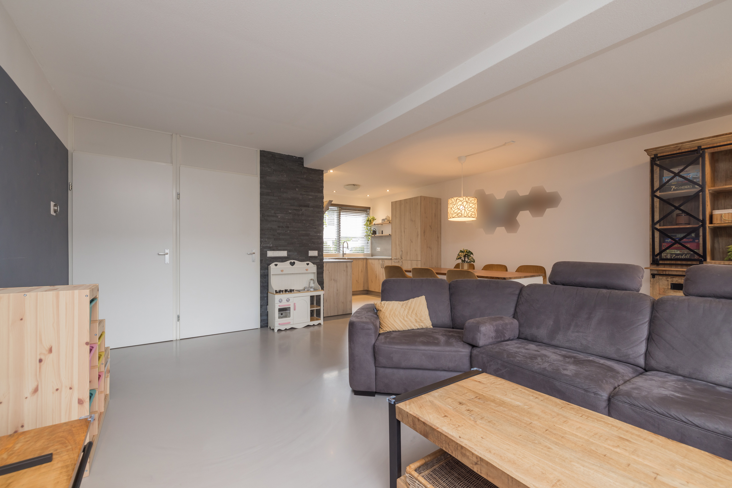 Zodra je binnenstapt, valt het op: alles klopt. De hal met garderobe en modern toilet brengt je naar de riante living met een strak afgewerkte gietvloer die naadloos overloopt in de moderne keuken. Inbouwspots zorgen voor warme accenten, terwijl de grote raampartij aan de achterzijde het daglicht rijkelijk binnenlaat. De keuken is recent vernieuwd in 2022 en uitgevoerd in een stijlvolle U-opstelling, met luxe inbouwapparatuur, quooker, combi-oven én meer.