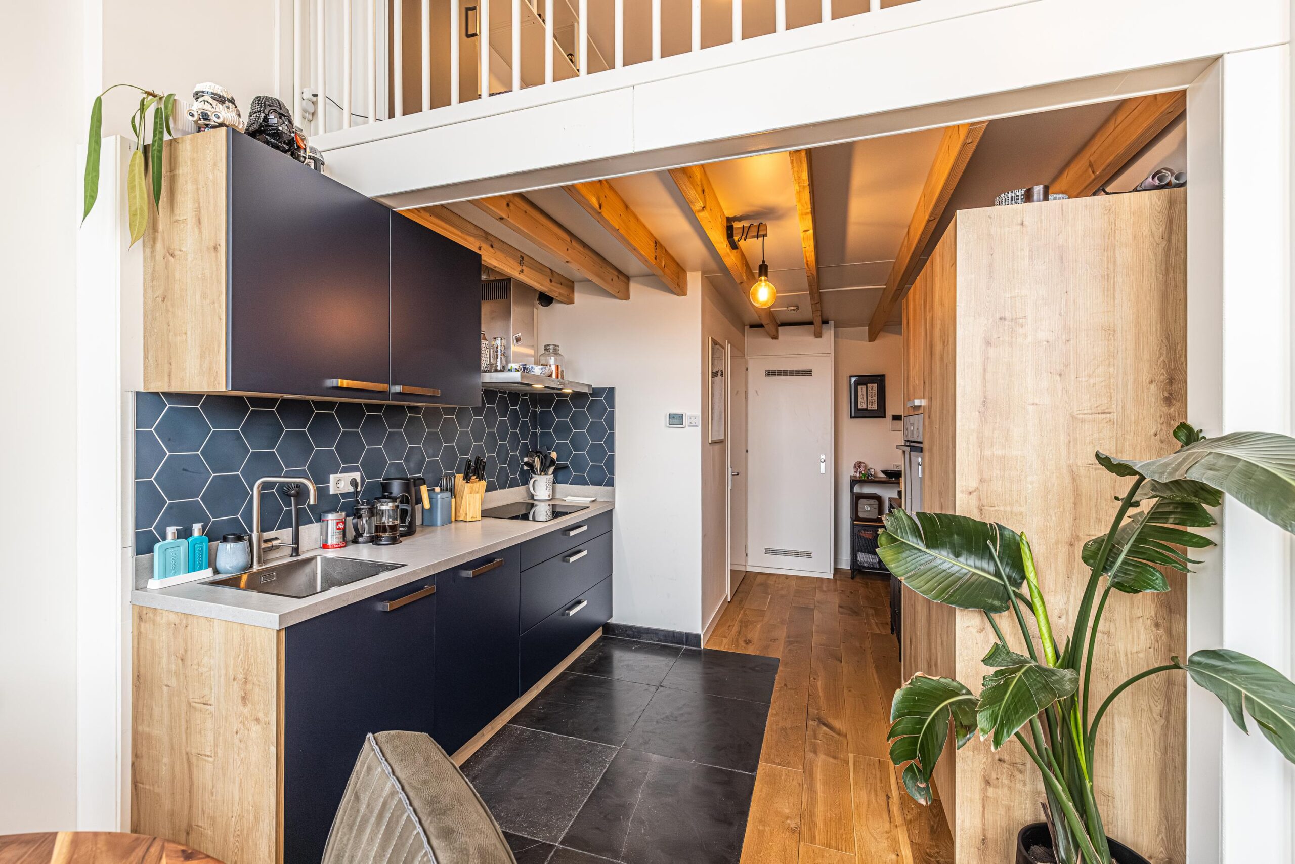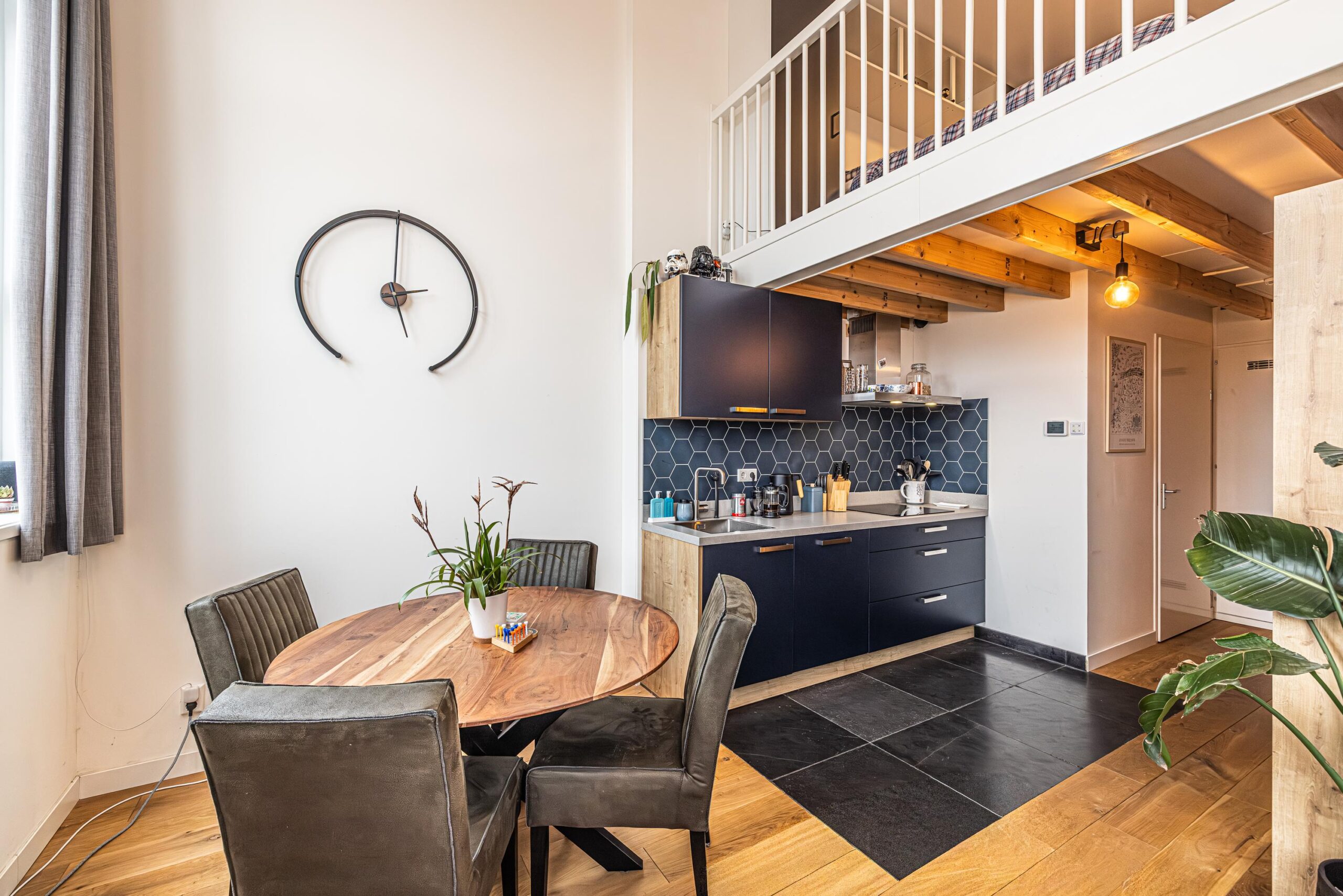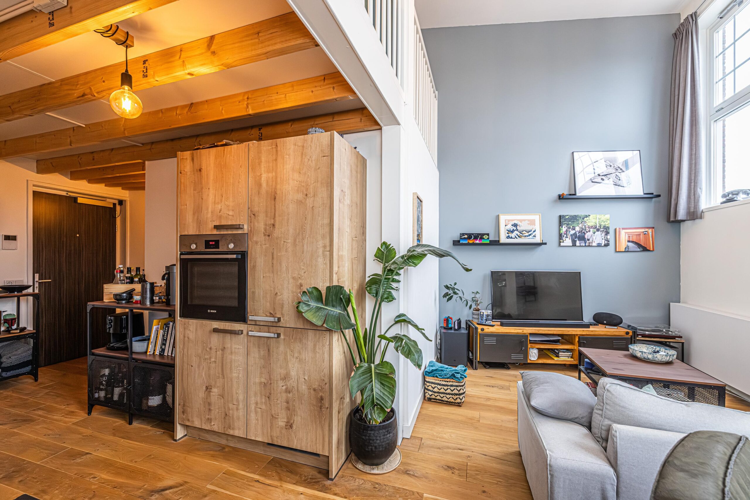 * Het plafond onder de entresol/verdieping bestaat uit o.a. uit sfeervolle balken welke in in het zicht zitten