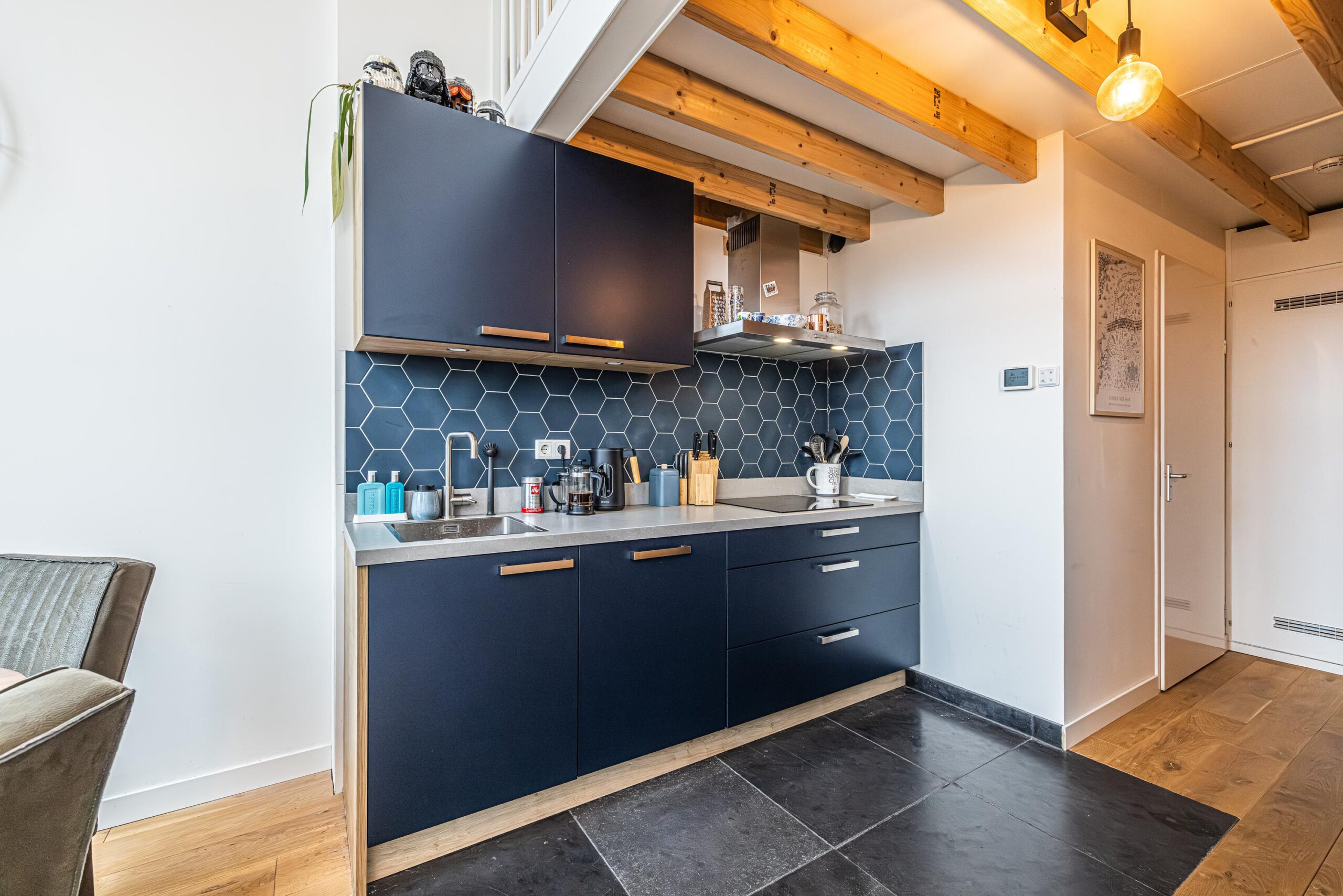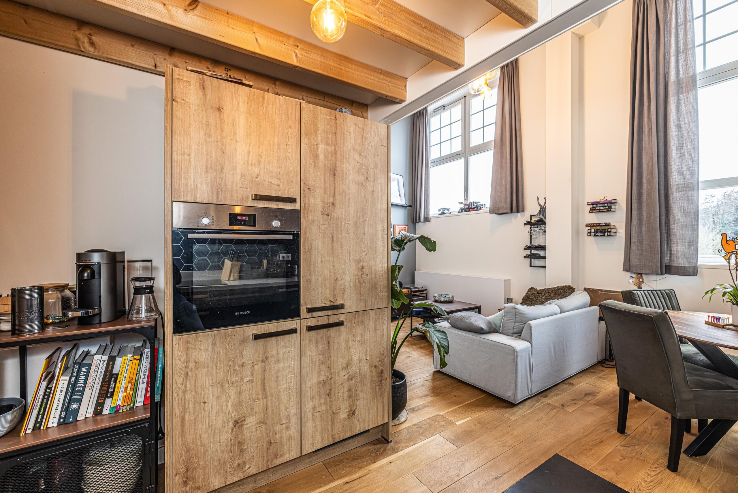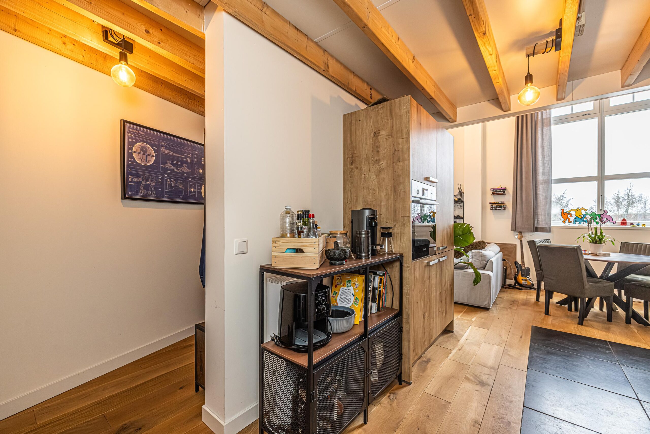 * Het plafond onder de entresol/verdieping bestaat uit o.a. uit sfeervolle balken welke in in het zicht zitten