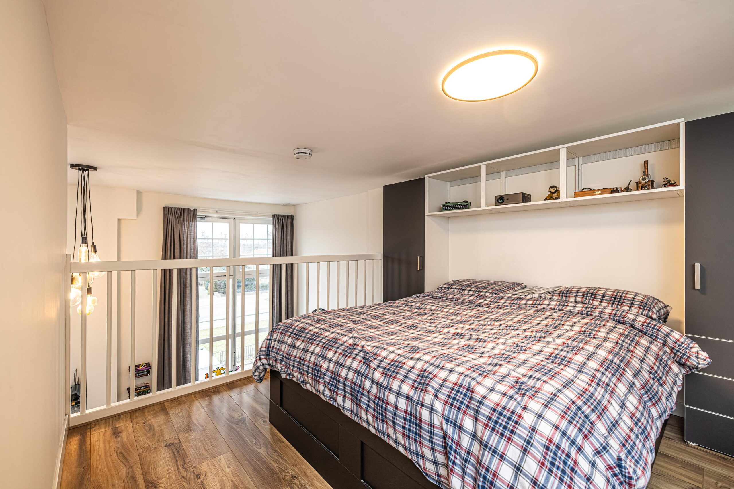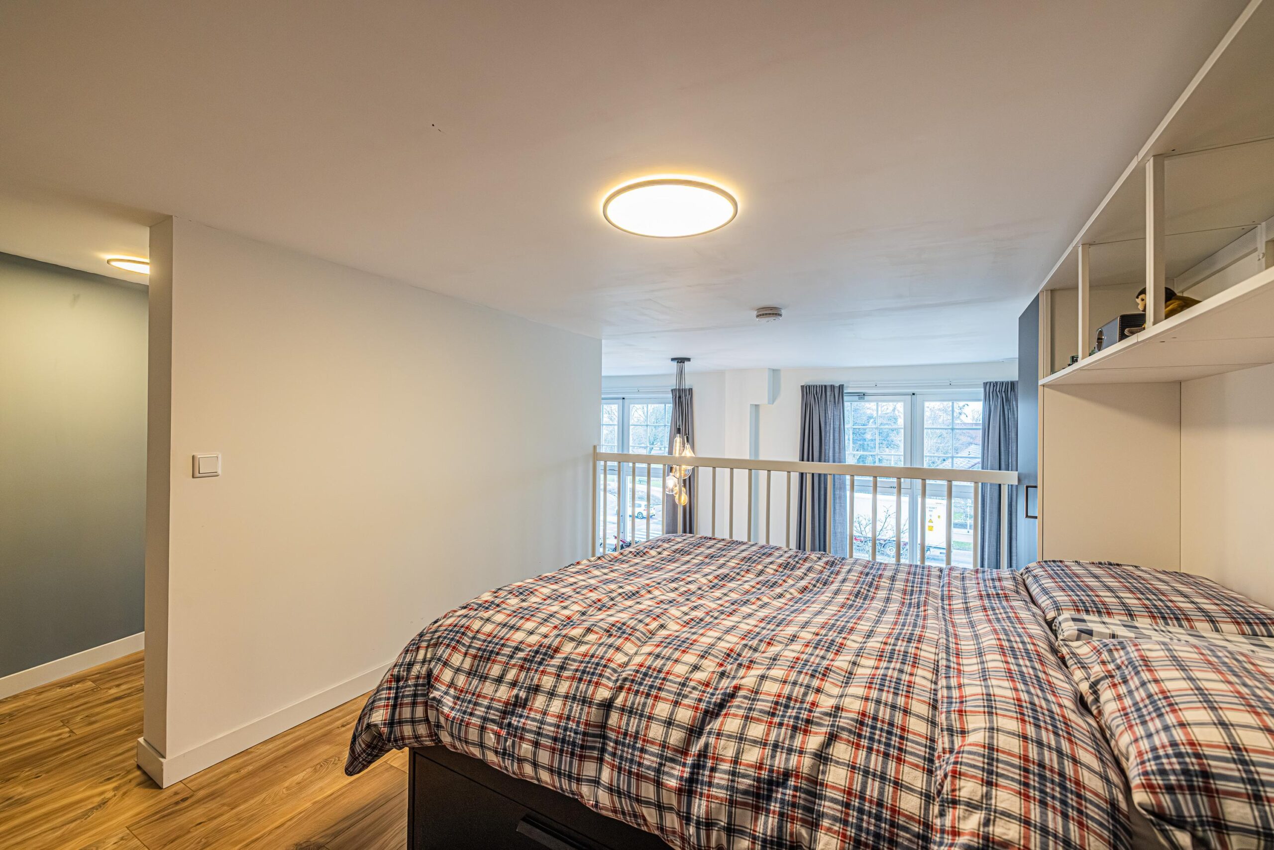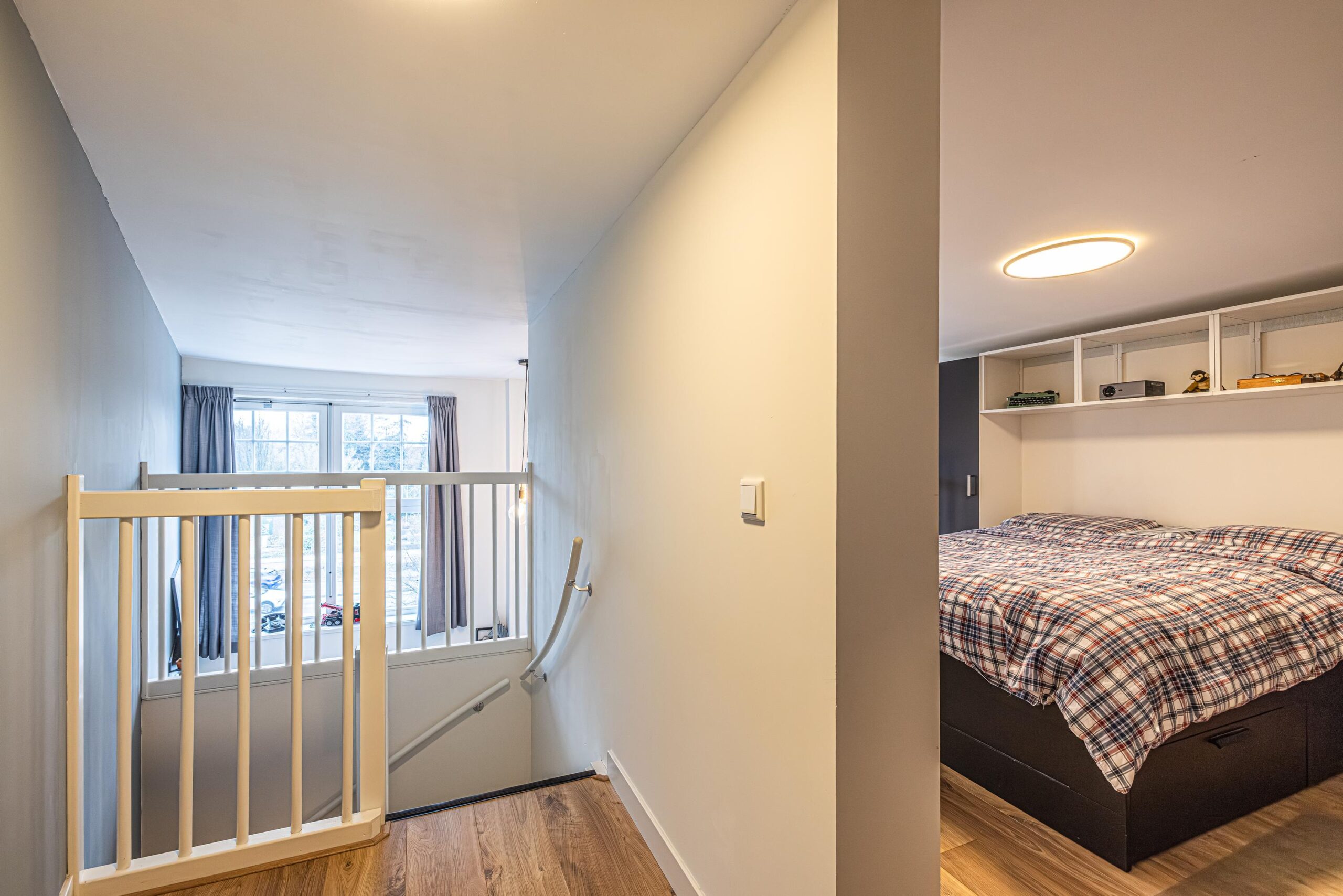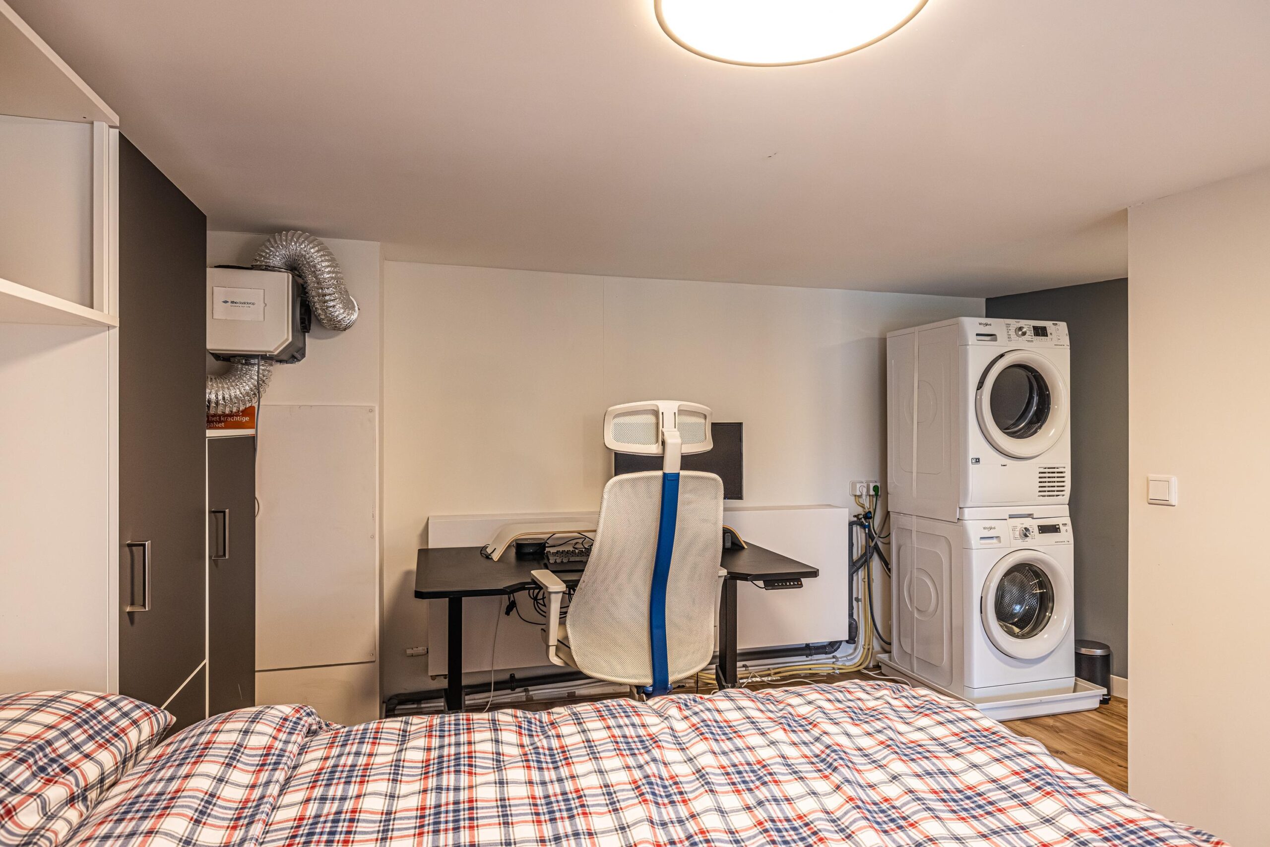 Overloop met aansluitingen voor de wasmachine/droger en verder een aantrekkelijke ruimte welke uitstekend te gebruiken als slaapkamer. De ruimte heeft een oppervlakte van ca. 15 m2. De verdieping/entresol heeft een vrije hoogte welke net onder het minimum valt waardoor deze niet als gebruiksoppervlak woonruimte benoemd mag worden. De ruimte kan vanwege de gebruiksmogelijkheden wel als zodanig beschouwd worden.