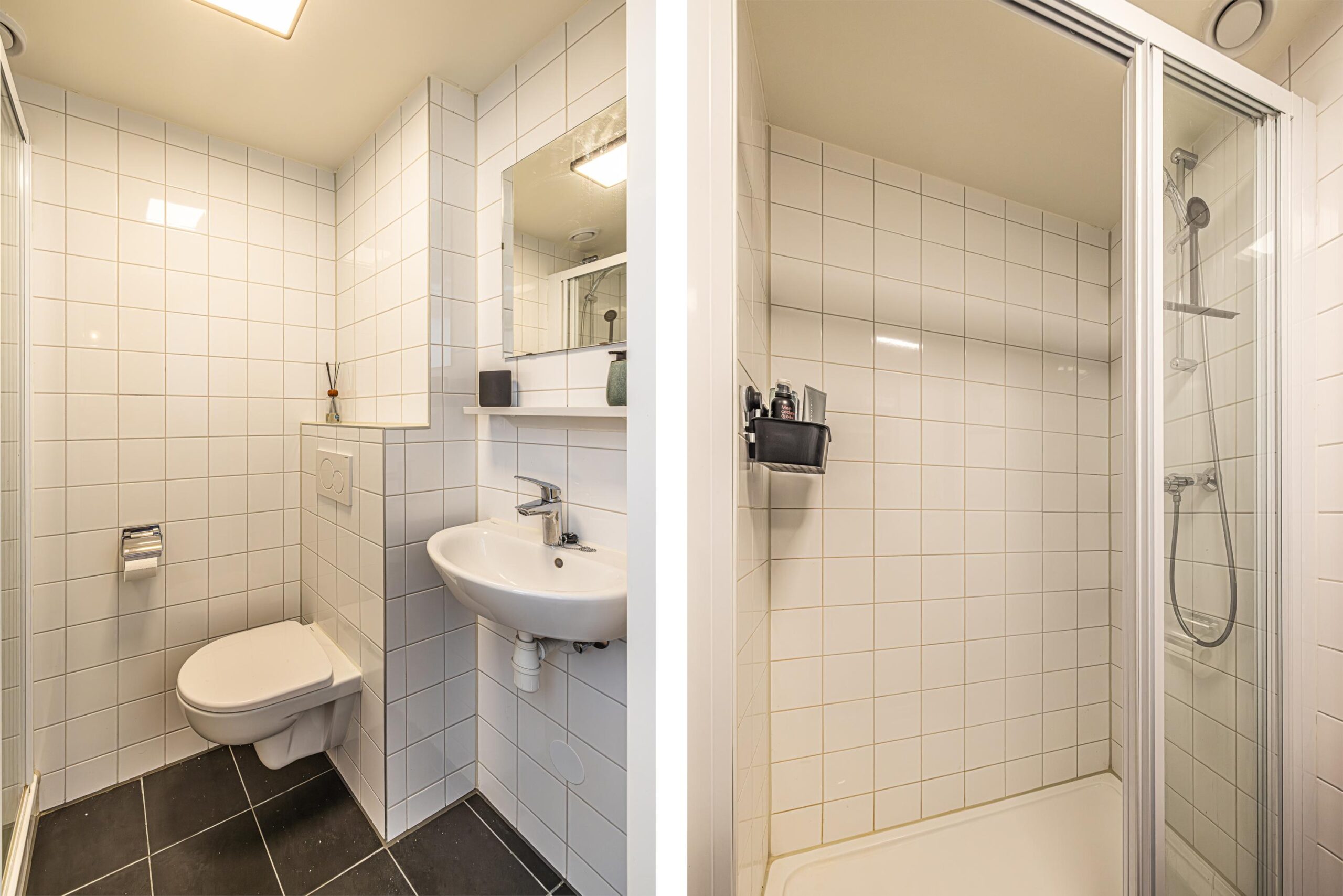 De badkamer is uitgevoerd met modern wit sanitair en een combinatie met wit wandtegelwerk en antraciet gekleurde tegels op de vloer.