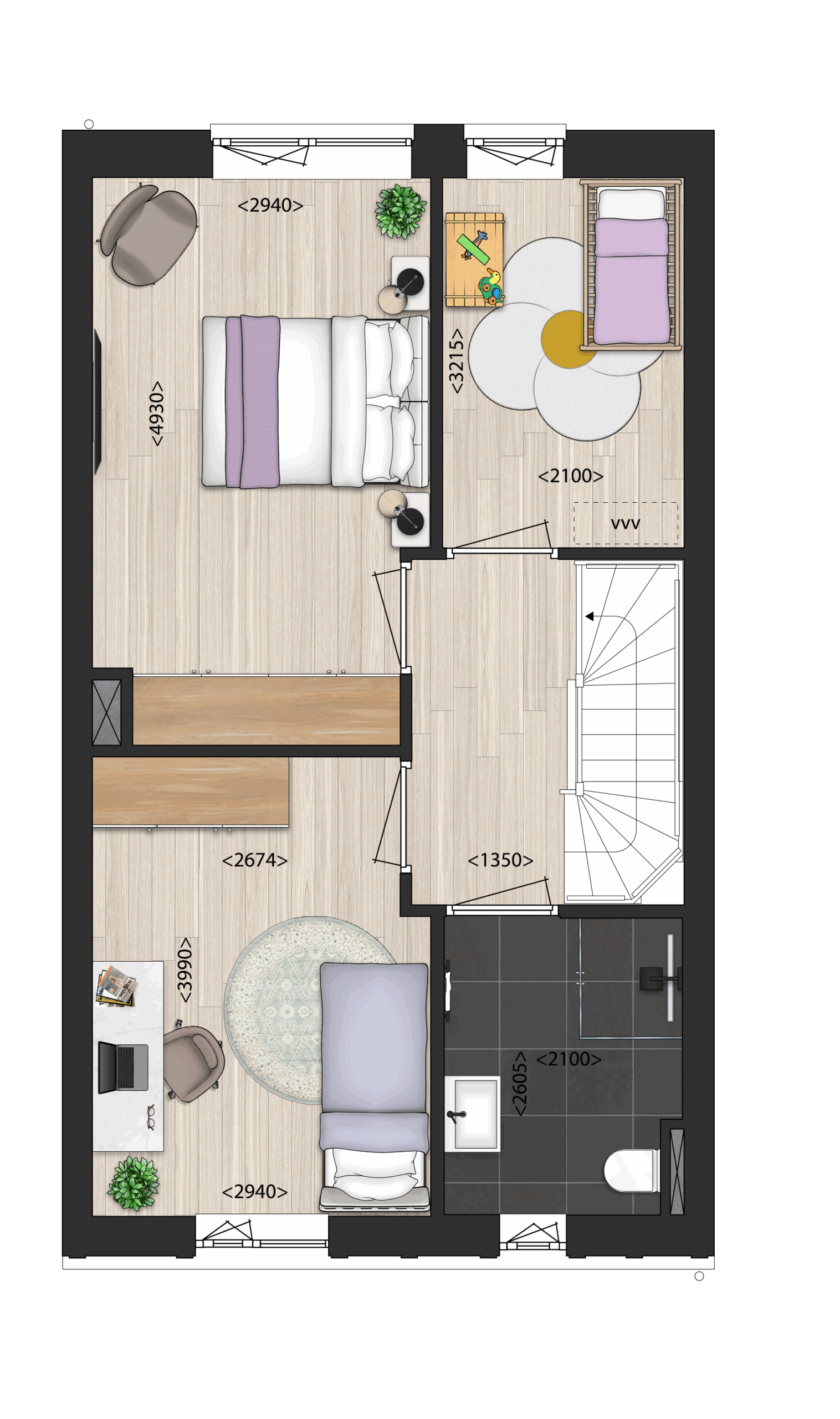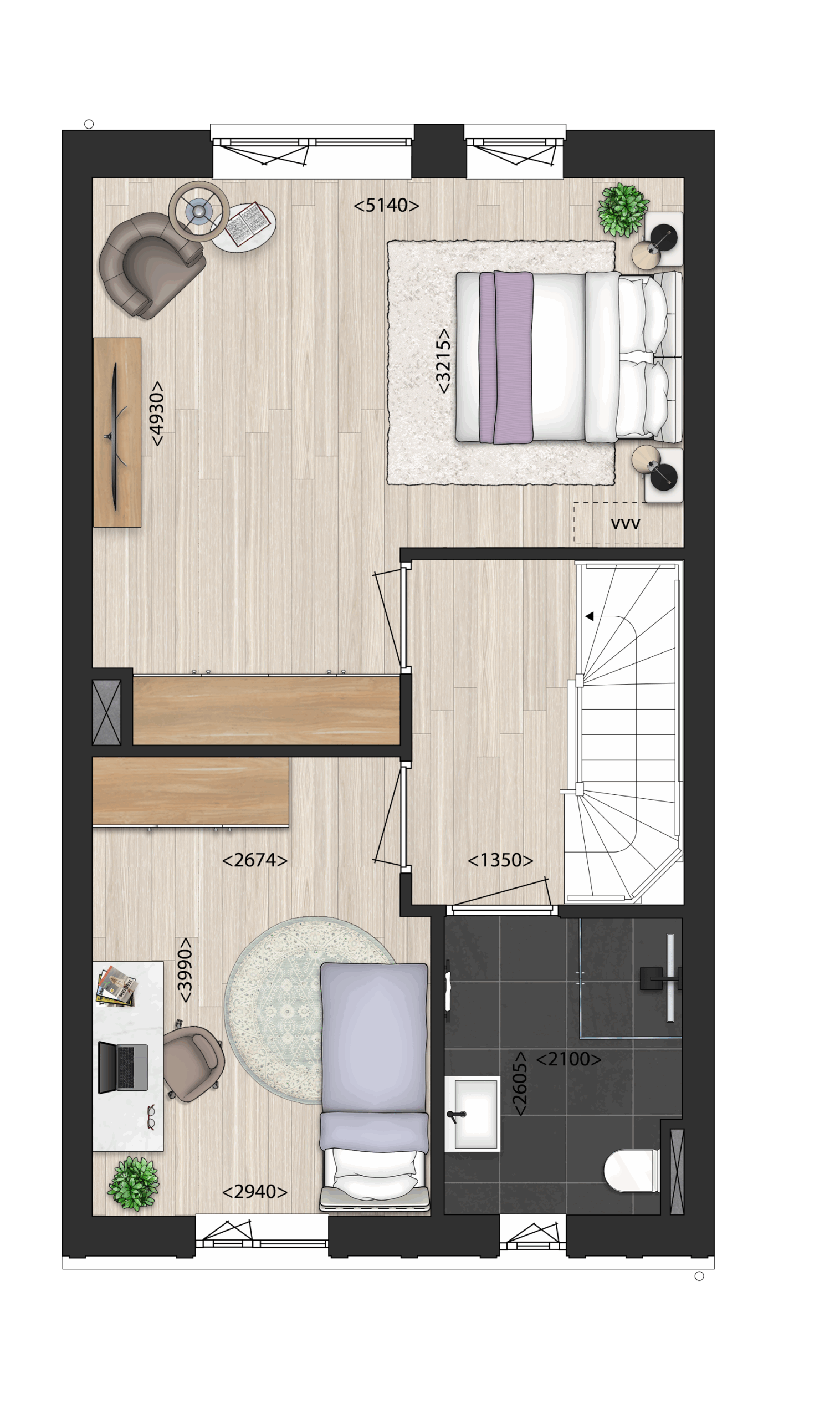 - Standaard 2 slaapkamers op de eerste verdieping, uitbreidbaar naar 3