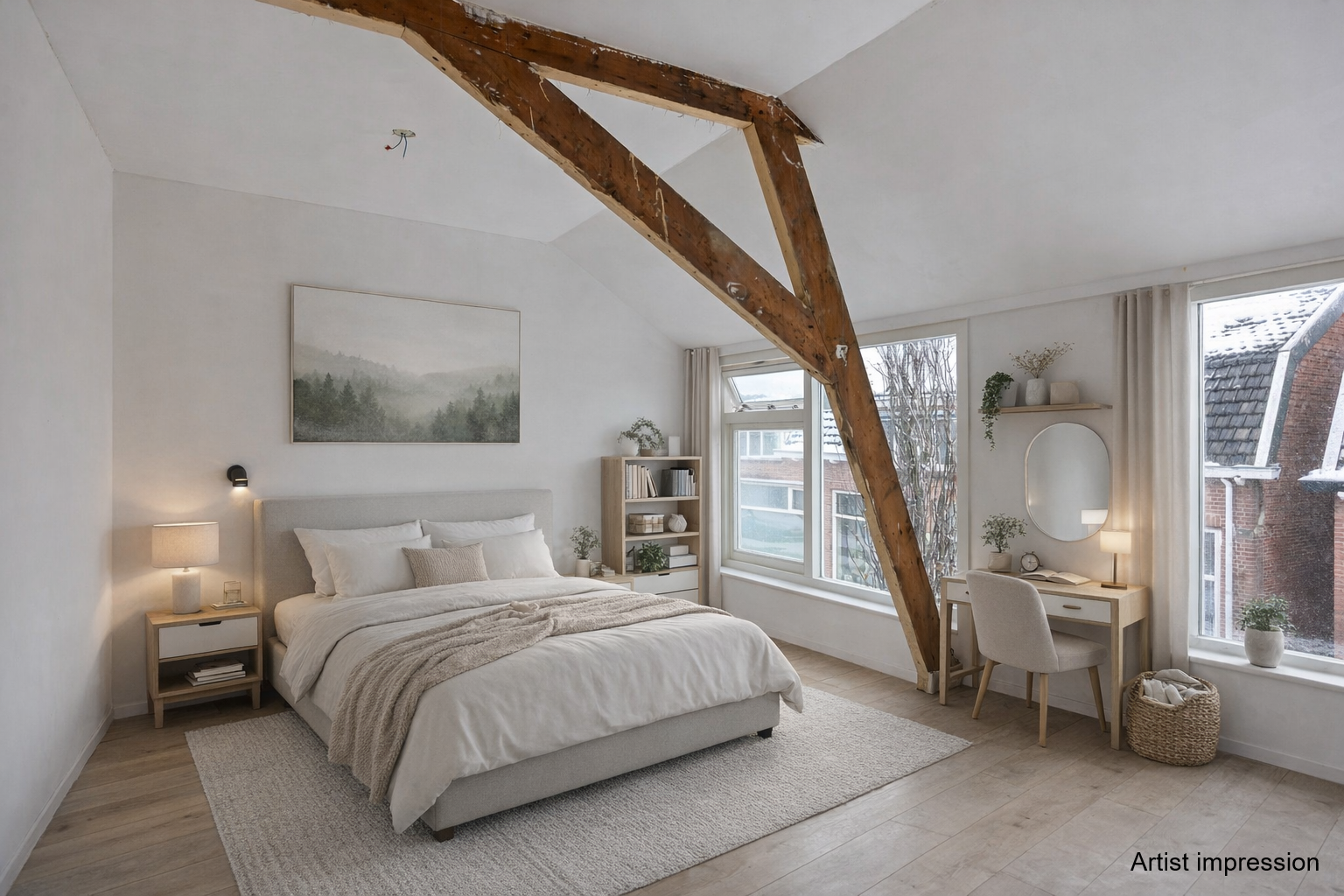 Via de overloop kom je in alle verstrekken uit. Hier vind je twee slaapkamers en de badkamer. De hoofdslaapkamer is aan de voorzijde gesitueerd en is over de gehele breedte van de woning. Door de lage ramen heb je veel lichtinval in de slaapkamer. De draagconstructie is nog in het zicht in de slaapkamer. Hierdoor heb je een gezellige, sfeervolle slaapkamer. Aan de achterzijde is de tweede slaapkamer gelegen. Ook deze is over de gehele breedte en ook hier is de draagconstructie nog in het zicht.