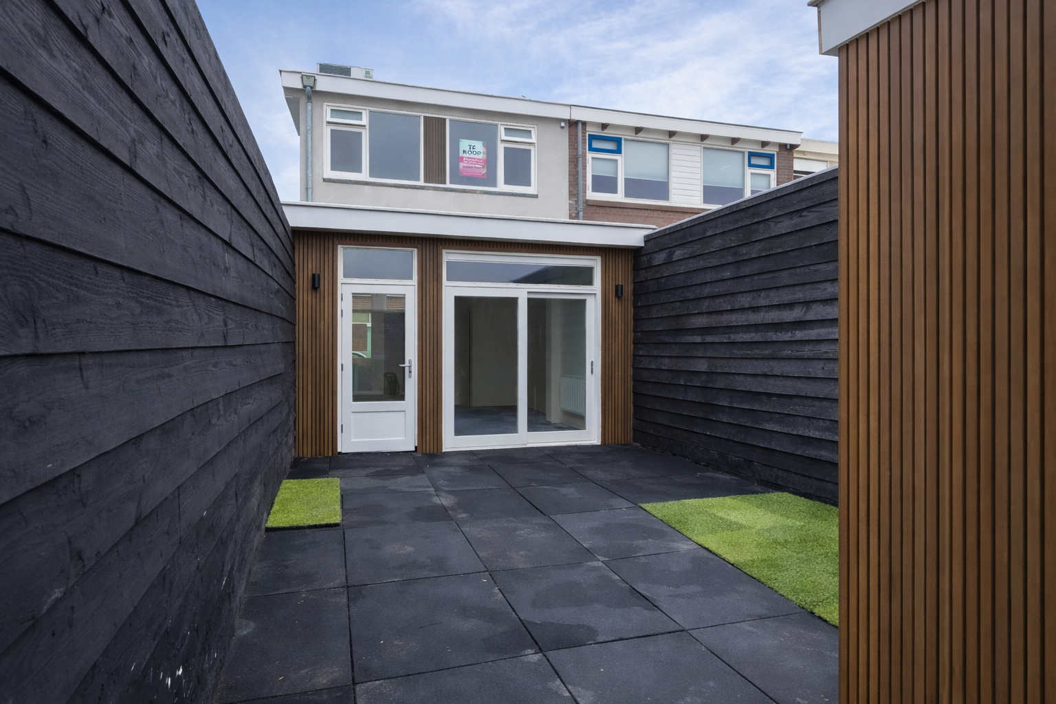 Aan de achterzijde is een uitbouw van ca. 2,5 meter gerealiseerd, waardoor je een fantastische ruime woonkamer hebt met schuifpui en veel licht aan de achterzijde.