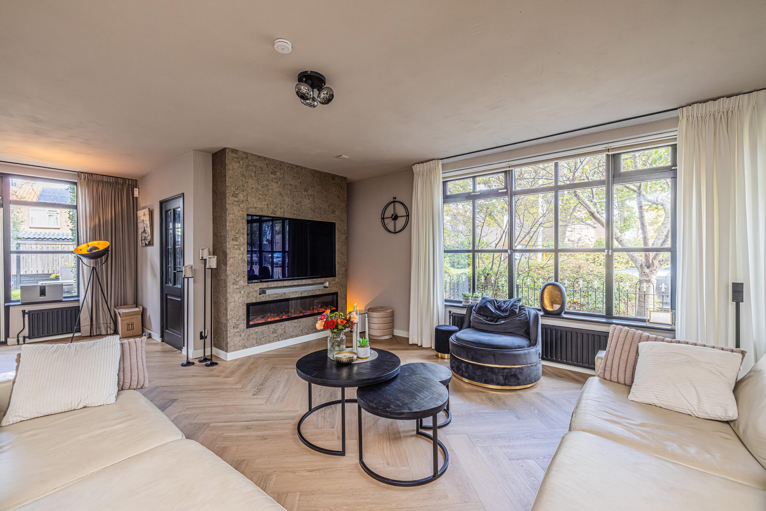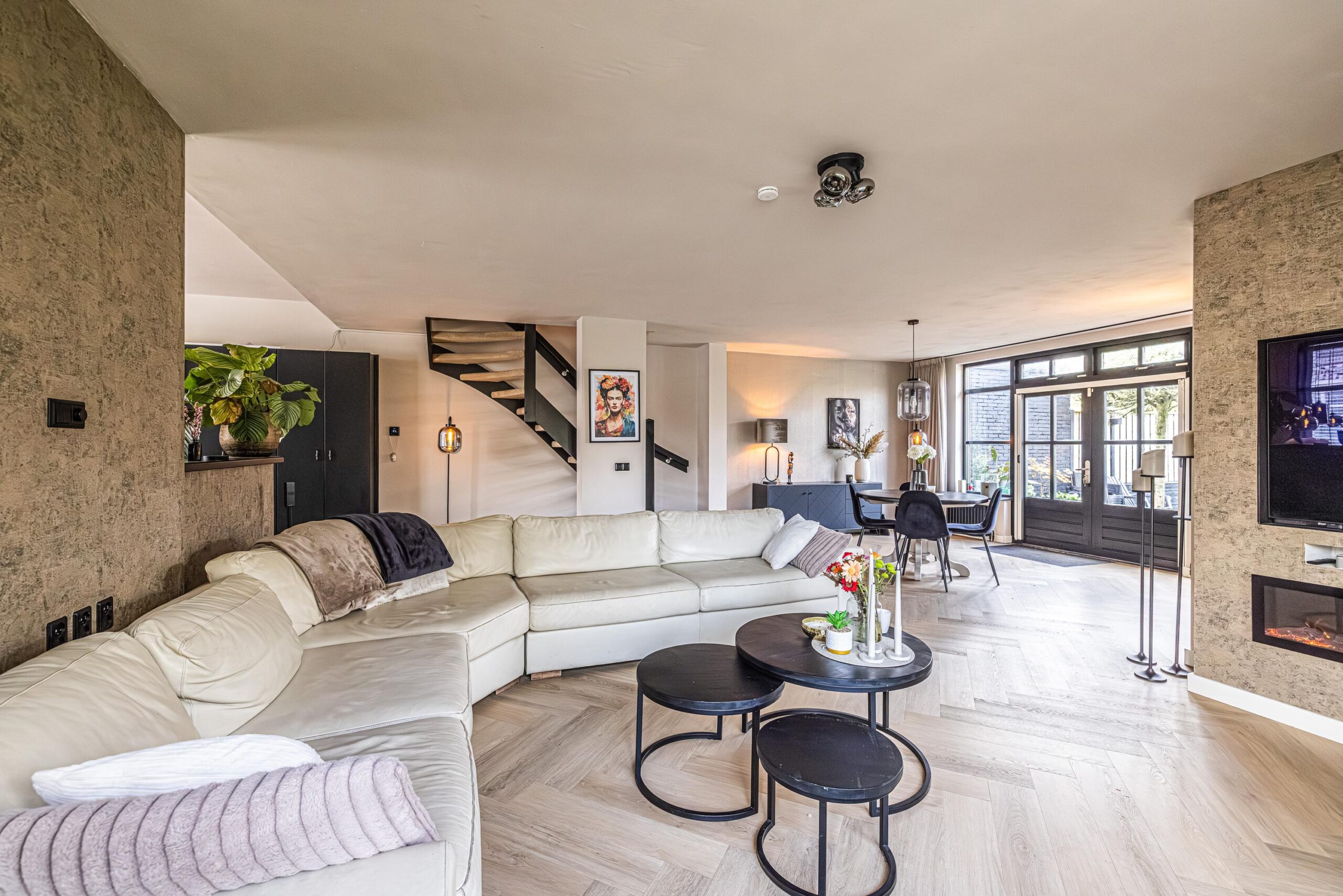 De tuingerichte woonkamer met speelse indeling, beschikt aan drie zijden over raampartijen en heeft een oppervlakte van ruim 50 m2. Aan de achterzijde een brede pui met aantrekkelijke openslaande deuren naar de tuin. Centraal in de woonkamer de open trap met toegang naar de 1e verdieping.