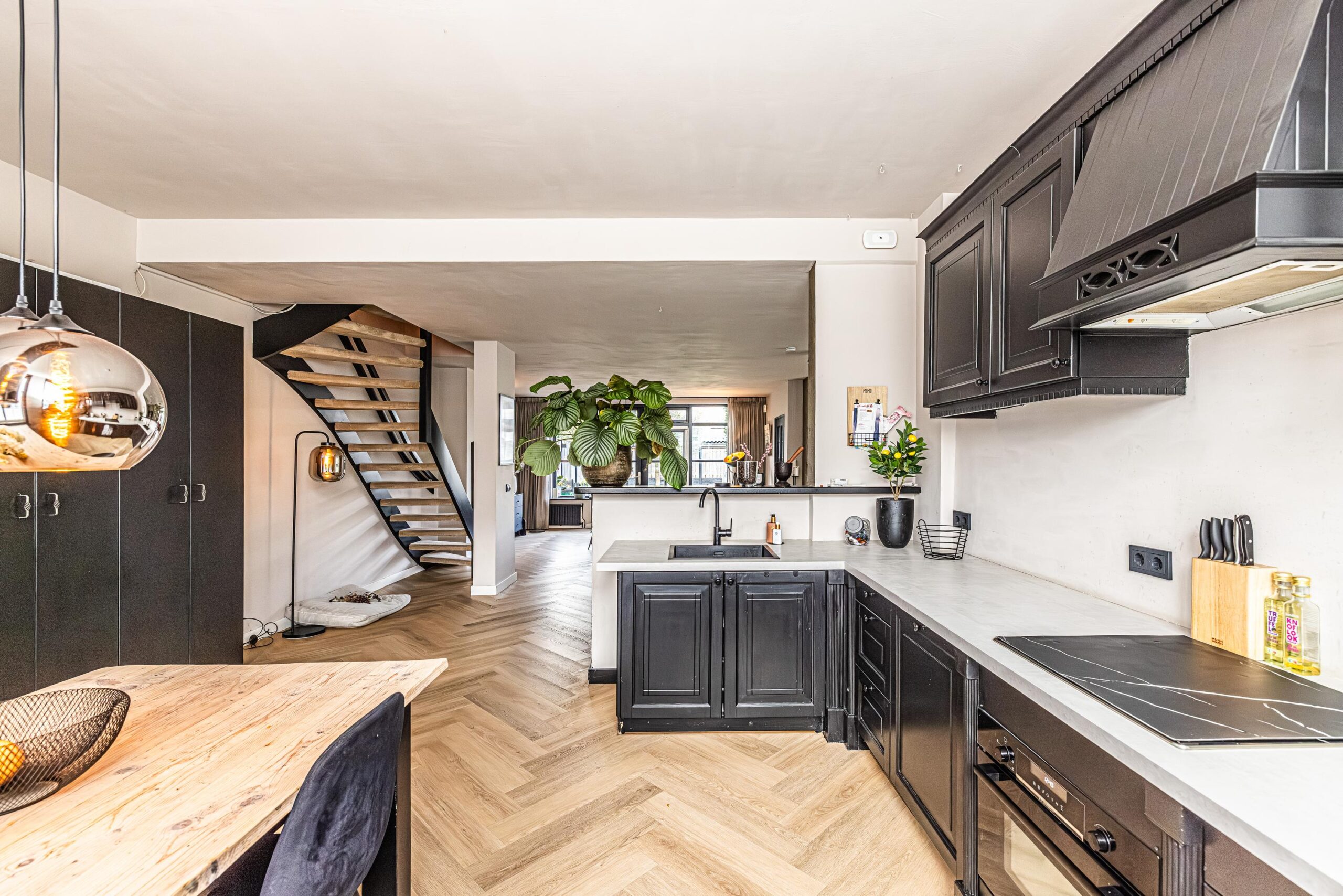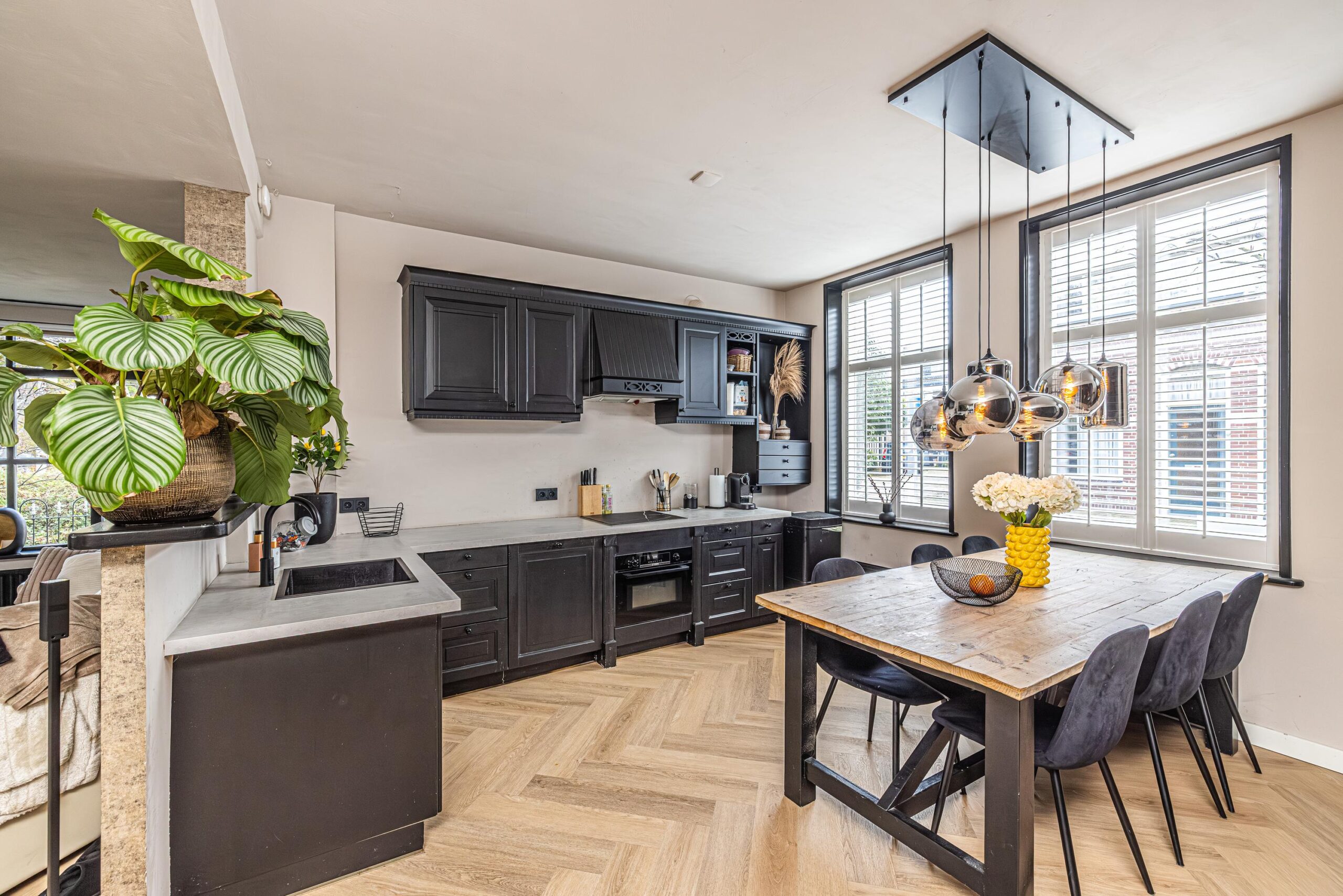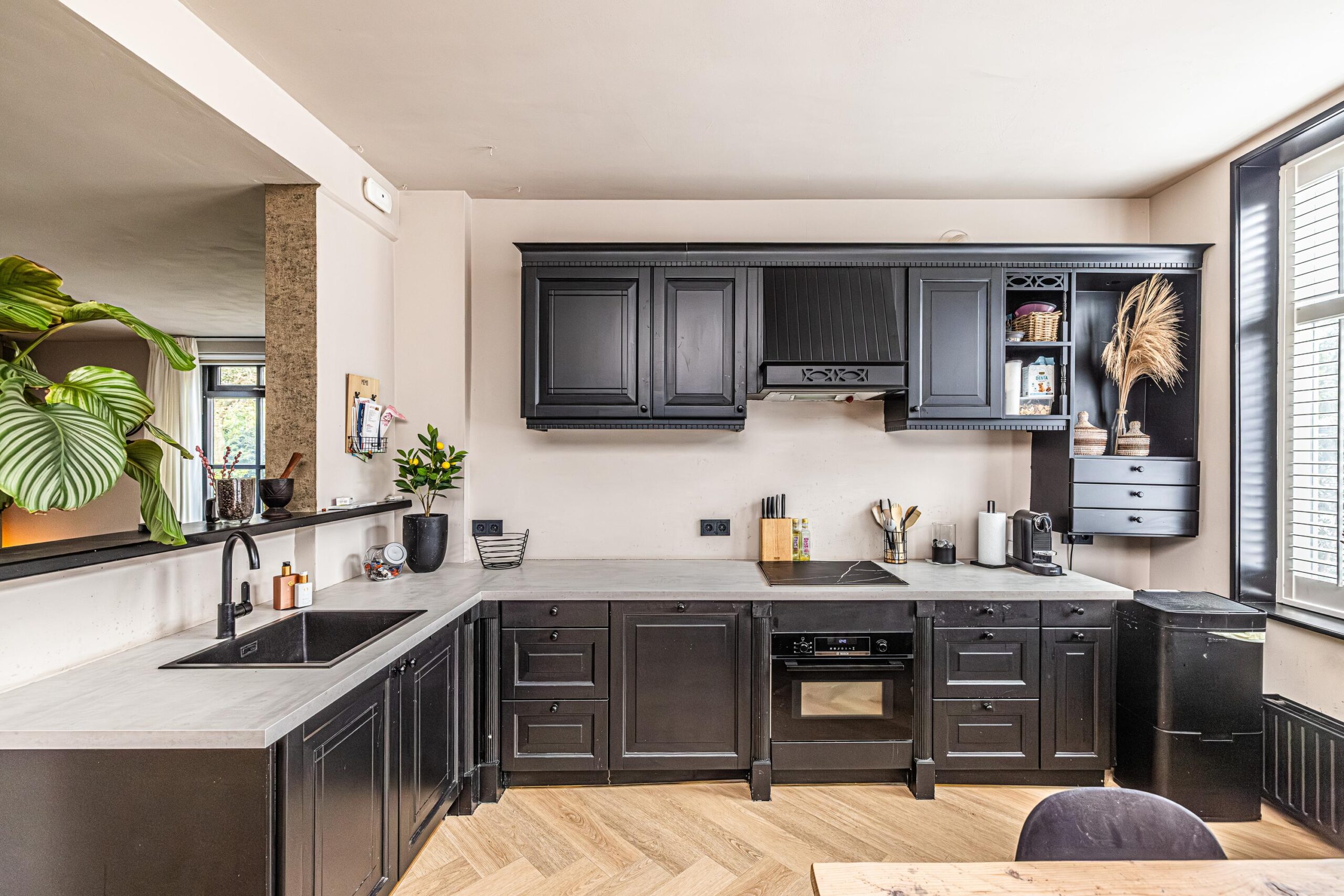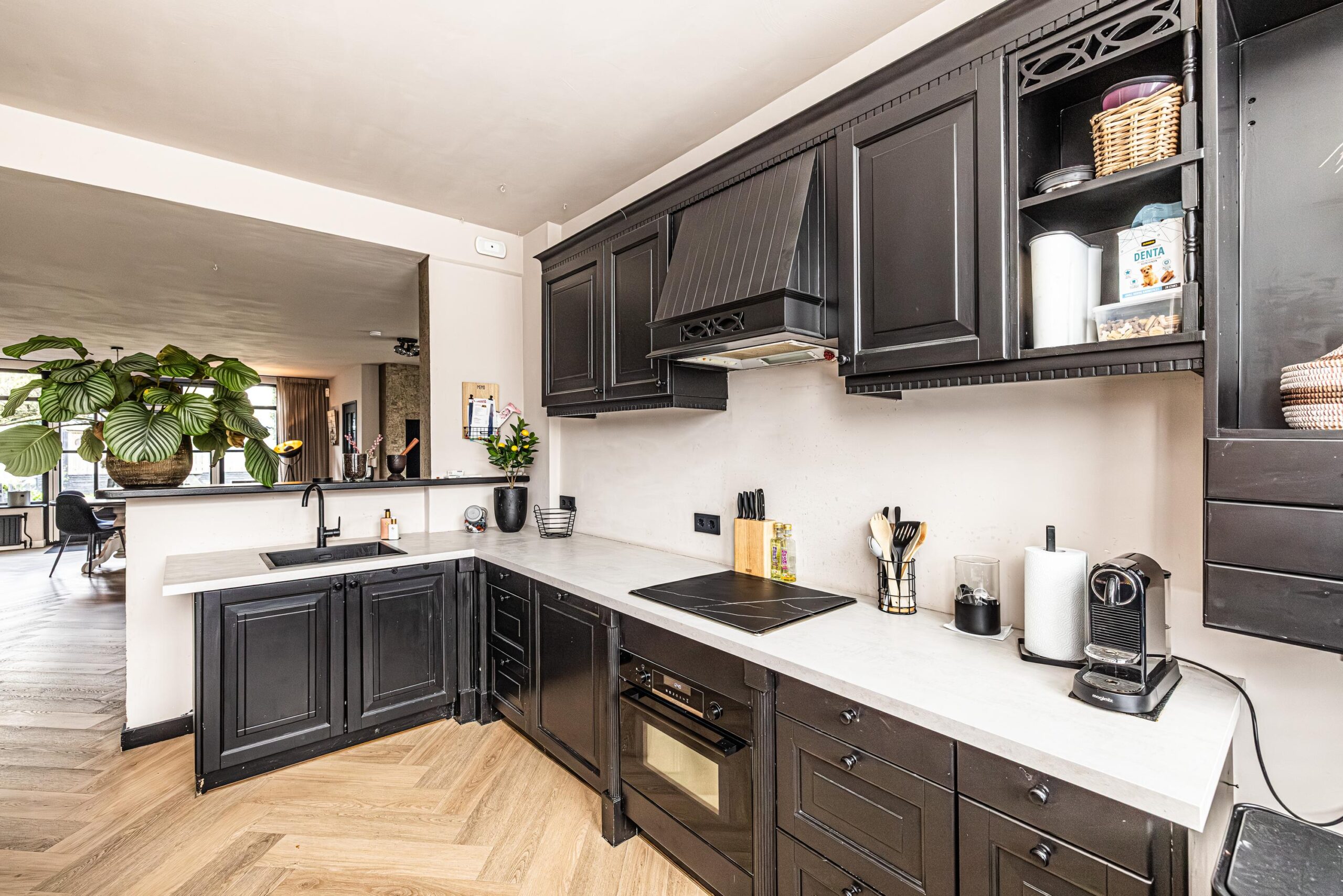 en uitgevoerd met een donker front en diverse recent vernieuwde inbouwapparatuur en afgewerkt met een fraai licht aanrechtblad. De keuken is verder voorzien van een vaste kastenwand waarin zich ook de meterkast bevindt.
