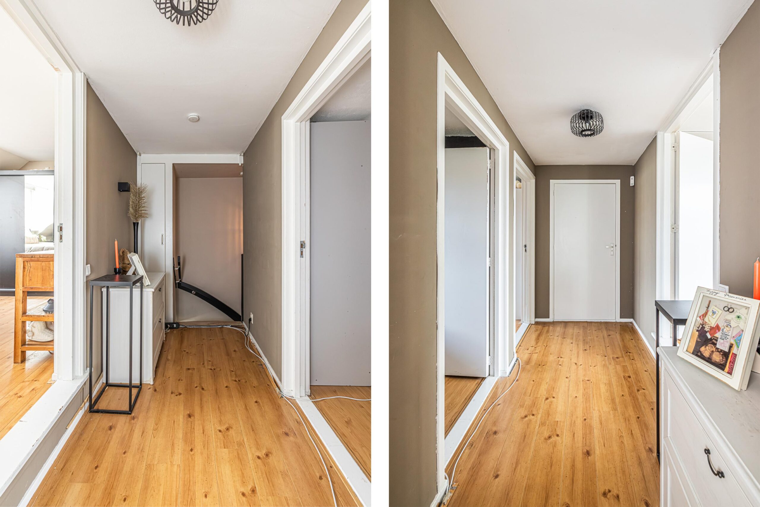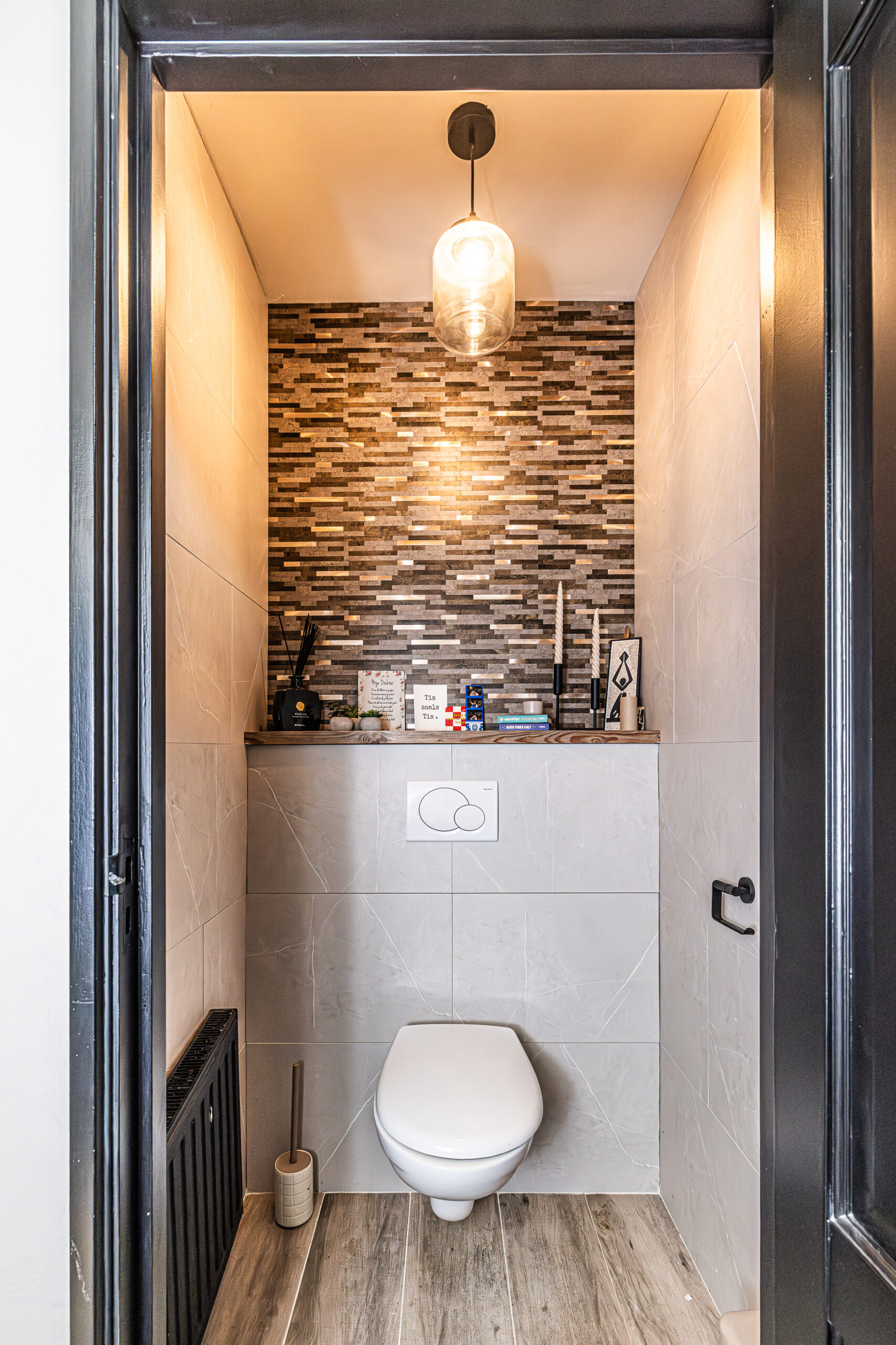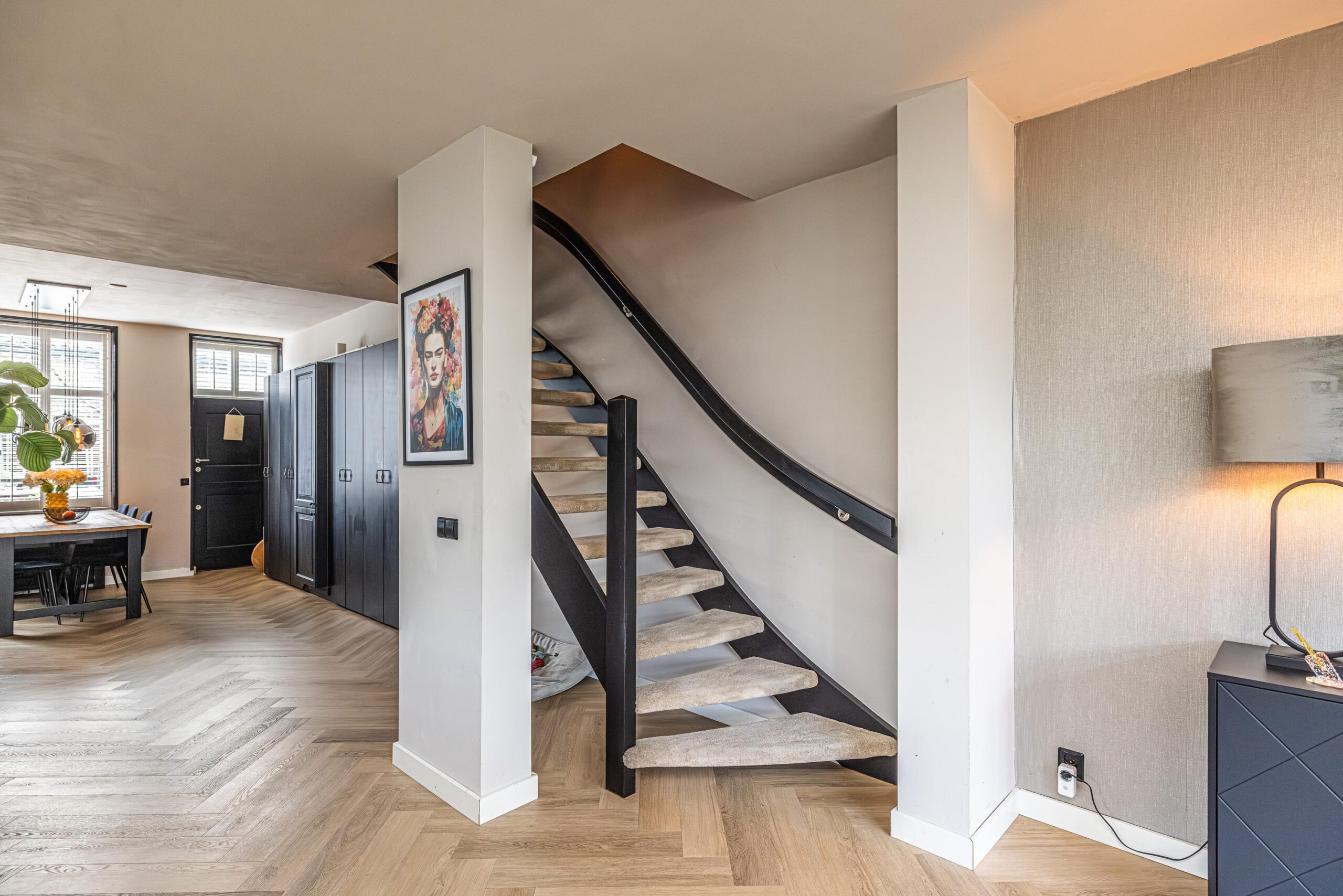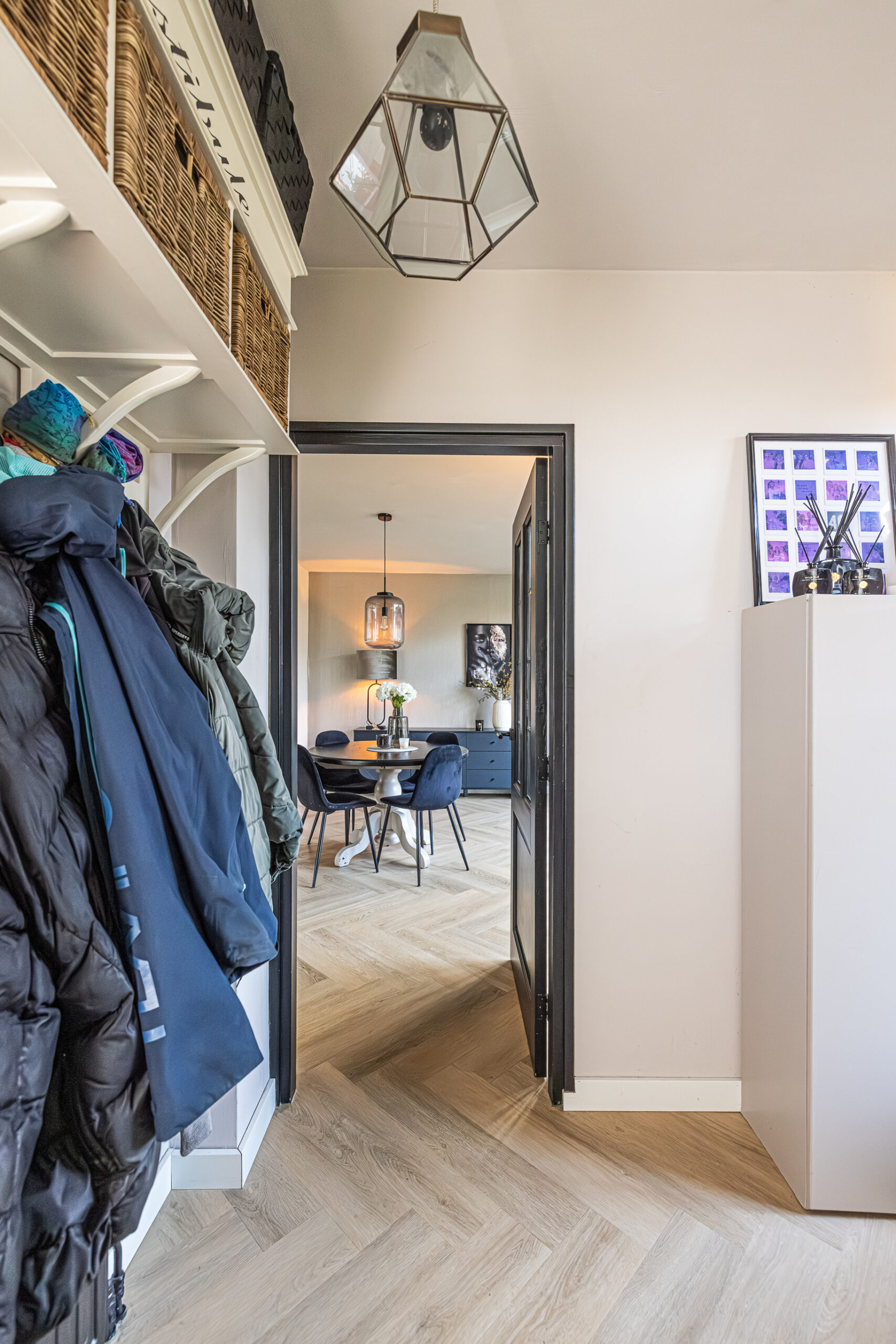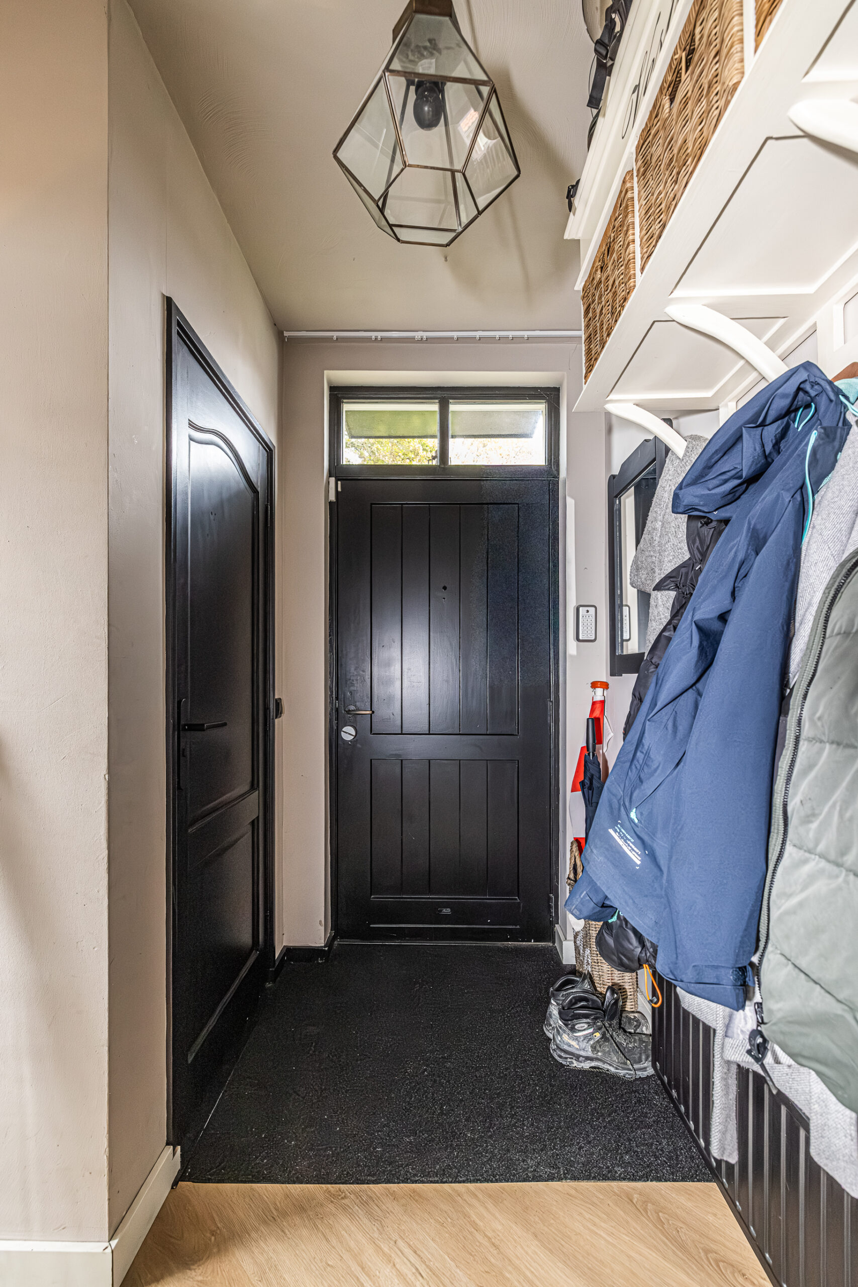 Zijentree met een fraaie voordeur die toegang geeft tot de woning, de hal met luxe toilet met vrij hangend closet (in 2025 vernieuwd). Het toilet is uitgevoerd met modern sanitair en tegelwerk met nis.