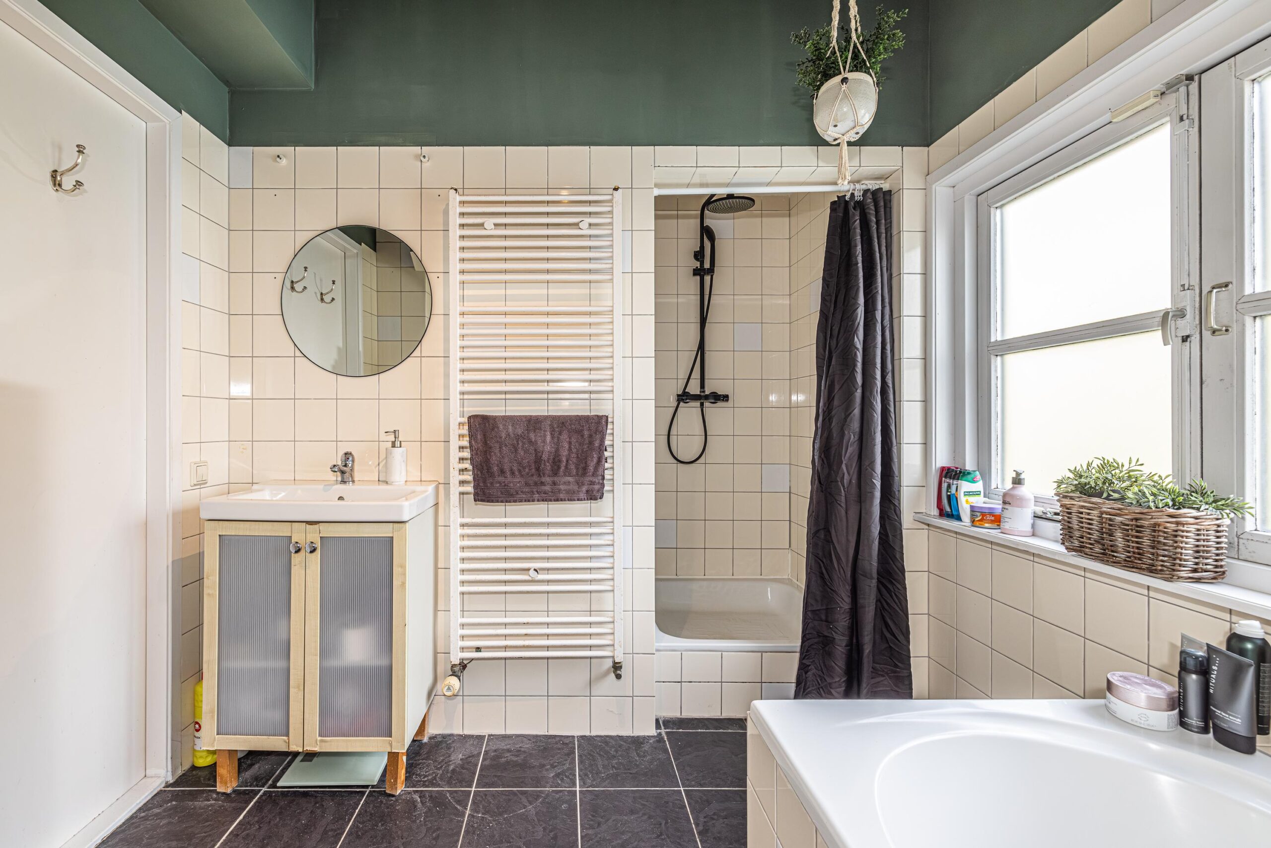 De ruime en lichte badkamer, welke compleet is uitgevoerd met een kunststof ligbad, aparte douchegelegenheid met scherm, vaste wastafel met meubel en 2e toilet met vrij hangend closet. De moderne badkamer is voorzien van wit sanitair en uitgevoerd met licht wandtegelwerk en antraciet gekleurde vloertegels.