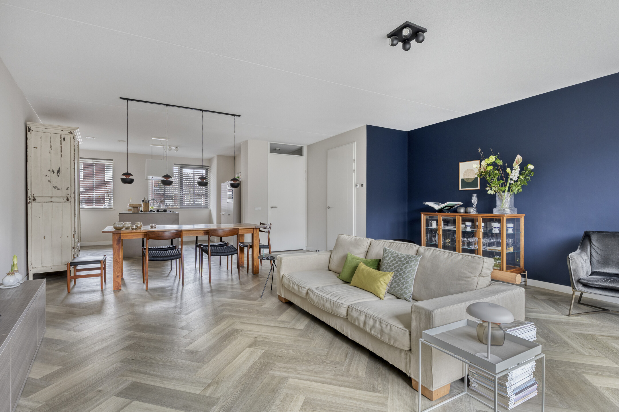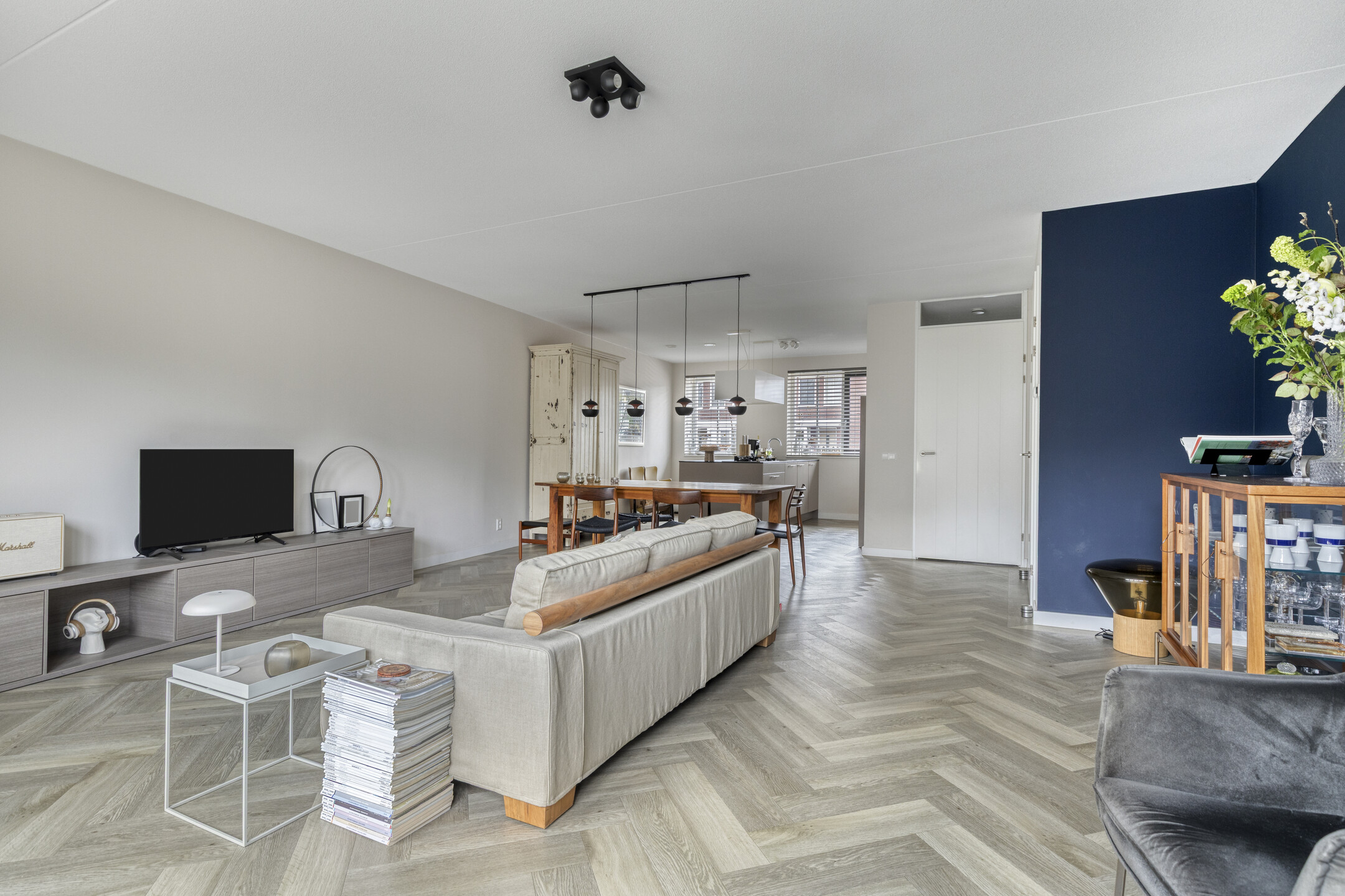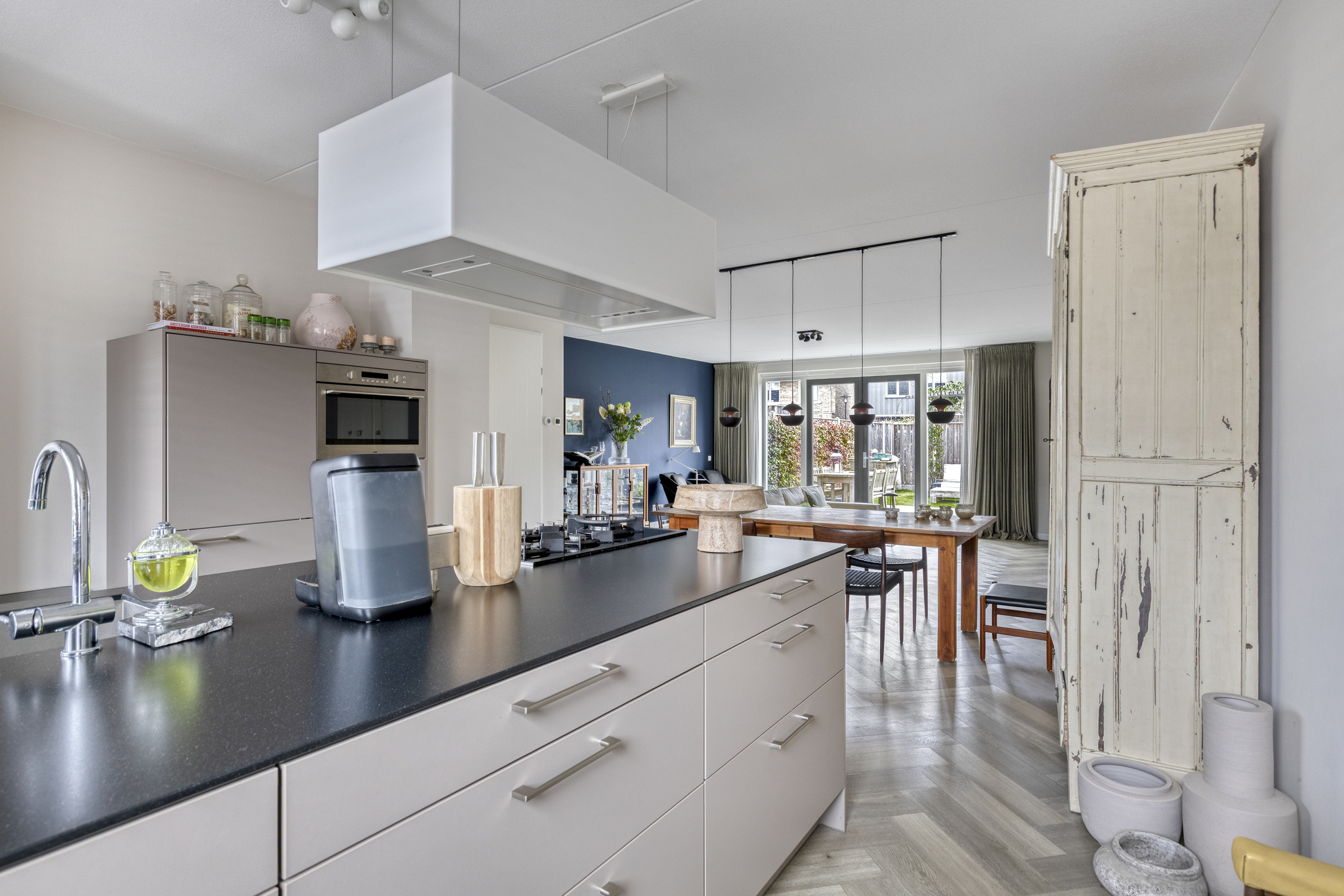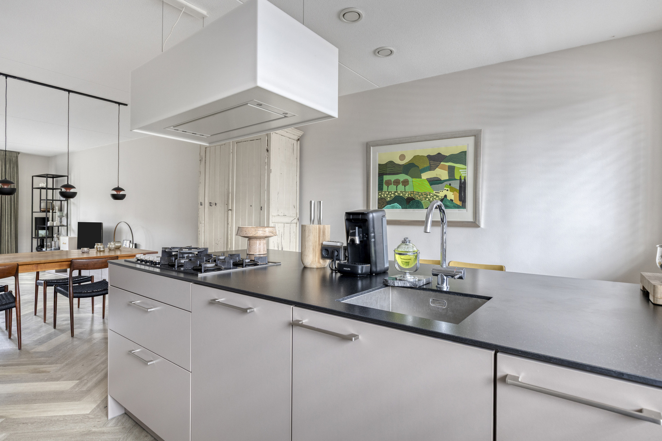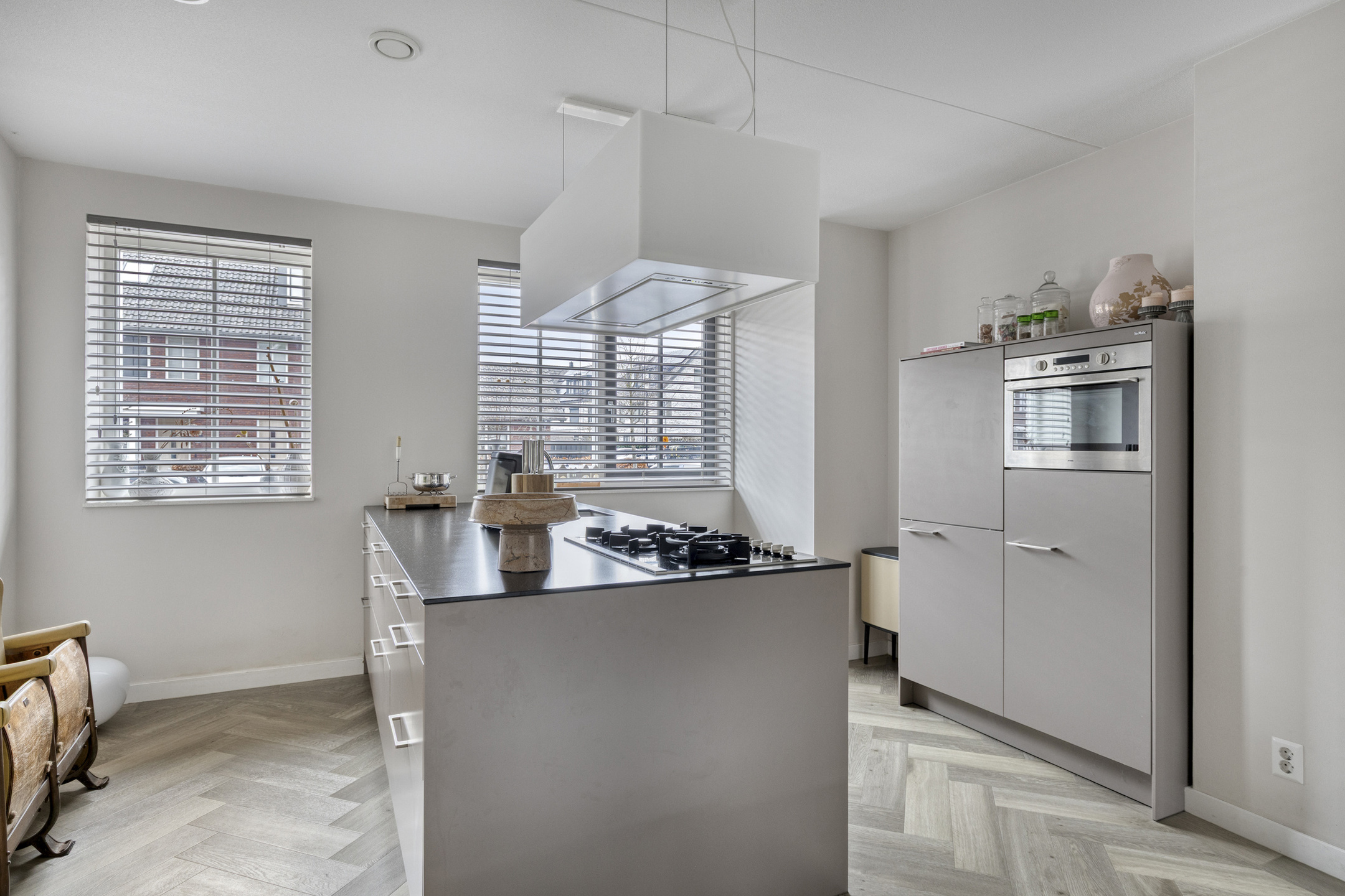 Je stapt binnen in een ruime entree met garderobe, meterkast, modern toilet met fonteintje en trapopgang. Zodra je doorloopt, kom je binnen in een riante leefruimte. De ruimte is geheel voorzien van vloerverwarming onder een elegante visgraat pvc vloer. Aan de voorzijde ontvouwt zich de extra brede Siematic leefkeuken. De geur van vers gezette koffie, het matte taupe van de kasten, het koele composiet werkblad—alles klopt. Het semi-eiland nodigt uit tot lange avonden, terwijl de hoge kastenwand en complete apparatuur (vaatwasser, koelkast, 4-laden vriezer, combi-oven en 5-pits gas) elke kookliefhebber blij maken. Achterin