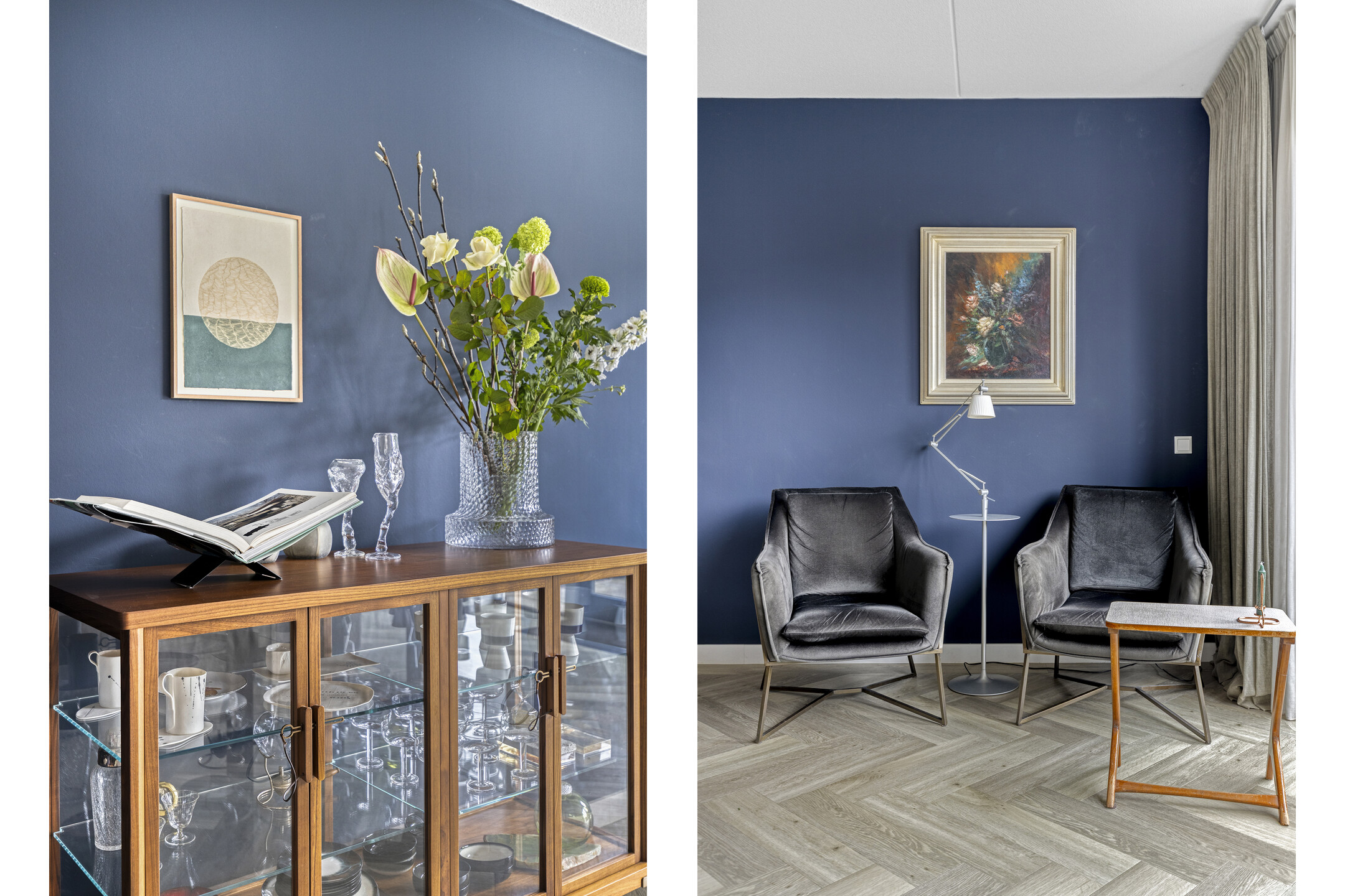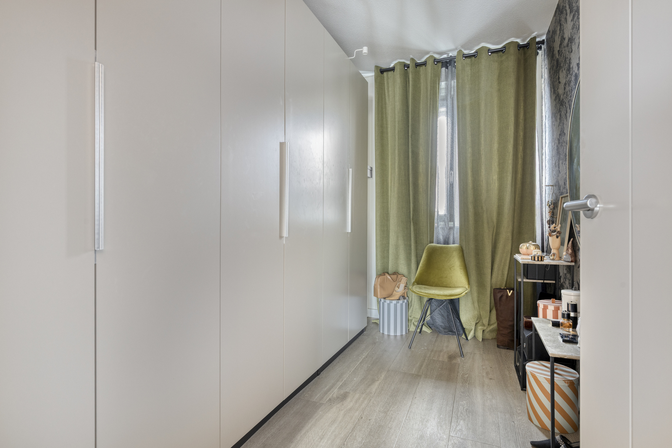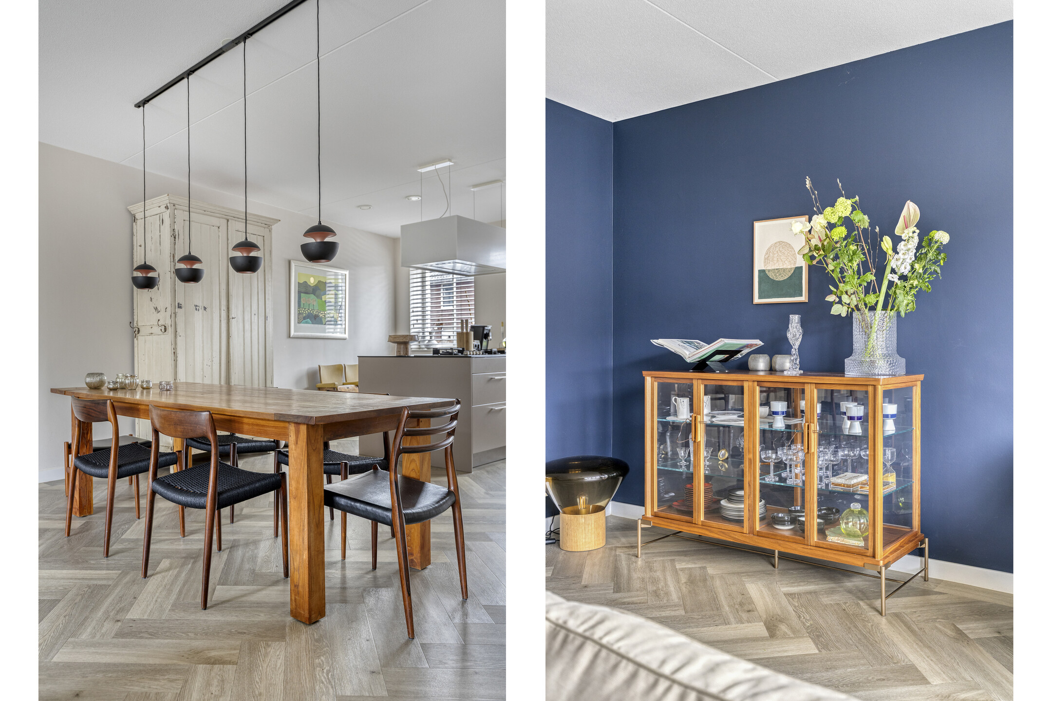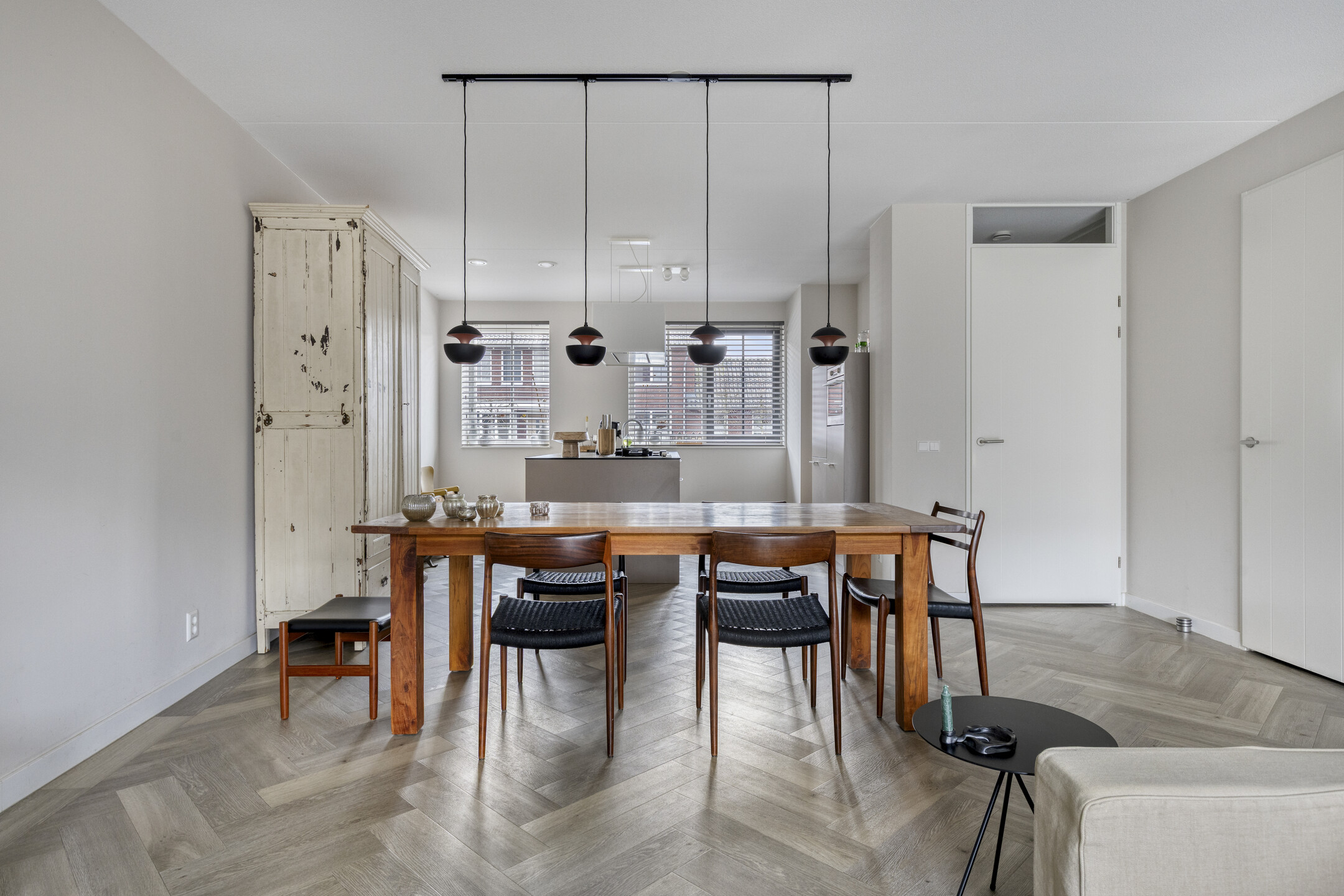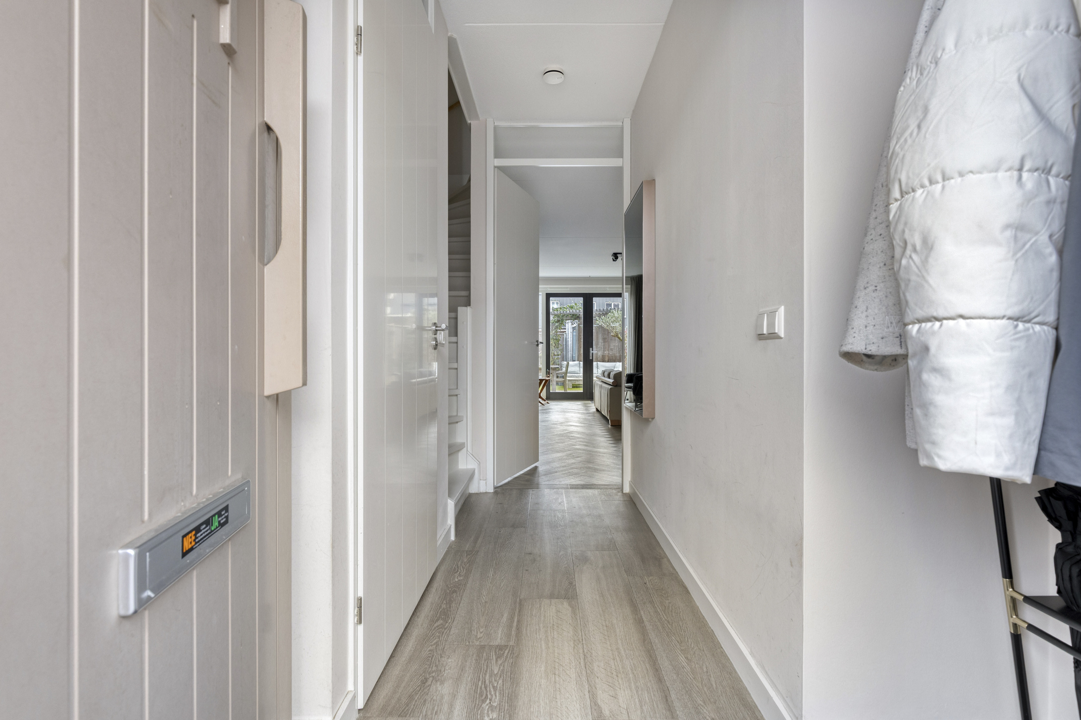 Je stapt binnen in een ruime entree met garderobe, meterkast, modern toilet met fonteintje en trapopgang. Zodra je doorloopt, kom je binnen in een riante leefruimte. De ruimte is geheel voorzien van vloerverwarming onder een elegante visgraat pvc vloer. Aan de voorzijde ontvouwt zich de extra brede Siematic leefkeuken. De geur van vers gezette koffie, het matte taupe van de kasten, het koele composiet werkblad—alles klopt. Het semi-eiland nodigt uit tot lange avonden, terwijl de hoge kastenwand en complete apparatuur (vaatwasser, koelkast, 4-laden vriezer, combi-oven en 5-pits gas) elke kookliefhebber blij maken. Achterin