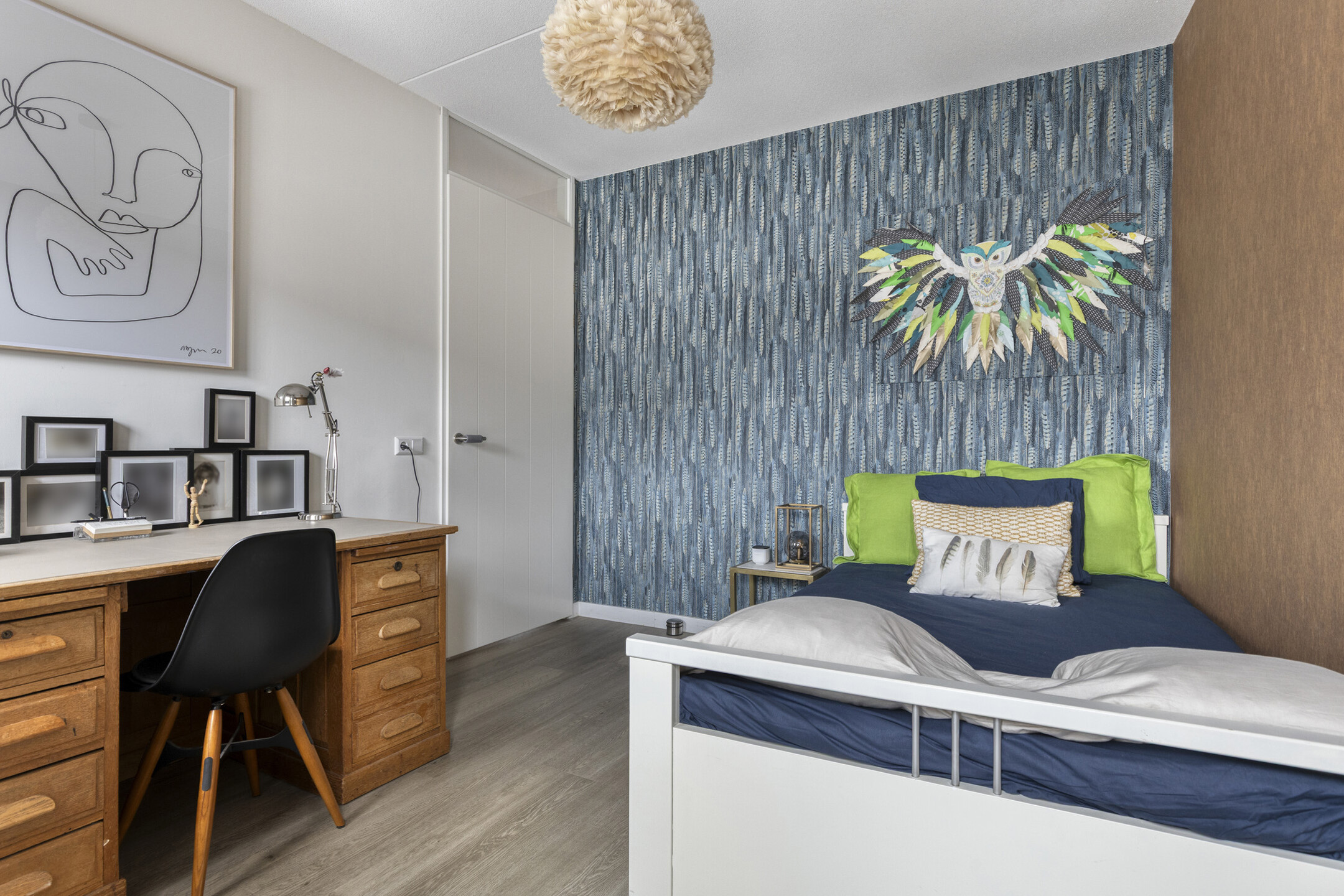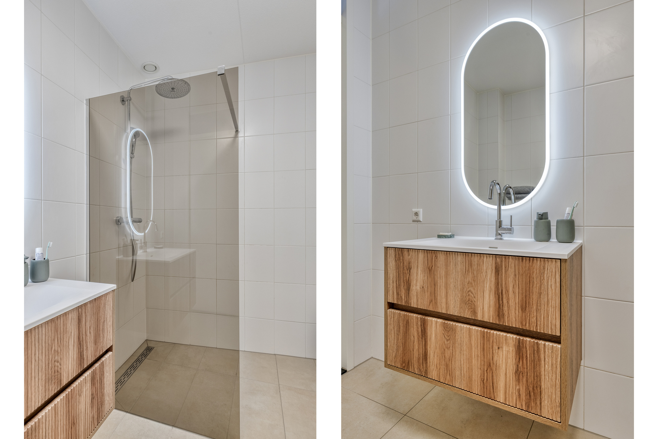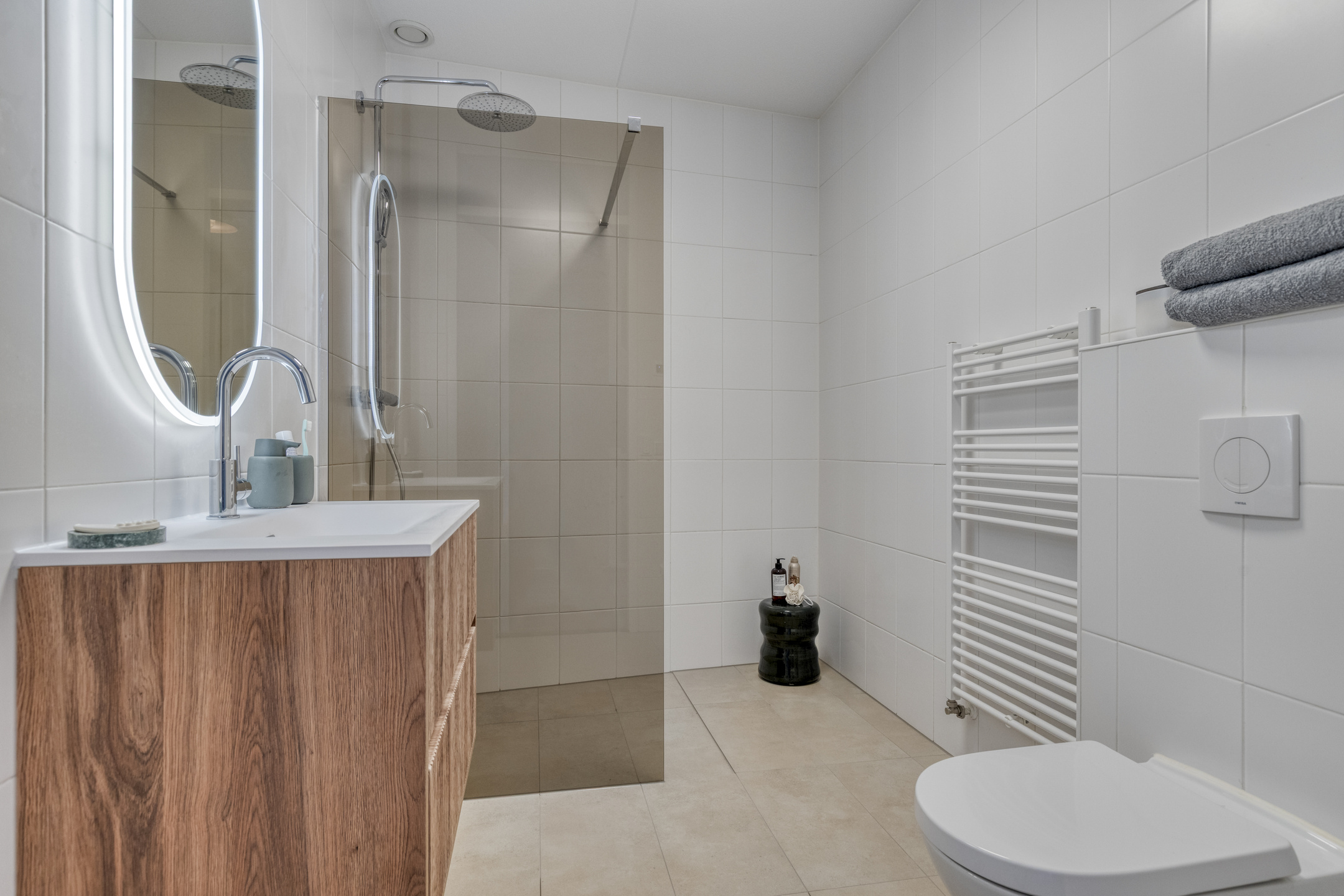 Dankzij het brede woningtype is de overloop royaal. Hier vind je vier volwaardige slaapkamers: twee aan de achterzijde (waaronder de ouderslaapkamer) en twee aan de voorzijde. De recent uitgebreide badkamer voelt fris en modern met beige vloertegels, een strak wastafelmeubel, inloopdouche met fraaie glaswand, vrijhangend toilet en mechanische ventilatie. Een plek om de dag ontspannen te beginnen én af te sluiten.