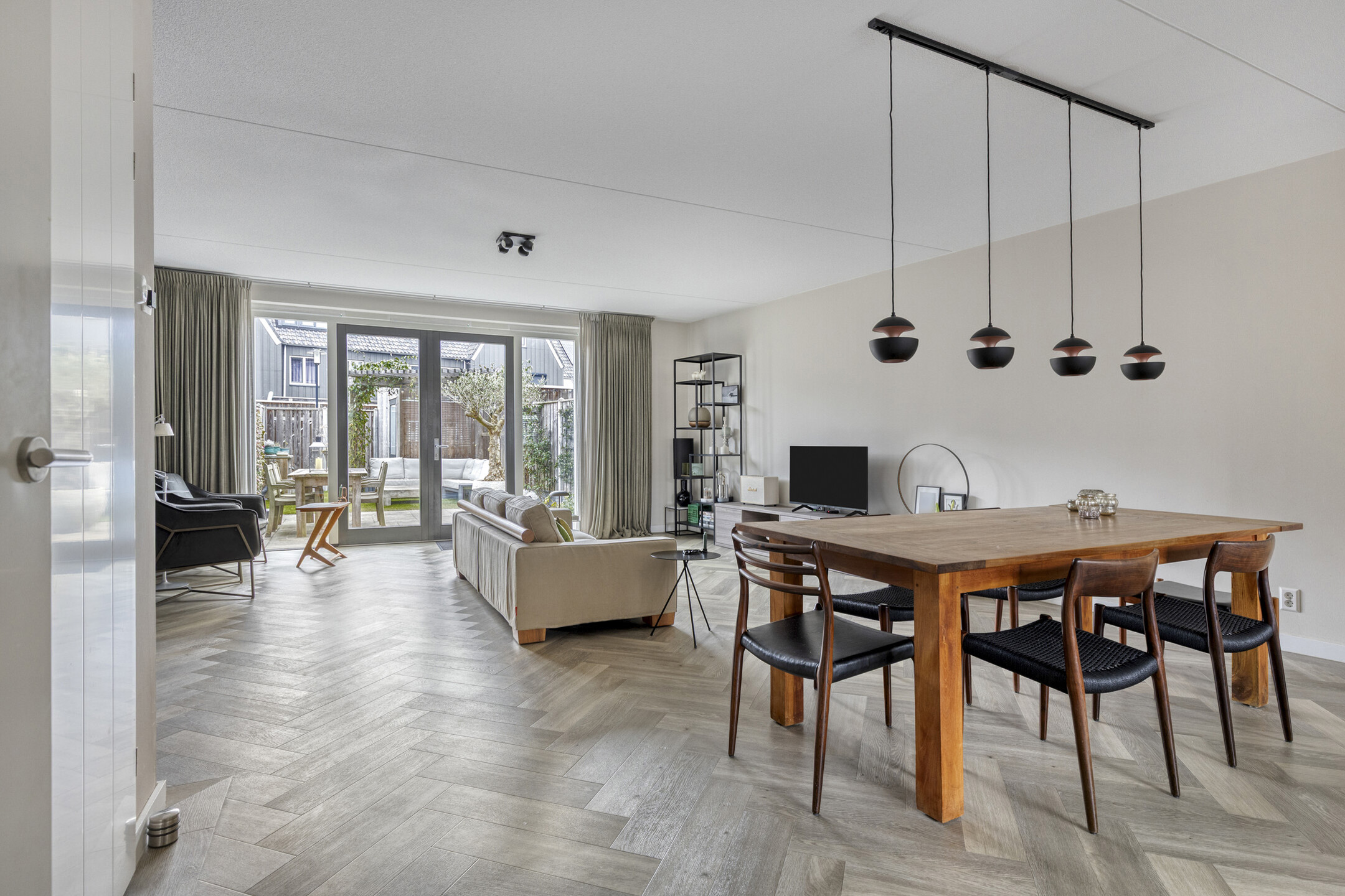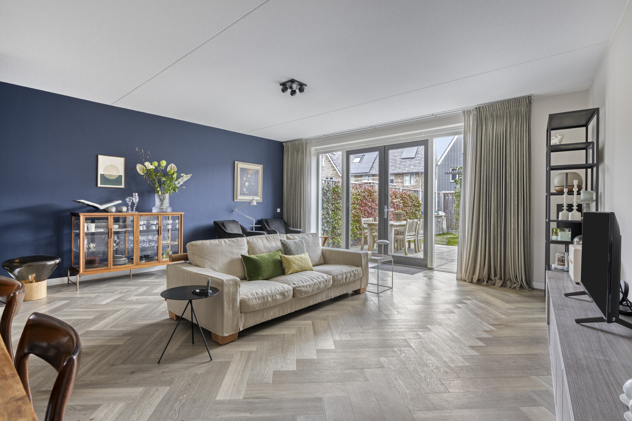 biedt de uitgebouwde woonkamer rust en ruimte en voorziet in openslaande deuren naar de tuin.