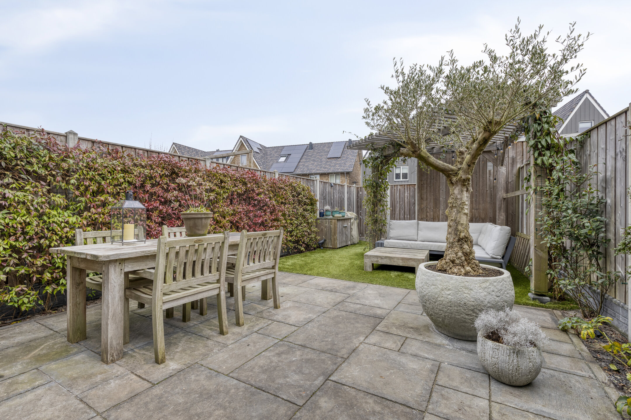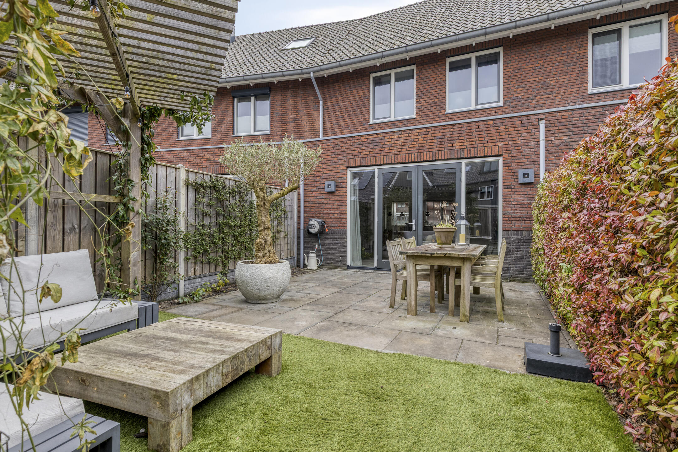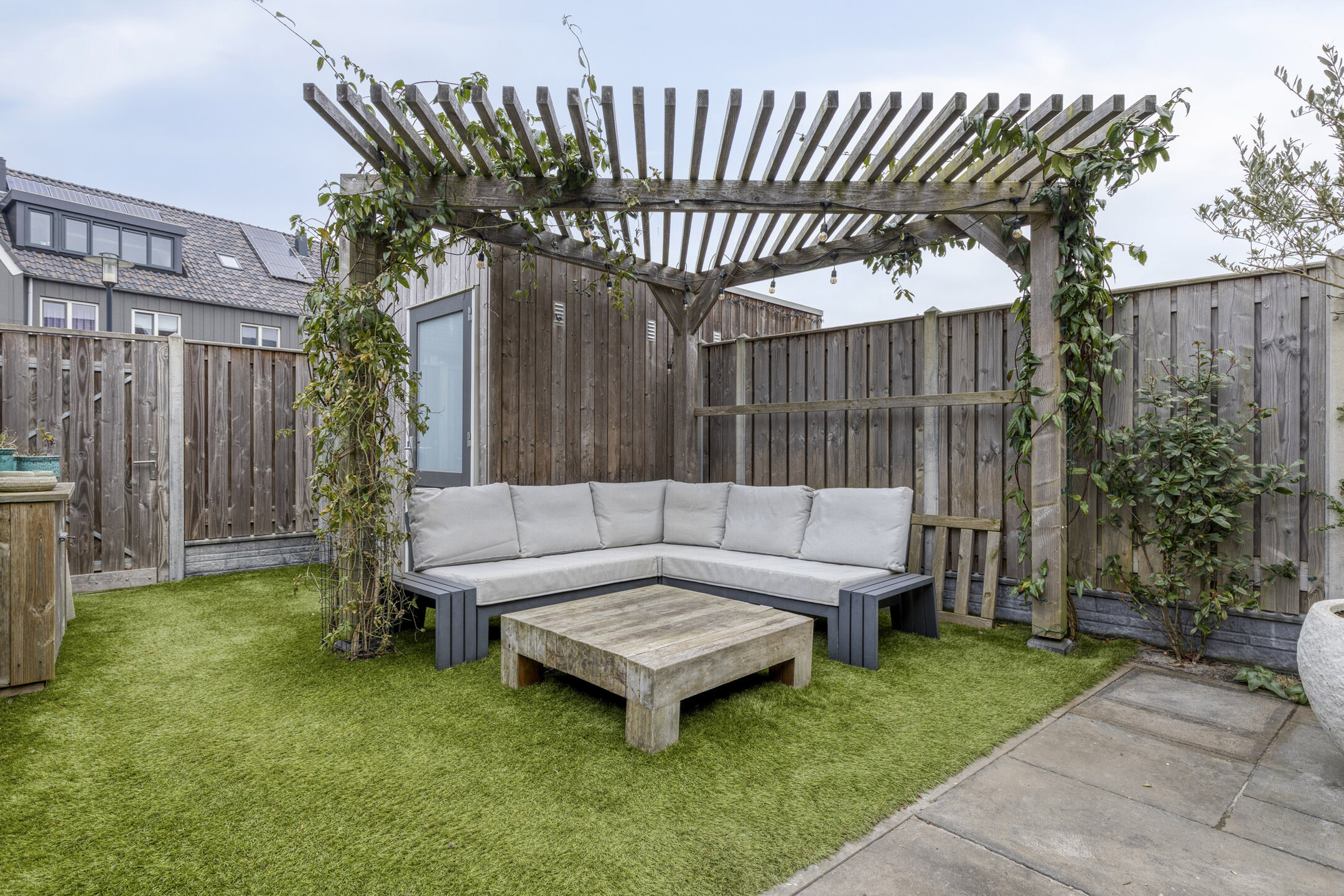 * Sfeervolle achtertuin met pergola, geïmpregneerd houten schuur en achterom