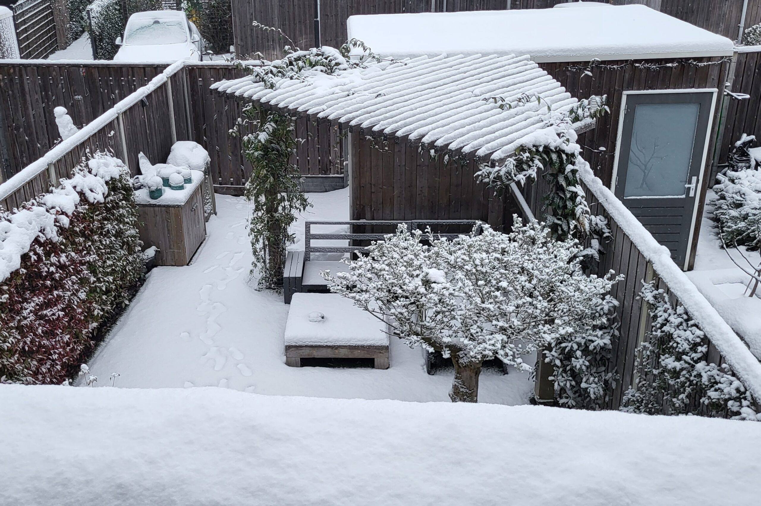 De achtertuin ligt op het noordoosten, is prettig van formaat en is zeer sfeervol ingericht. Denk aan een pergola, een gezellig terras en subtiele tuinverlichting die ’s avonds zacht oplicht. Achterin staat een geïmpregneerd houten schuur met elektra; ideaal voor fietsen of hobby’s. Met een wateraansluiting aan de gevel en een handige achterom is het plaatje compleet.