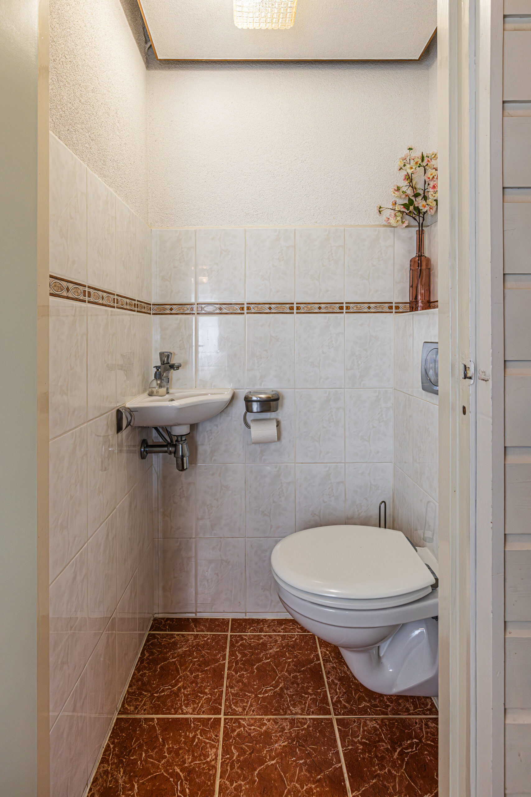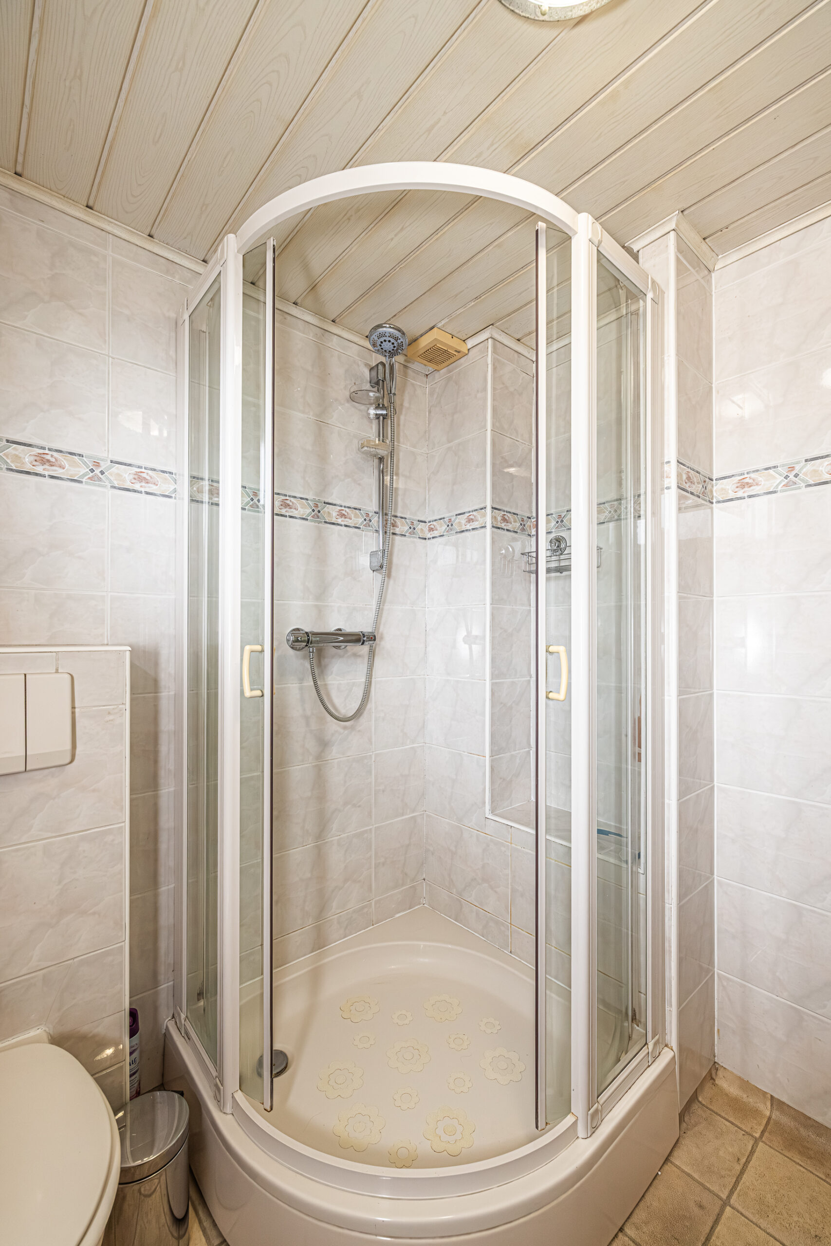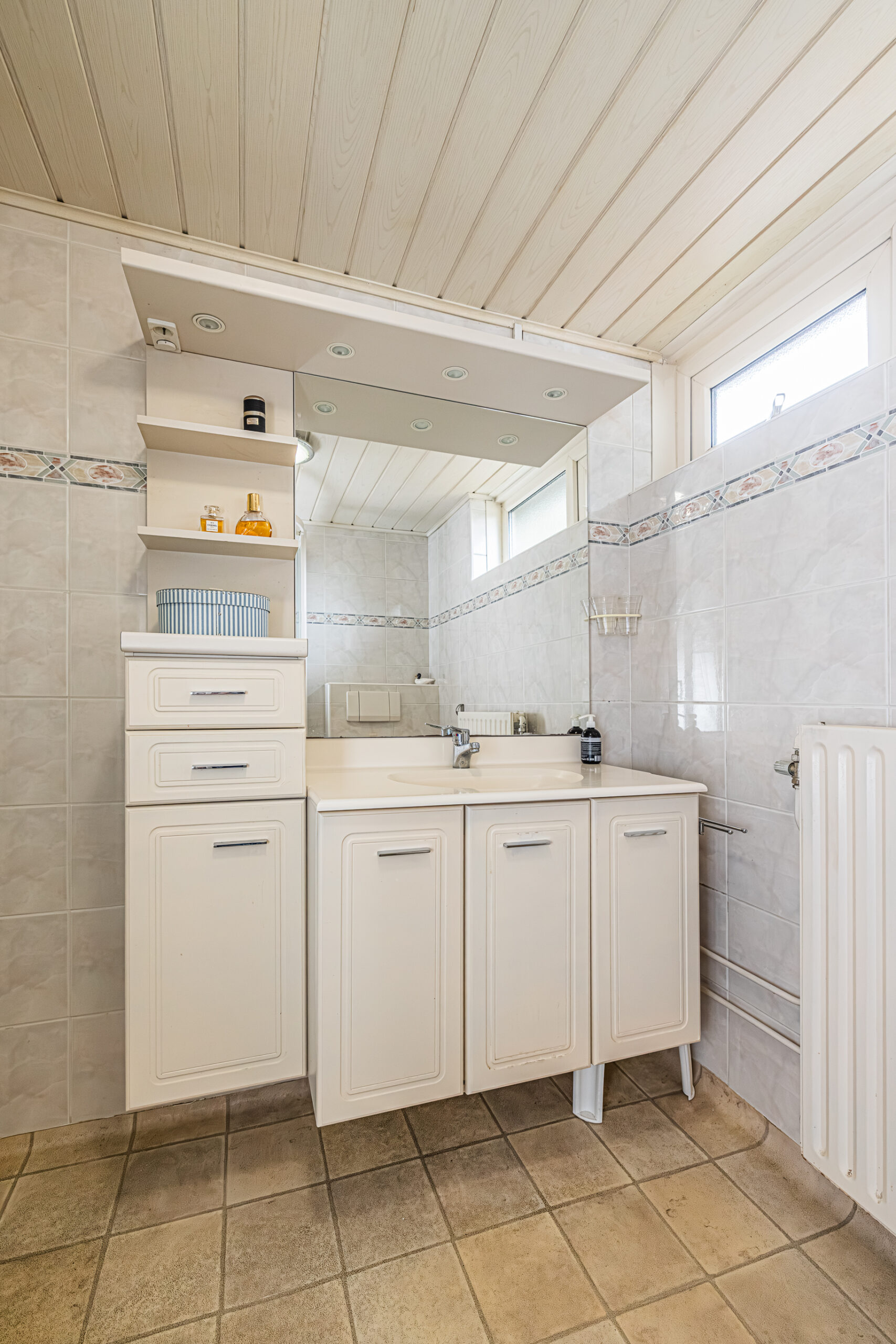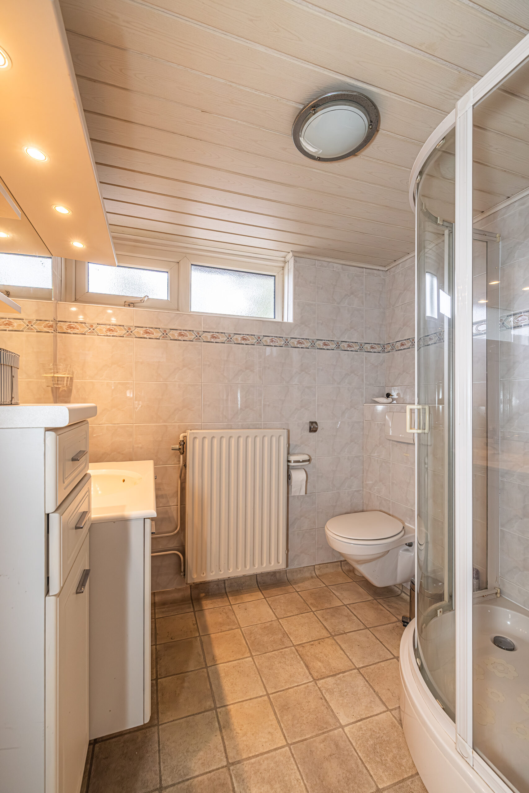 grote badkamer met douchehoek, vaste wastafel met meubel en een 2e toilet met vrijhangend closet. De badkamer is voorzien van wit sanitair, licht tegelwerk, compleet met thermostaatmengkraan.