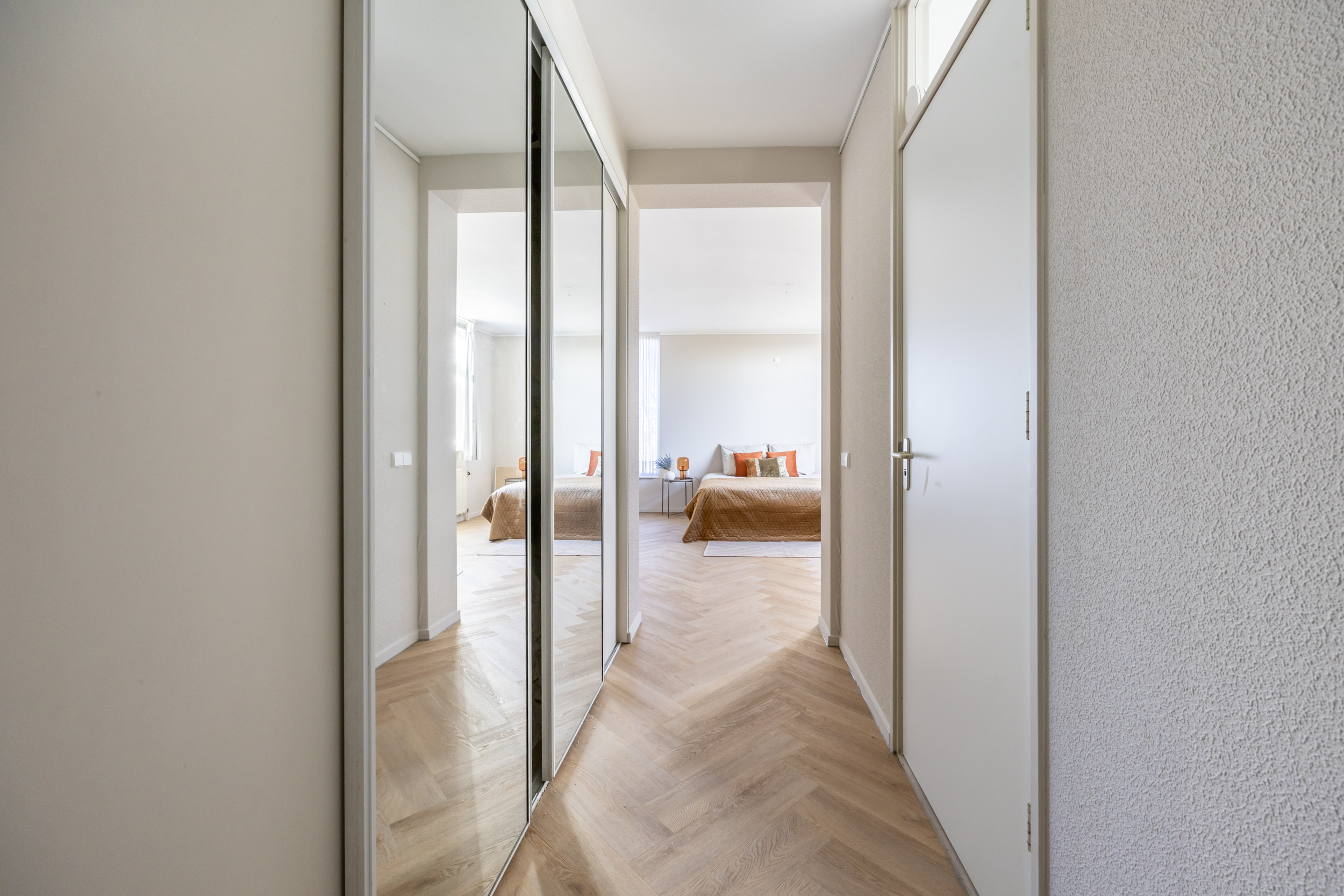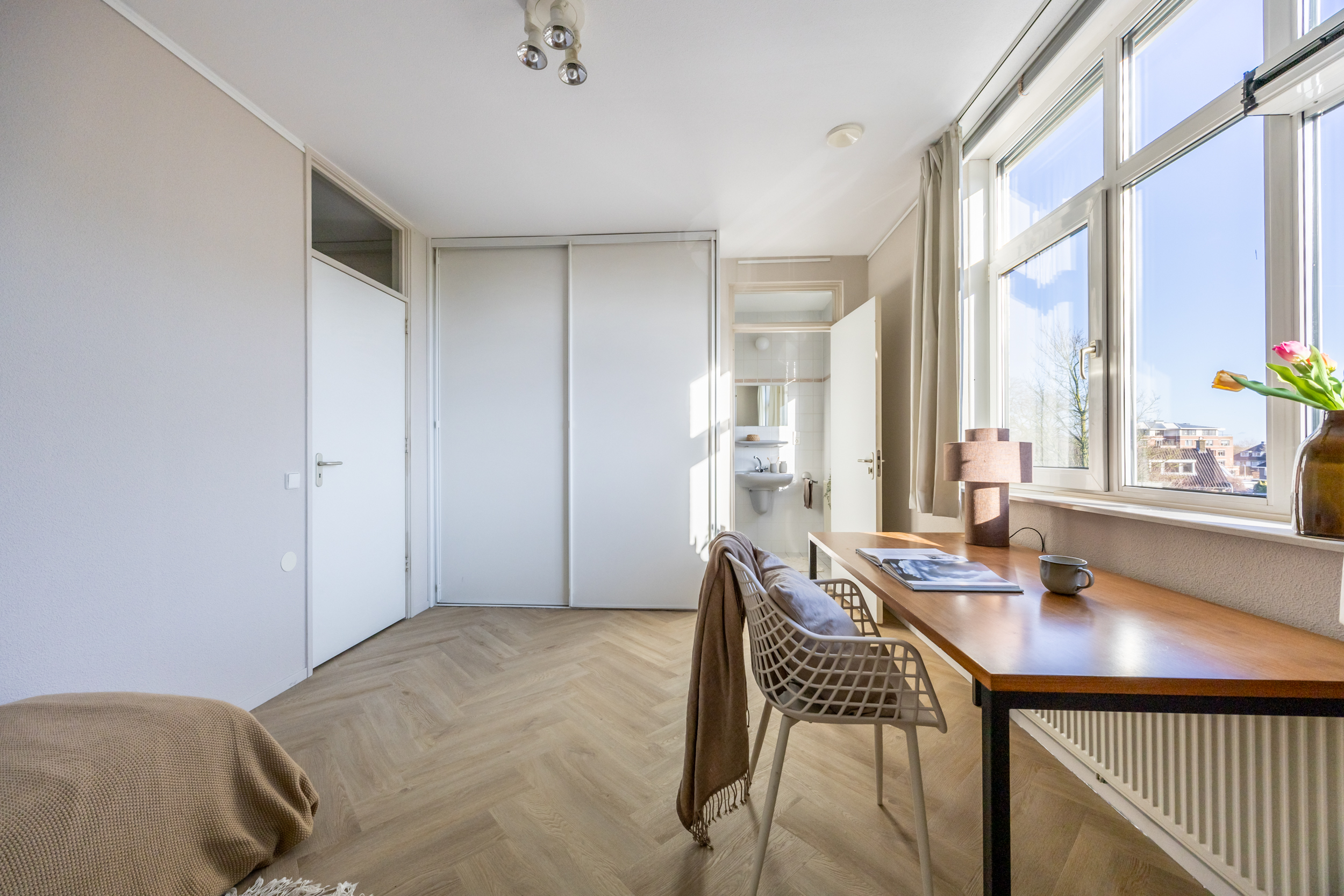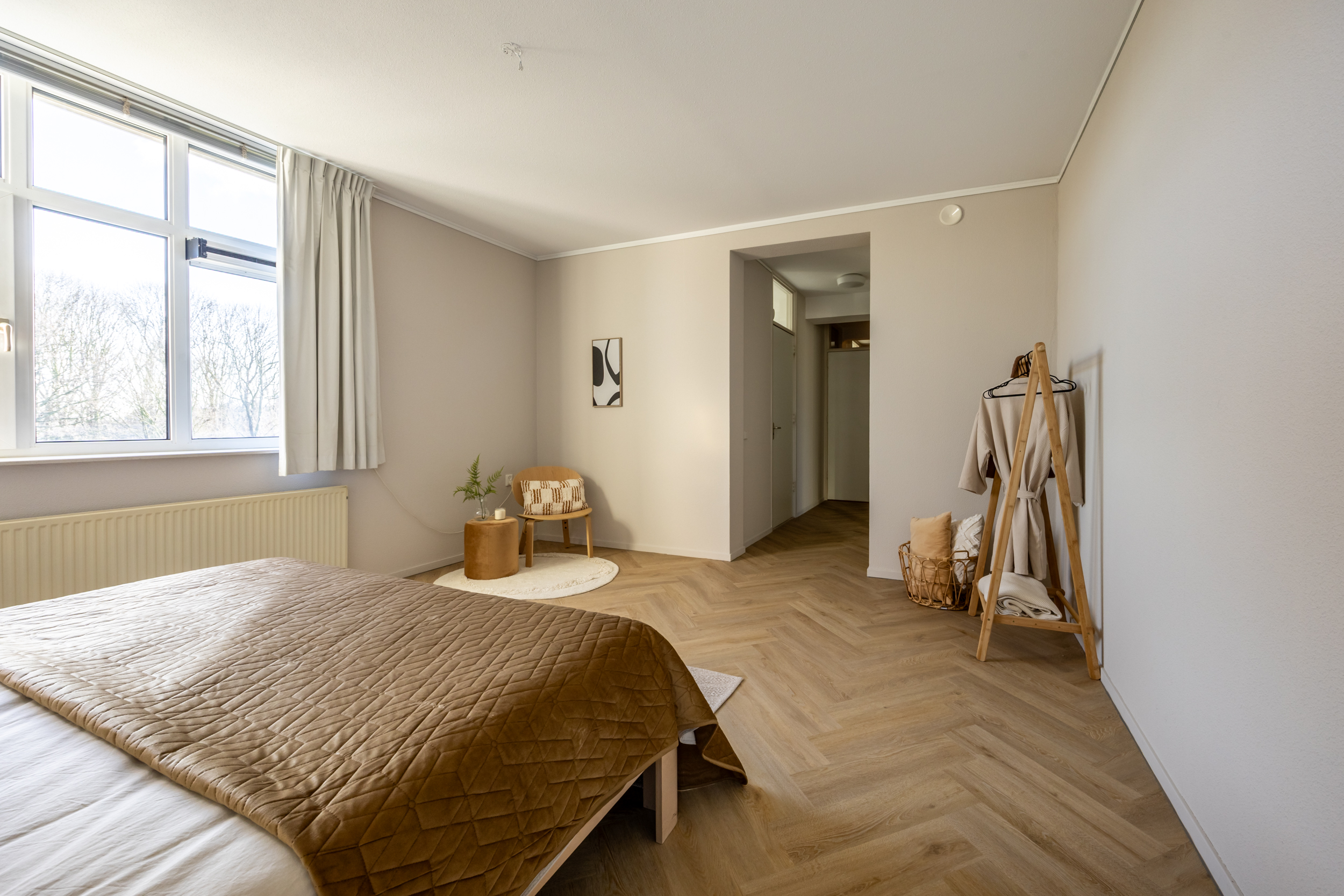 Een doorloop met brede vaste kastenwand en aansluitend de riante 'master' slaapkamer (ca. 27 m2). Vanuit deze slaapkamer een aantrekkelijk weids zicht op het Van Nispenpark.