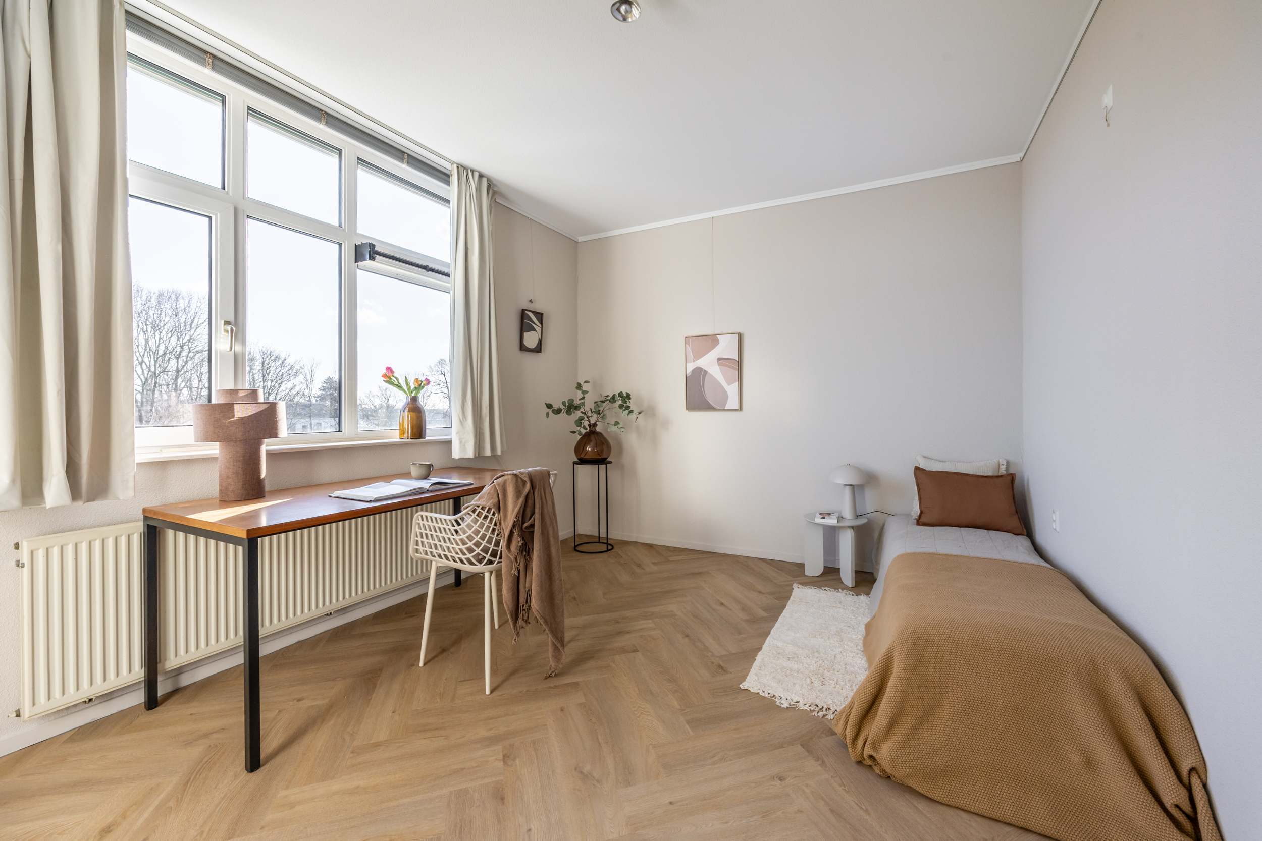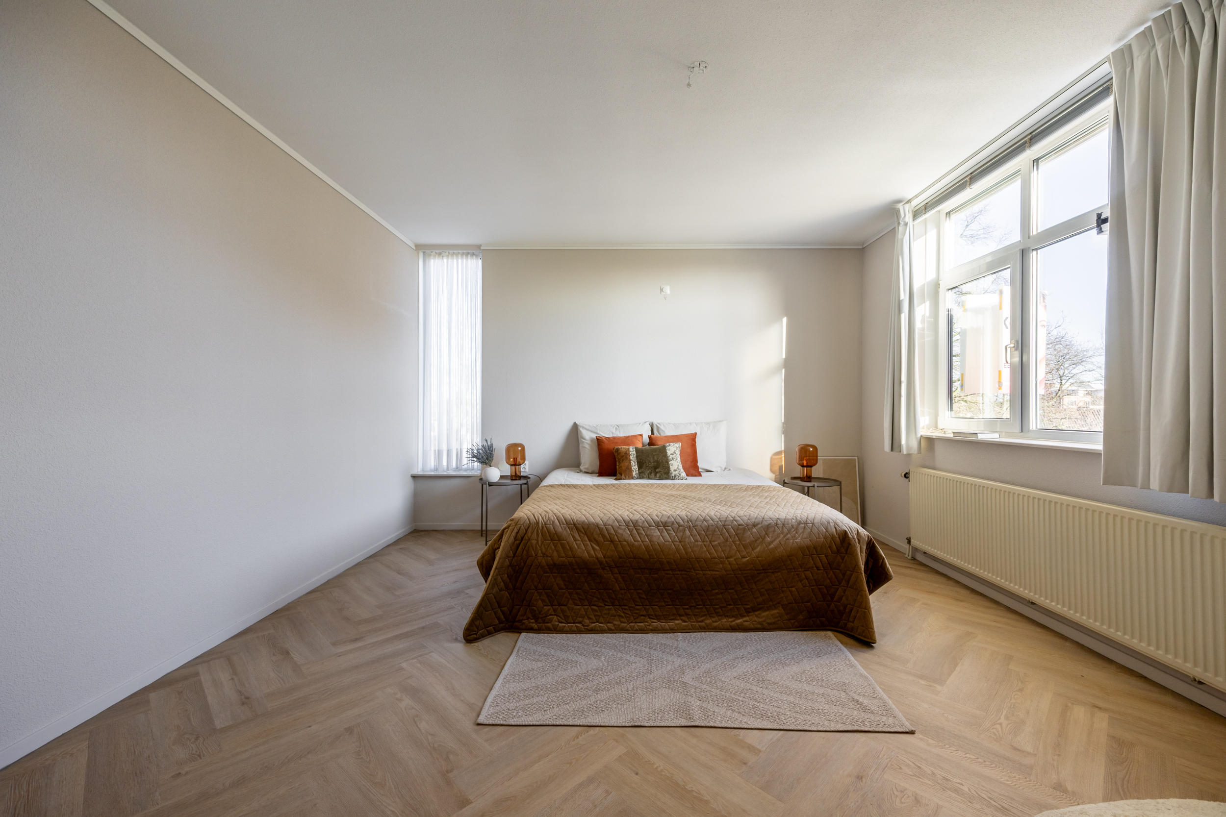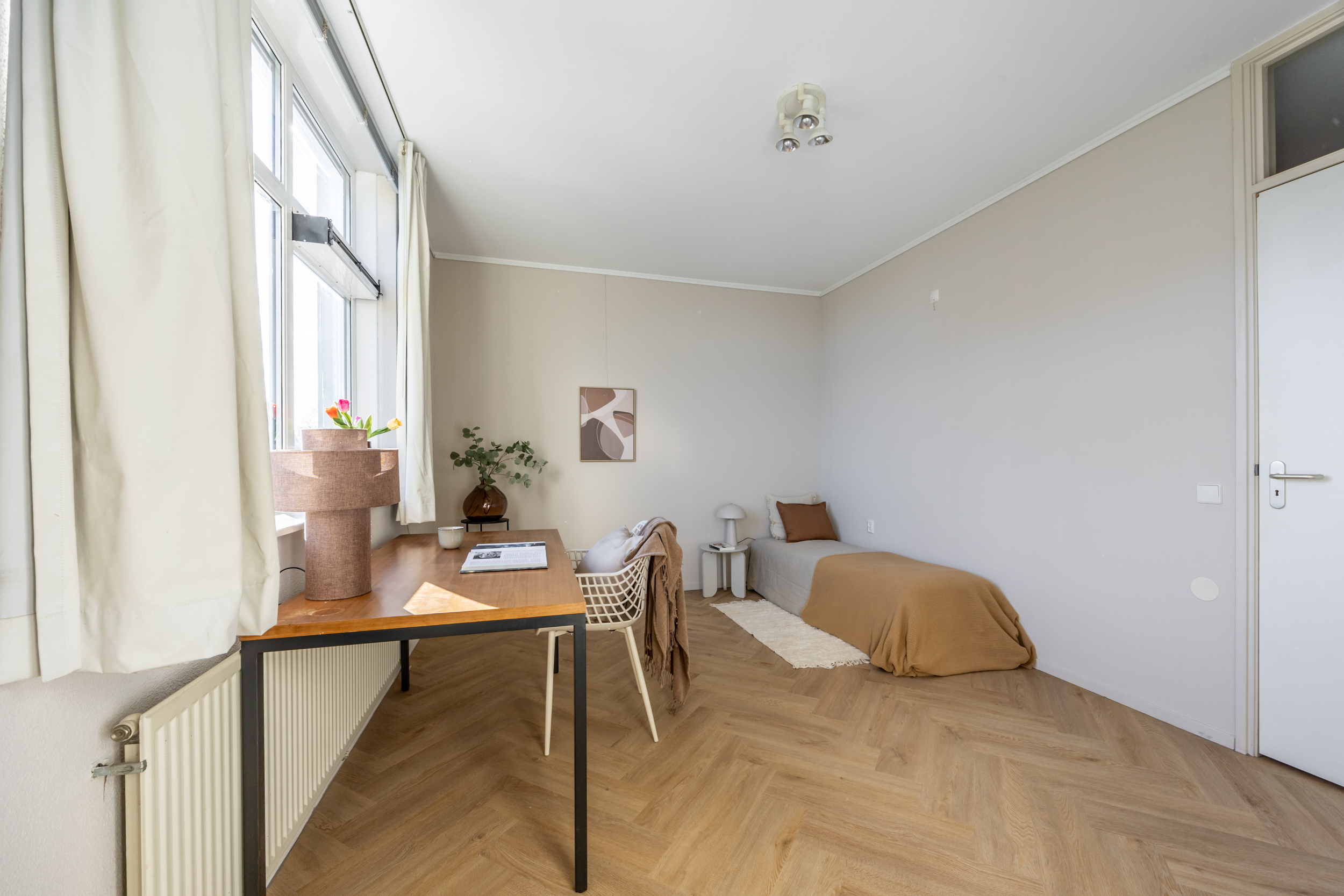 Een doorloop met brede vaste kastenwand en aansluitend de riante 'master' slaapkamer (ca. 27 m2). Vanuit deze slaapkamer een aantrekkelijk weids zicht op het Van Nispenpark.