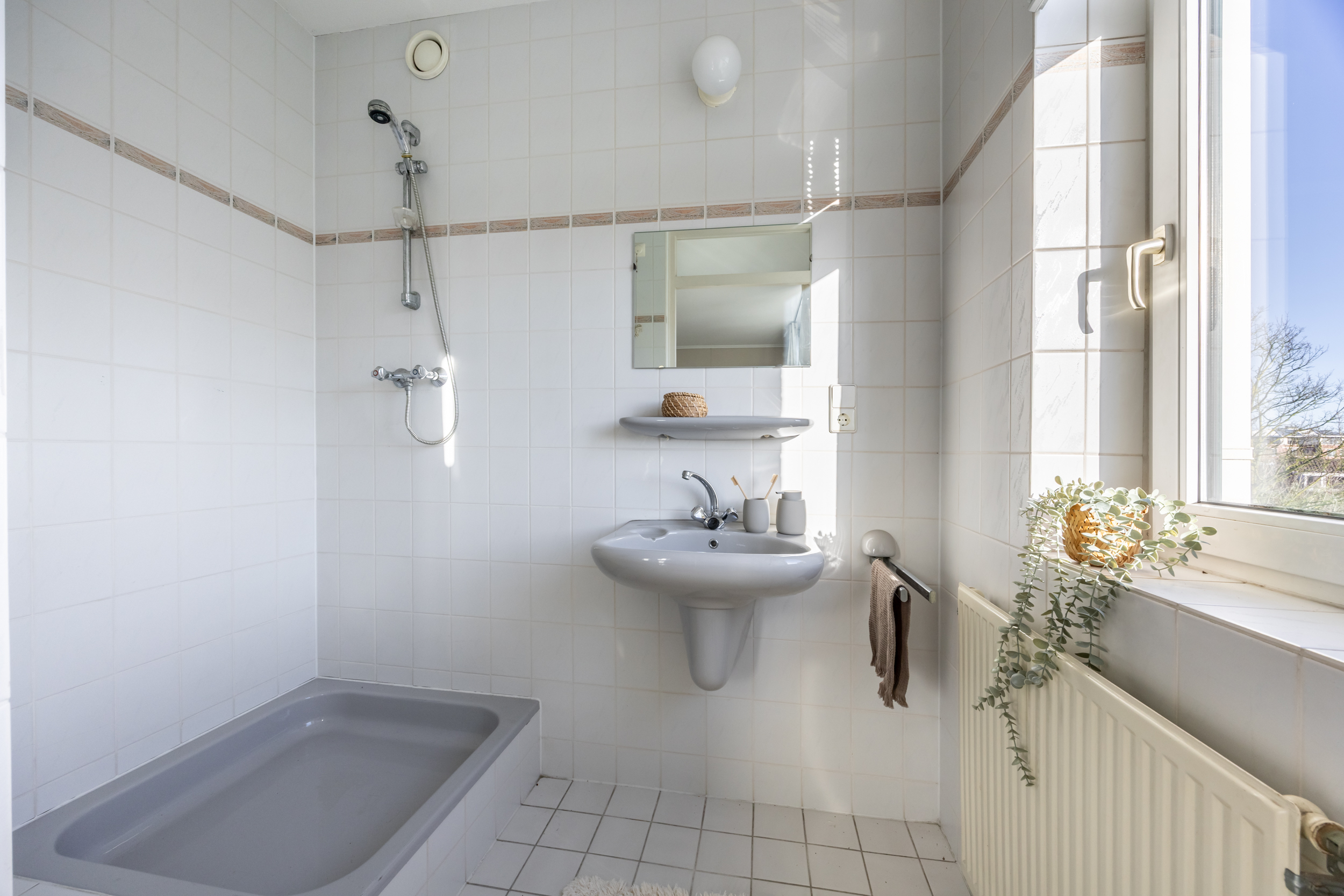 Aansluitend aan deze mooie slaapkamer de ruime en lichte badkamer, uitgevoerd met een kunststof ligbad, royale inloopdouche met zitje, 2 vaste wastafels en een 2e toilet met vrijhangend closet. De badkamer is heerlijk licht door o.a. de ramen die hierin zijn aangebracht. De licht uitgevoerde badkamer is voorzien van wit sanitair en volledig betegeld met een combinatie van licht en antraciet gekleurd tegelwerk, compleet met designradiator en thermostaatmengkraan.